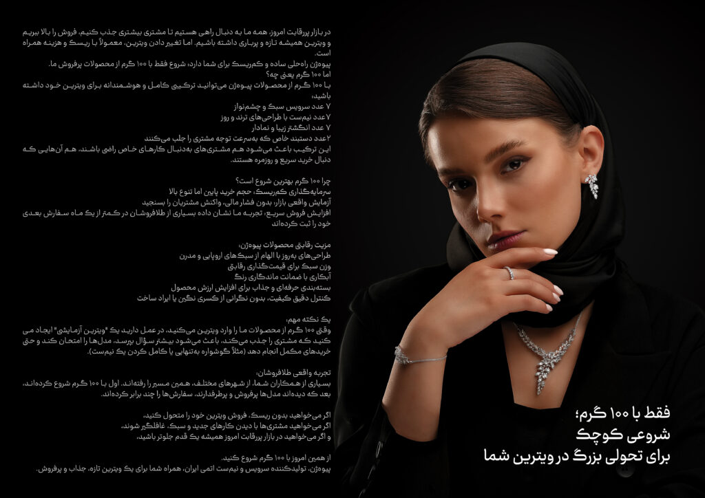 یک نکته مهم: وقتی ۱۰۰ گرم از محصولات ما را وارد ویترین میکنید، در عمل دارید یک “ویترین آزمایشی” ایجاد میکنید که مشتری را جذب میکند، باعث میشود بیشتر سؤال بپرسد، مدلها را امتحان کند و حتی خریدهای مکمل انجام دهد (مثلاً گوشواره بهتنهایی یا کامل کردن یک نیمست). تجربه واقعی طلافروشان: بسیاری از همکاران شما، از شهرهای مختلف، همین مسیر را رفتهاند. اول با ۱۰۰ گرم شروع کردهاند، بعد که دیدهاند مدلها پرفروش و پرطرفدارند، سفارشها را چند برابر کردهاند. اگر میخواهید بدون ریسک، فروش ویترین خود را متحول کنید، اگر میخواهید مشتریها با دیدن کارهای جدید و سبک، غافلگیر شوند، و اگر میخواهید در بازار پررقابت امروز همیشه یک قدم جلوتر باشید، از همین امروز با ۱۰۰ گرم شروع کنید. پیوهژن، تولیدکننده سرویس و نیمست اتمی ایران، همراه شما برای یک ویترین تازه، جذاب و پرفروش.