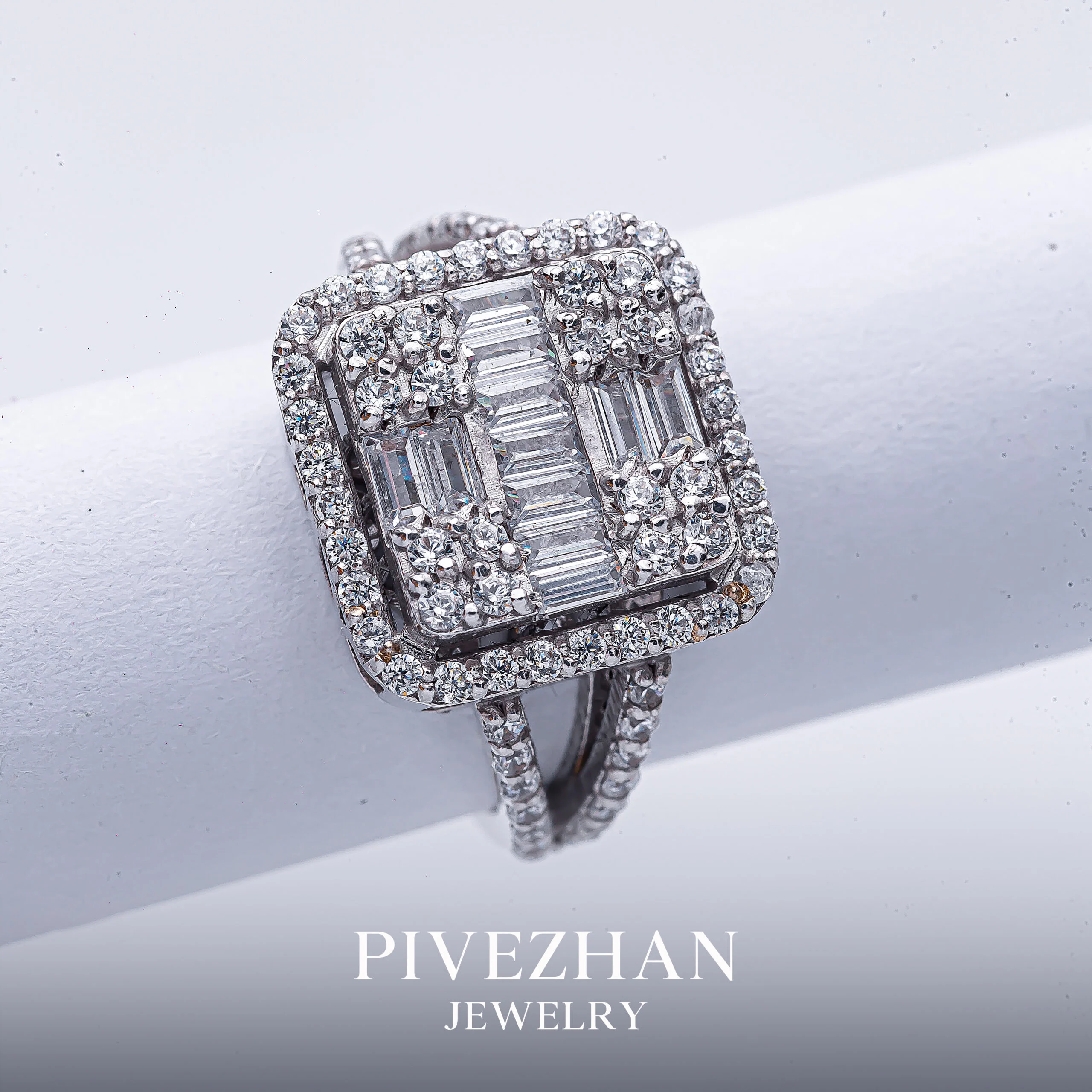 ​این انگشتر بر پایه جواهر خیره‌کننده، با طراحی مربع و خوشه‌ای، تجسمی از زیبایی و شکوه است. نگین‌های اتمی باگت در مرکز، درخشش بی‌نظیری را به نمایش می‌گذارند و توسط نگین‌های اتمی گرد به سبک هاله‌ای احاطه شده‌اند. این ترکیب طراحی، یک درخشش کریستالی و در عین حال درخشندگی سرد و لوکس ایجاد می‌کند که چشم هر بیننده‌ای را به خود خیره می‌کند.