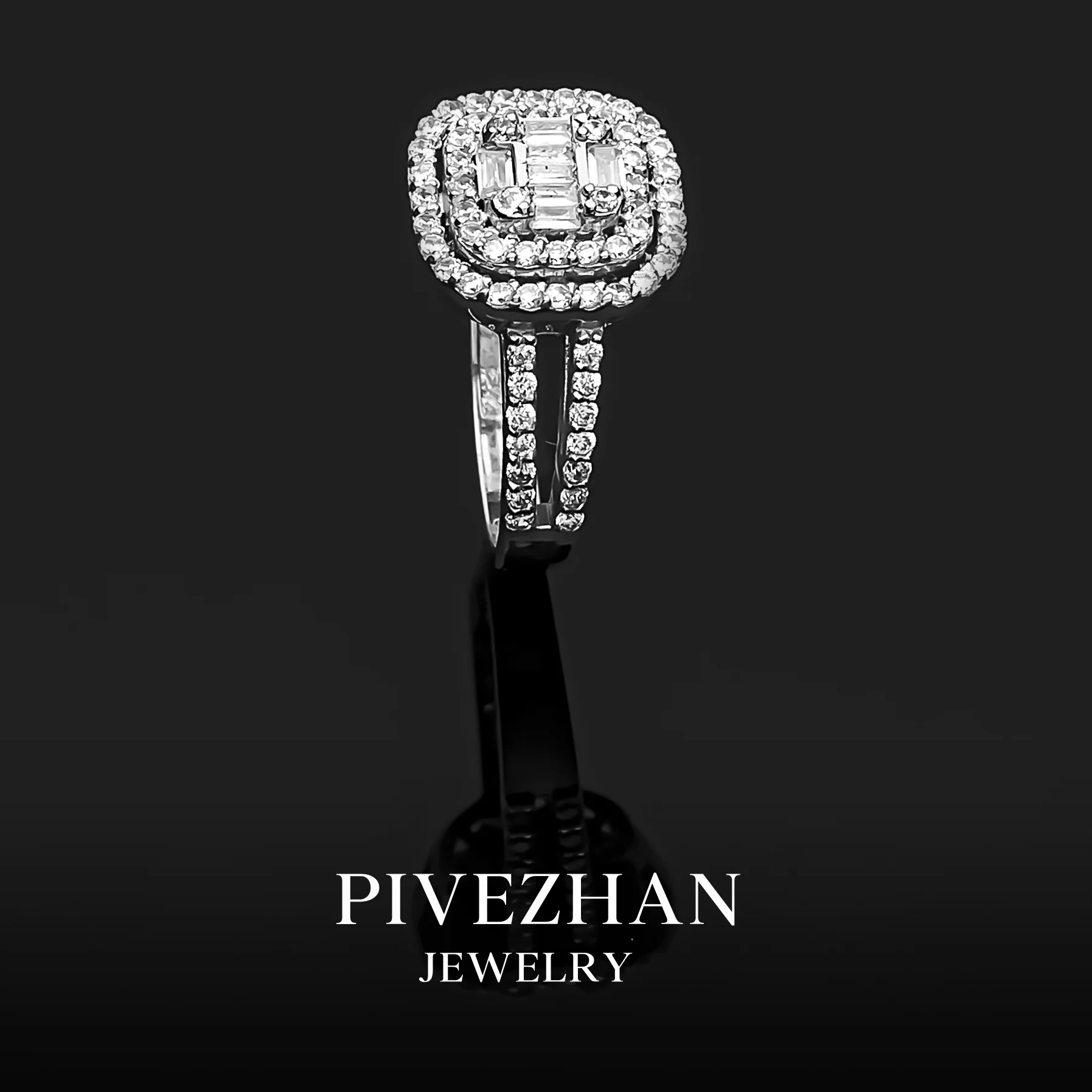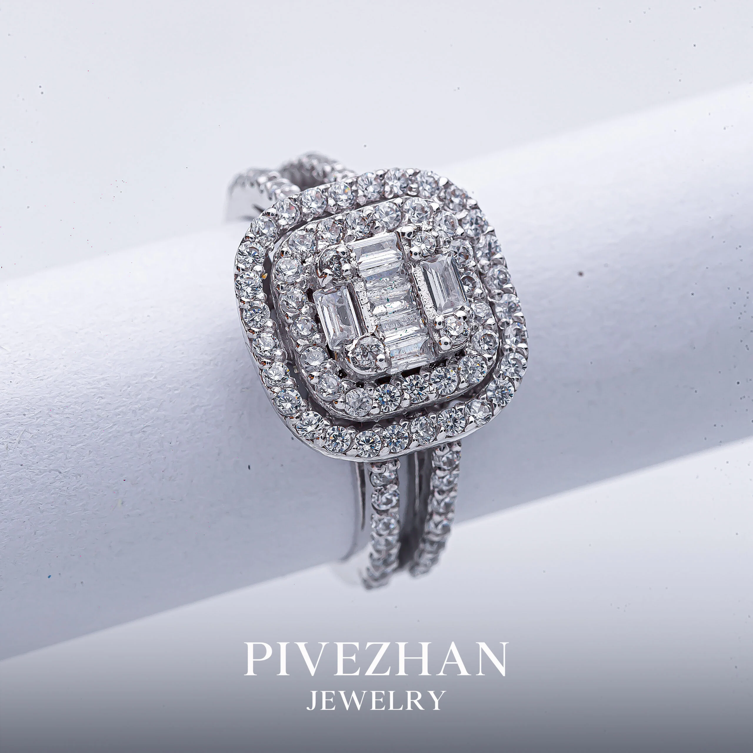این انگشتر بر پایه جواهر یک انتخاب لوکس و شیک برای خانمهایی است که به دنبال زیورآلات منحصر به فرد هستند. این انگشتر مدرن و ظریف با طراحی استادانه و خیرهکننده، هر نگاهی را به خود جذب میکند. درخشش نگین های سفید و چینش خاص آنها در طرح باگت مرکزی، جلوهای بینظیر به این محصول بخشیده است. این انگشتر مجلسی با بافتی ظریف و با شکوه، گزینهای ایدهآل برای تکمیل استایل شما در مراسمهای خاص و مهمانیهاست.طراحی این انگشتر به صورت دو حلقه است که با مهارت و ظرافت به یکدیگر متصل شدهاند و نمادی از وحدت و زیبایی هستند. نگین های بکار رفته در این انگشتر از نوع برش ترکیبی (باگت و گرد) هستند که ترکیب آنها در قاب مربعی شکل، درخشش بینظیری را ایجاد میکند.