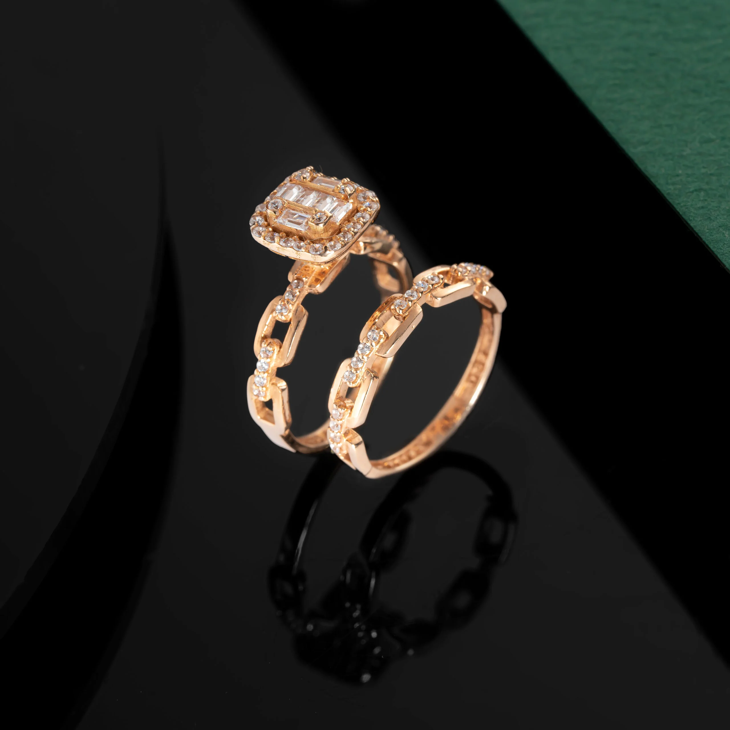 این ست انگشتر زنجیری زیبا بر پایه جواهر، ترکیبی منحصربهفرد از هنر طراحی و درخشش خیرهکننده است. این حلقه دوبل با طرح مدرن و مینیمال خود، یک انتخاب ایدهآل برای خانمهای خوشسلیقه است که به دنبال زیورآلات لاکچری و خاص میگردند. استفاده از طلای زرد در کنار نگین اتمی درخشان، حسی از گرما و شکوه را منتقل میکند. این انگشتر ست، چه به تنهایی و چه به عنوان بخشی از یک استایل کامل، در هر لحظه نگاهها را به خود خیره میکند.