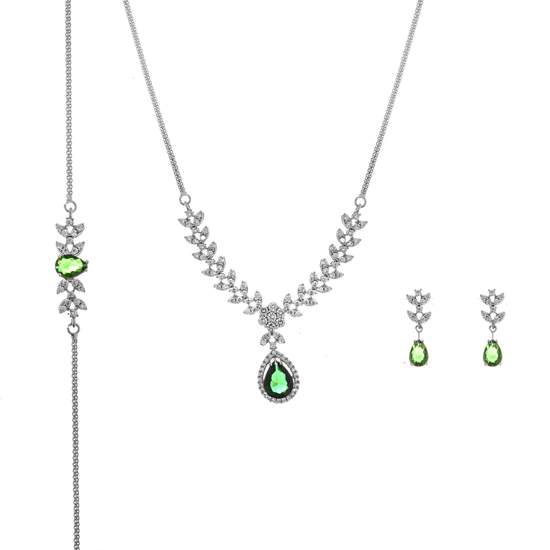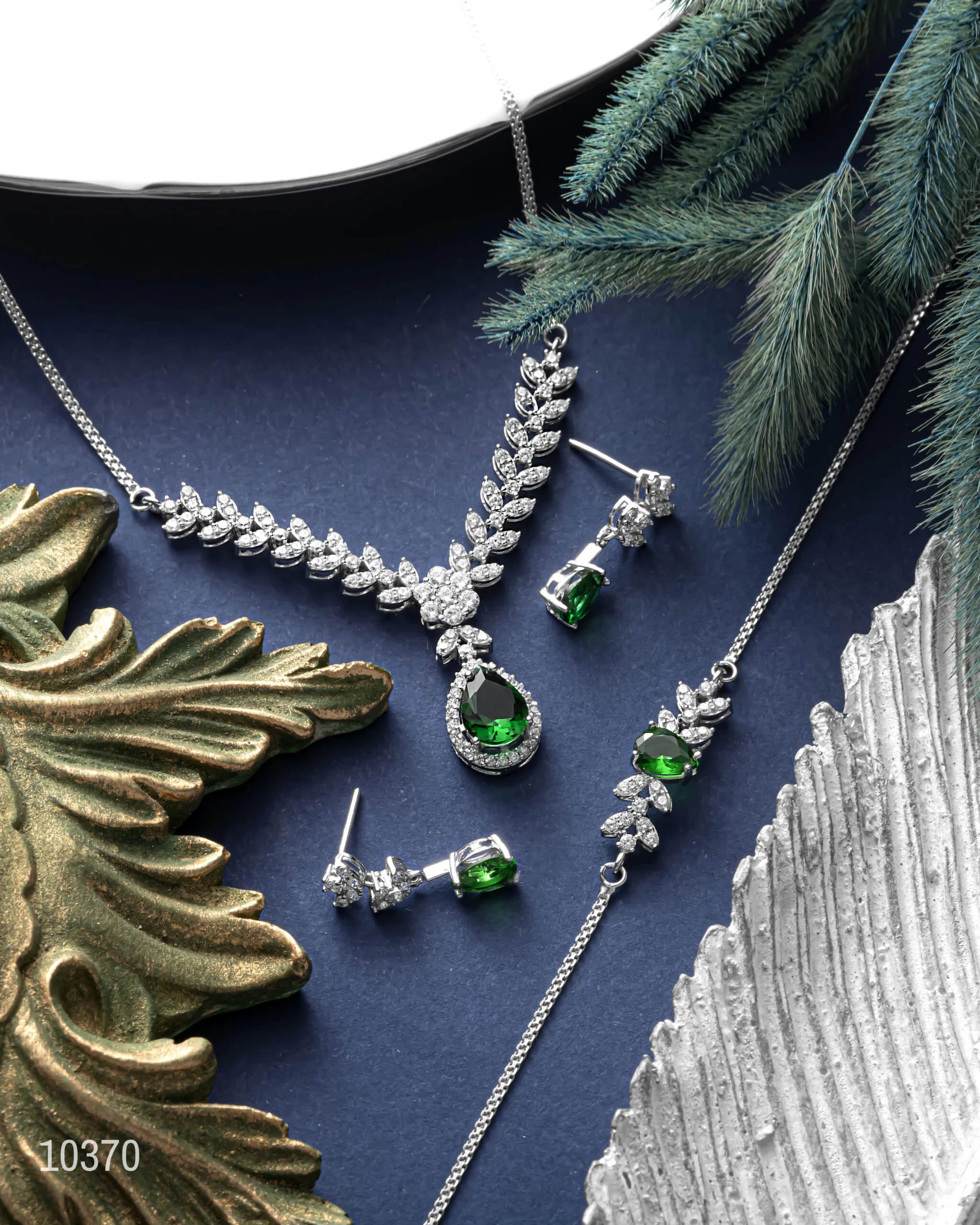 این سرویس کامل بر پایه جواهر زنانه، یک انتخاب بینظیر برای کسانی است که به دنبال زیورآلات مدرن و درخشان هستند. این سرویس مجلسی شیک و لاکچری، با طراحی هنرمندانه و ظرافت بیبدیل، درخشش بینظیری به استایل شما میبخشد و به عنوان هدیه تولد و سالگرد، انتخابی ایدهآل و ماندگار است. این ست شامل یک گردنبند، دستبند و گوشواره است که همگی با سنگهای زیبای زمرد و نگینهای کریستالی تزئین شدهاند.