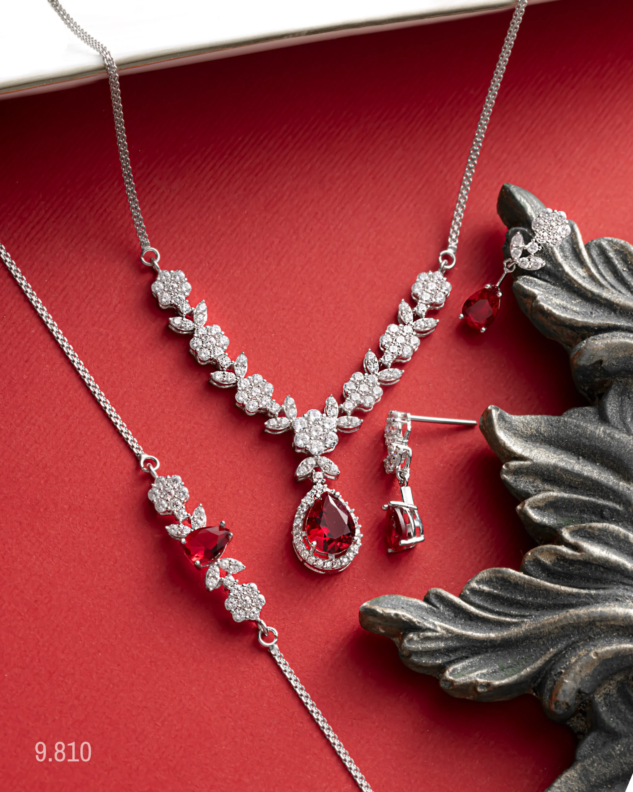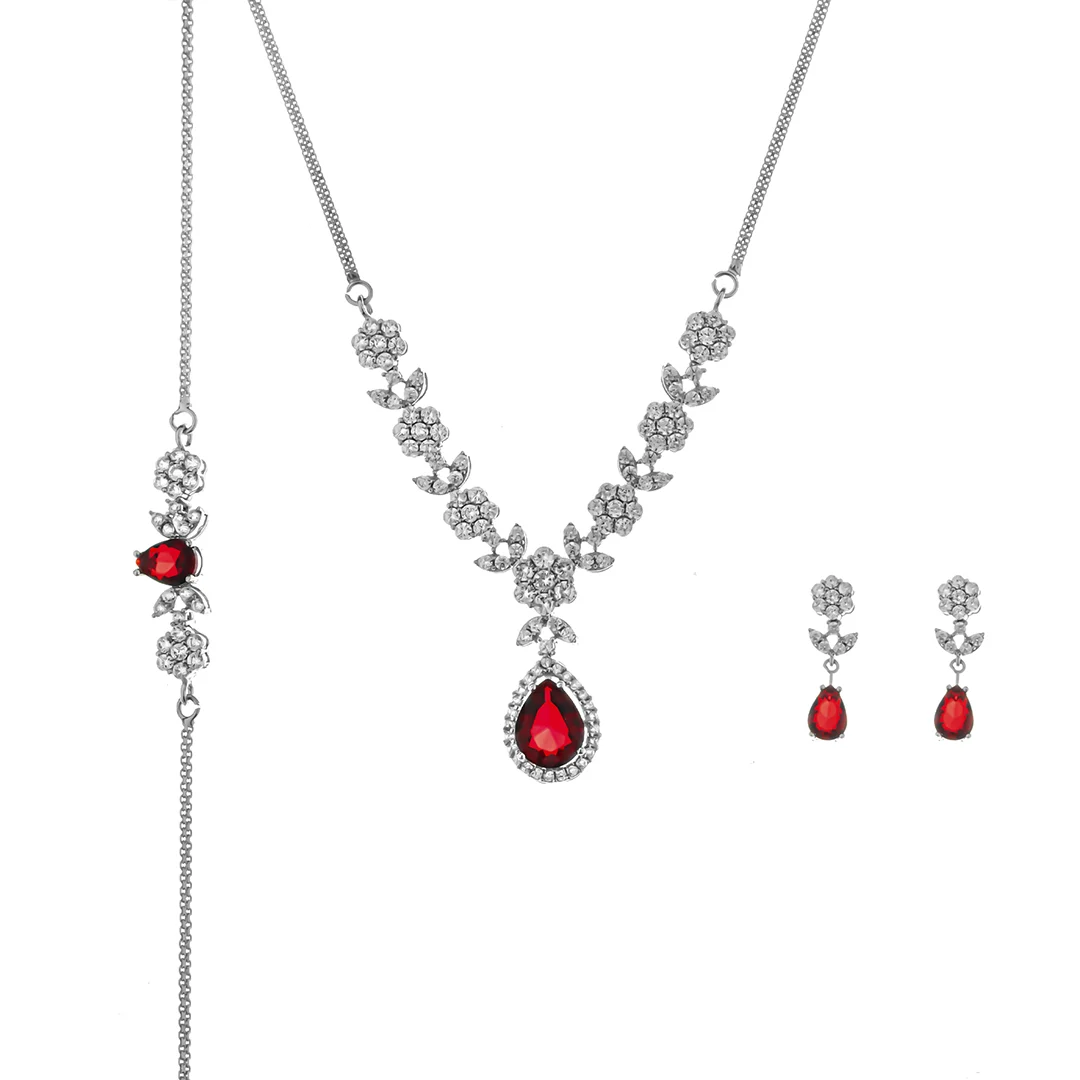 این ست بر پایه جواهرات سنگ قرمز، نمادی از عشق و زیبایی است که با ظرافت و دقت فراوان طراحی شده است. گردنبند با سنگهای قرمز، شامل یک آویز خیرهکننده با سنگ قرمز برش اشکی است که در میان نگینهای اتمی درخشان قرار گرفته است. طراحی جواهرات گلدار با نگین اتمی درخشان در این سرویس، حسی از لطافت و شکوه را به استایل شما میافزاید.این سرویس کامل، شامل یک دستبند کریستال قرمز و گوشواره آویز با یاقوت است که به زیبایی با گردنبند هماهنگ شدهاند. این سرویس نشاندهنده ظرافت و راحتی آن است، که برای استفاده روزانه و مجالس خاص مناسب است. این جواهرات مناسب هدیه سالگرد و ایدهای برای جواهرات روز ولنتاین هستند.