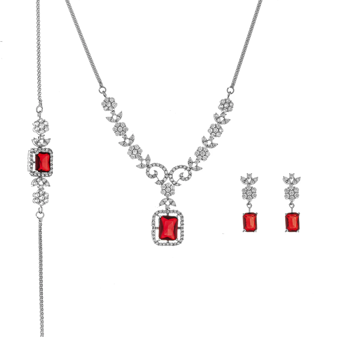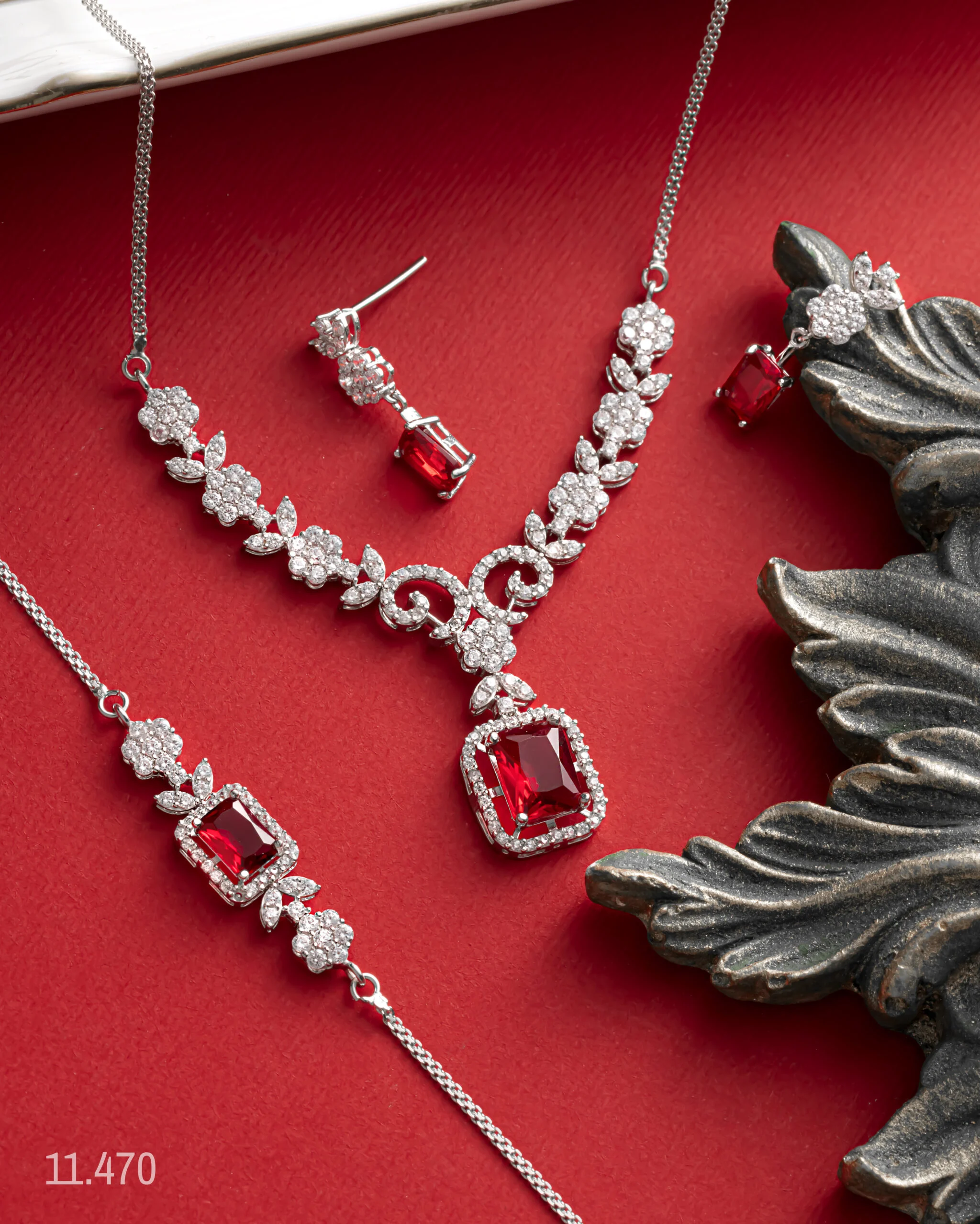 ​این سرویس بر پایه جواهر با سنگ قرمز یاقوتی، نمادی از زیبایی و شکوه است که نگاه‌ها را خیره می‌کند. این ست کامل و چشم‌نواز که شامل گردنبند، گوشواره و دستبند است، با طراحی ظریف و مدرن خود، انتخابی ایده‌آل برای مجالس رسمی، مهمانی‌ها و حتی به عنوان سرویس عروس شیک با نگین قرمز به شمار می‌رود. مرکز توجه این ست، گردنبند نگین درشت مربع با سنگ یاقوت قرمز مصنوعی است که با نگین‌های اتمی درخشان در اطراف آن، جلوه‌ای سلطنتی ایجاد می‌کند. طرح گل و برگ‌های ظریف در دو طرف گردنبند و دستبند، زیبایی این مجموعه را دوچندان کرده و حس طبیعت را القا می‌کند.دستبند و گوشواره آویز کوتاه با سنگ قرمز مربعی، طراحی هماهنگ خود را با گردنبند حفظ کرده و یک ست کامل  را تشکیل می‌دهند.