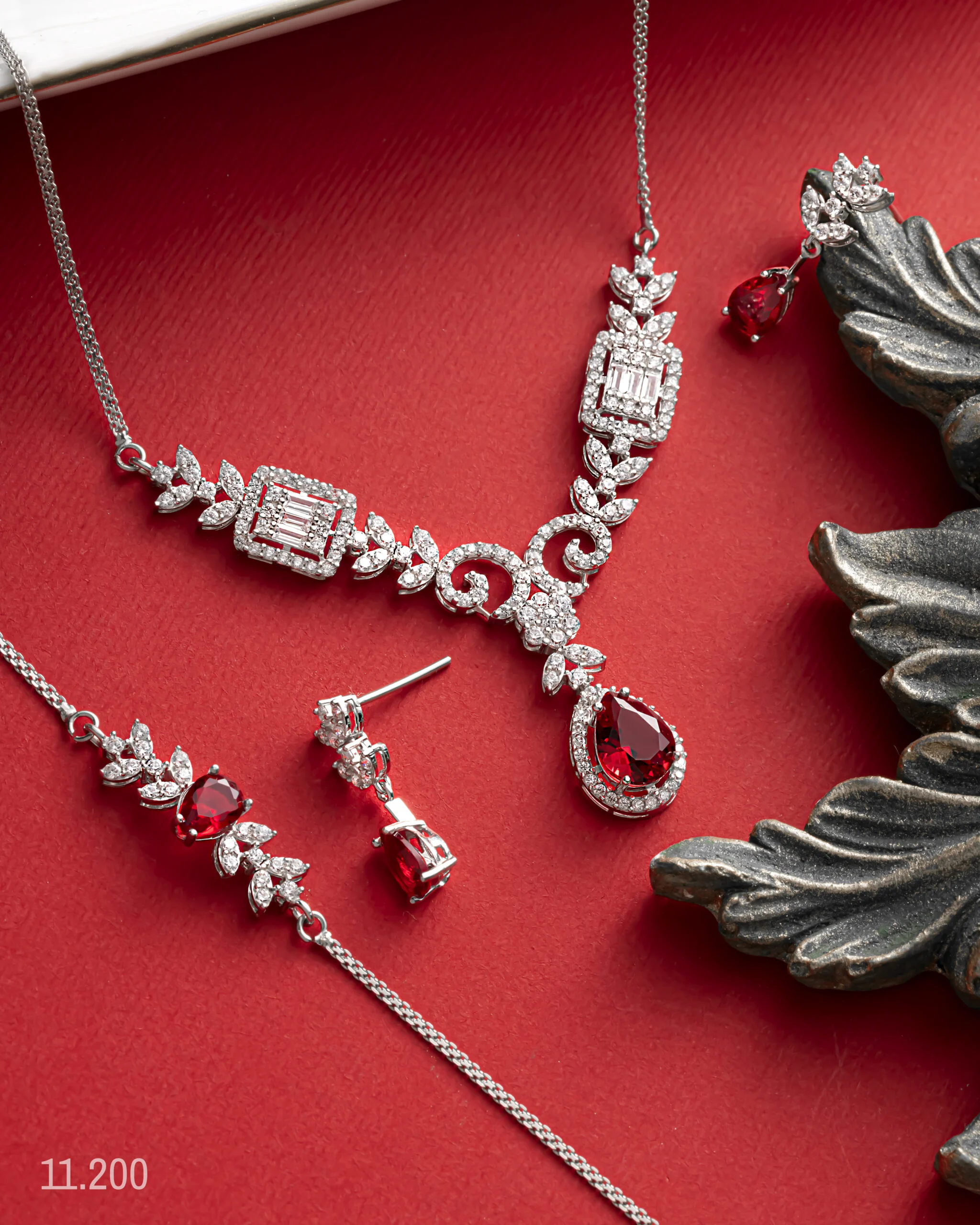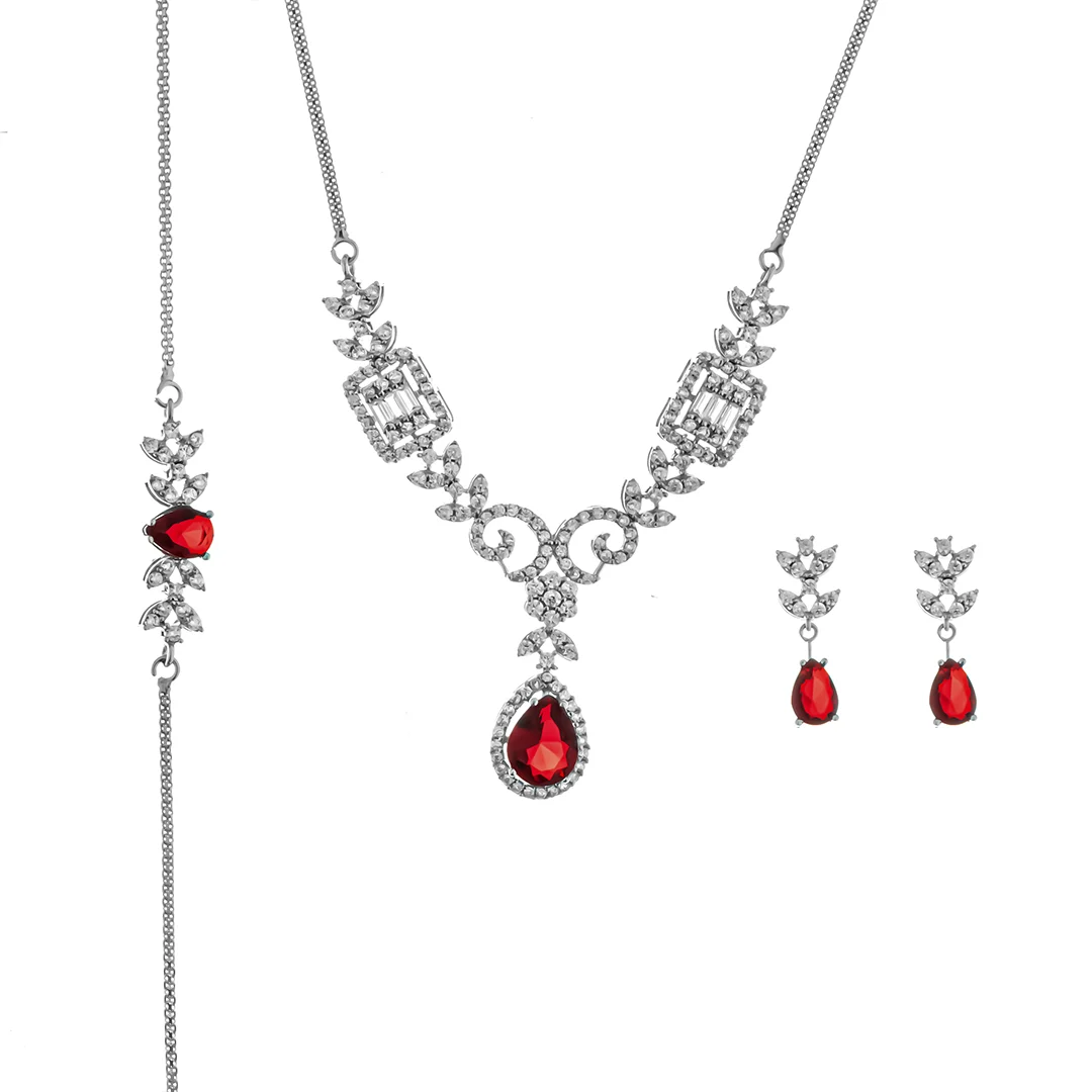 این ست بر پایه جواهرات لوکس، نمادی از ظرافت و شکوه است که با سنگهای یاقوت قرمز مصنوعی با برش اشکی و برش مستطیل تزئین شده است. سنگهای قرمز درشت و خوشتراش، جلوهای خاص به گردنبند و گوشواره بخشیدهاند. سرویس بر پایه جواهرات گلدار با نگین اتمی درخشان و طرح برگ، حس طبیعت را به این مجموعه اضافه کرده و در کنار درخشش نگینهای اتمی درخشان ، هارمونی زیبایی ایجاد کردهاند.گردنبند با سنگهای قرمز و طرح برگ، به گونهای طراحی شده که روی گردن به زیبایی مینشیند. گوشواره آویز با یاقوت، با طراحی هماهنگ خود، تکمیلکننده ظاهر شماست. دستبند کریستال قرمز و طرح برگ، آخرین قطعه این مجموعه است که به مچ دست شما جلوهای شاهانه میبخشد.
