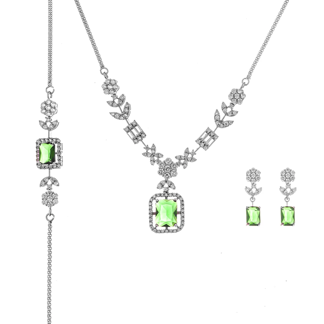 این سرویس کامل بر پایه جواهر زنانه، یک انتخاب خیرهکننده برای خانمهایی است که به دنبال زیورآلات مدرن و درخشان هستند. این سرویس مجلسی شیک و لاکچری با طراحی هنرمندانه خود، درخشش بینظیری به استایل شما میبخشد و انتخابی ایدهآل به عنوان هدیه تولد و سالگرد است. این ست کامل شامل یک گردنبند، دستبند و گوشواره است که همگی با نگینهای زیبای زمرد و نگین کریستال اتمی تزئین شدهاند.