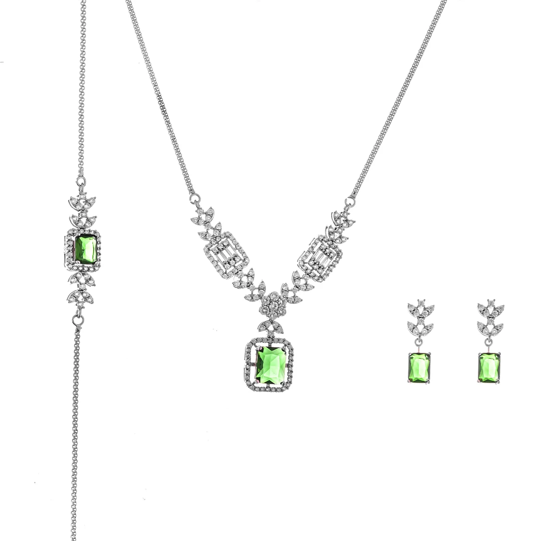 این سرویس کامل بر پایه جواهر زنانه، یک انتخاب خیرهکننده برای کسانی است که به دنبال زیورآلات مدرن و درخشان هستند. این سرویس مجلسی شیک و لاکچری، با طراحی هنرمندانه خود، درخشش بینظیری به استایل شما میبخشد و انتخابی ایدهآل به عنوان هدیه تولد و سالگرد است. این ست کامل شامل یک گردنبند، دستبند، و گوشواره است که همگی با سنگهای زیبای سبز زمردی و نگینهای کریستالی اتمی تزئین شدهاند.