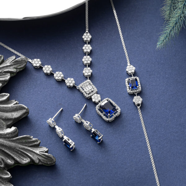 این سرویس کامل بر پایه جواهر با نگینهای اتمی درخشان، مجموعهای بینظیر از ظرافت و درخشش است که برای خانمهای باسلیقه طراحی شده. این زیورآلات مدرن و شیک، جلوهای از زیبایی و اصالت را به هر استایلی میبخشند. این ست جواهر لوکس و لاکچری شامل یک گردنبند، دستبند و گوشواره است که با هماهنگی کامل، ظاهری خیرهکننده ایجاد میکنند. این سرویس انتخابی ایدهآل به عنوان هدیه تولد و سالگرد برای خانمها است.