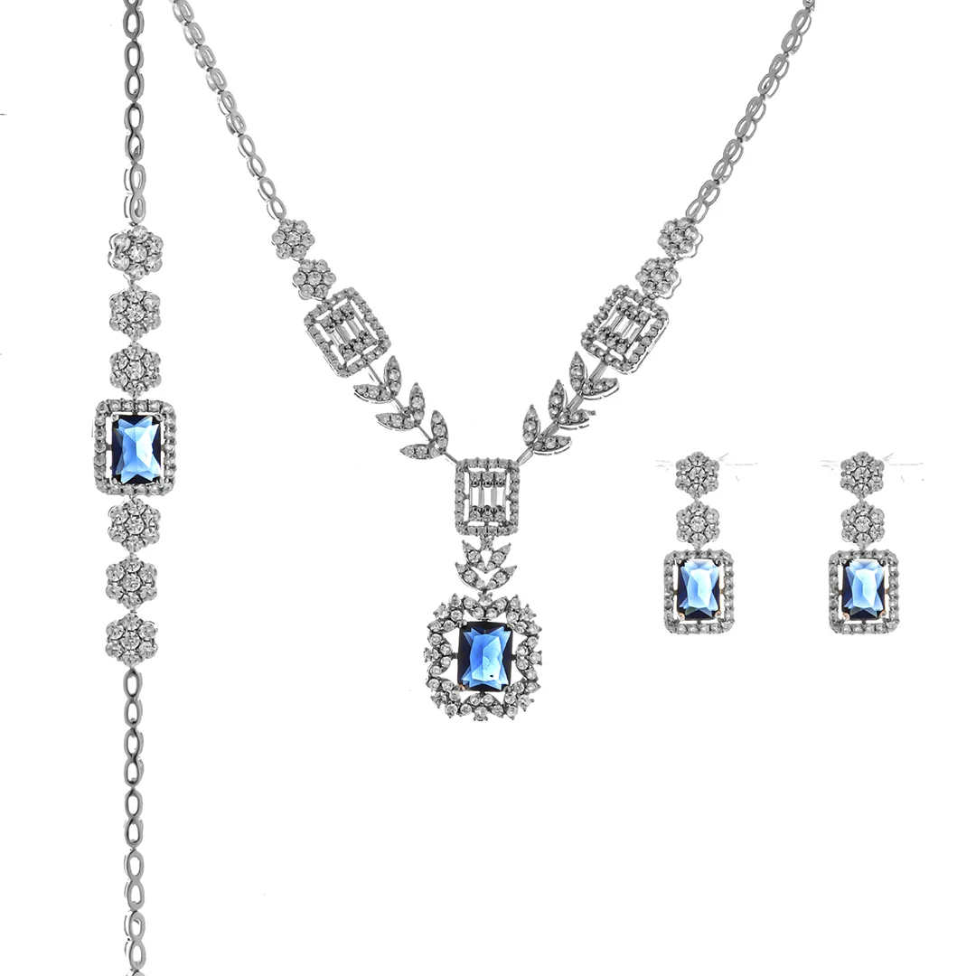 این سرویس کامل بر پایه جواهر زنانه، یک انتخاب بینظیر برای خانمهایی است که به دنبال زیورآلات مدرن و درخشان هستند. این ست با طراحی خیرهکننده و ظرافت بیبدیل، جلوهای از شکوه و اصالت را به استایل شما اضافه میکند و به عنوان هدیه تولد و سالگرد، انتخابی ارزشمند و ماندگار است. این سرویس مجلسی شیک و لاکچری، شامل یک گردنبند، دستبند و گوشواره است که همگی با سنگهای یاقوت کبود و نگینهای کریستالی تزئین شدهاند.