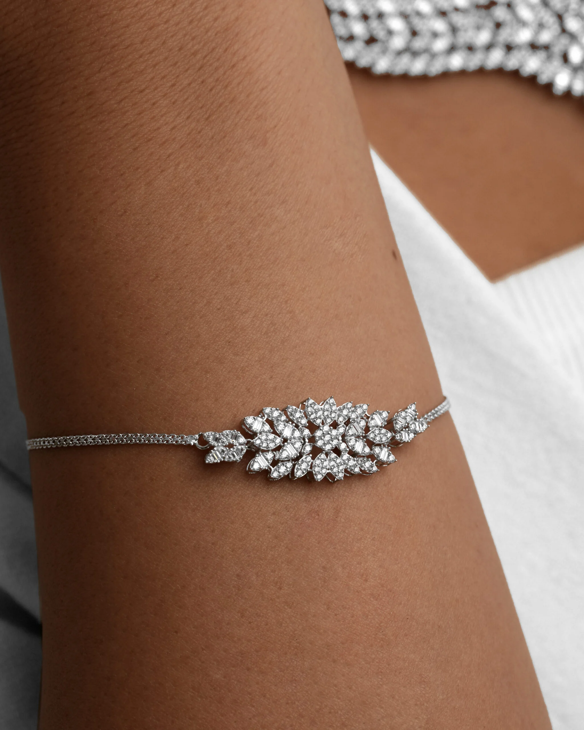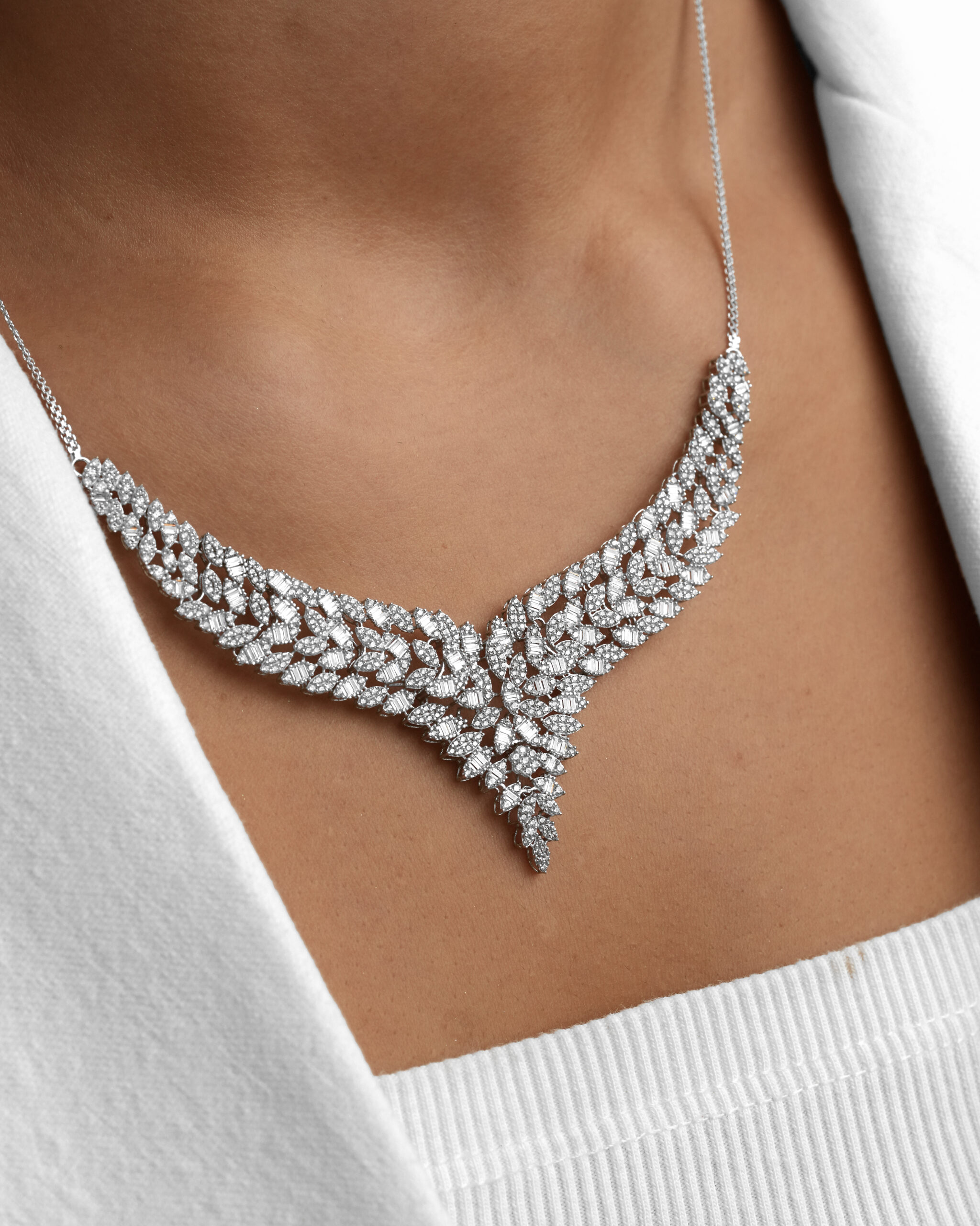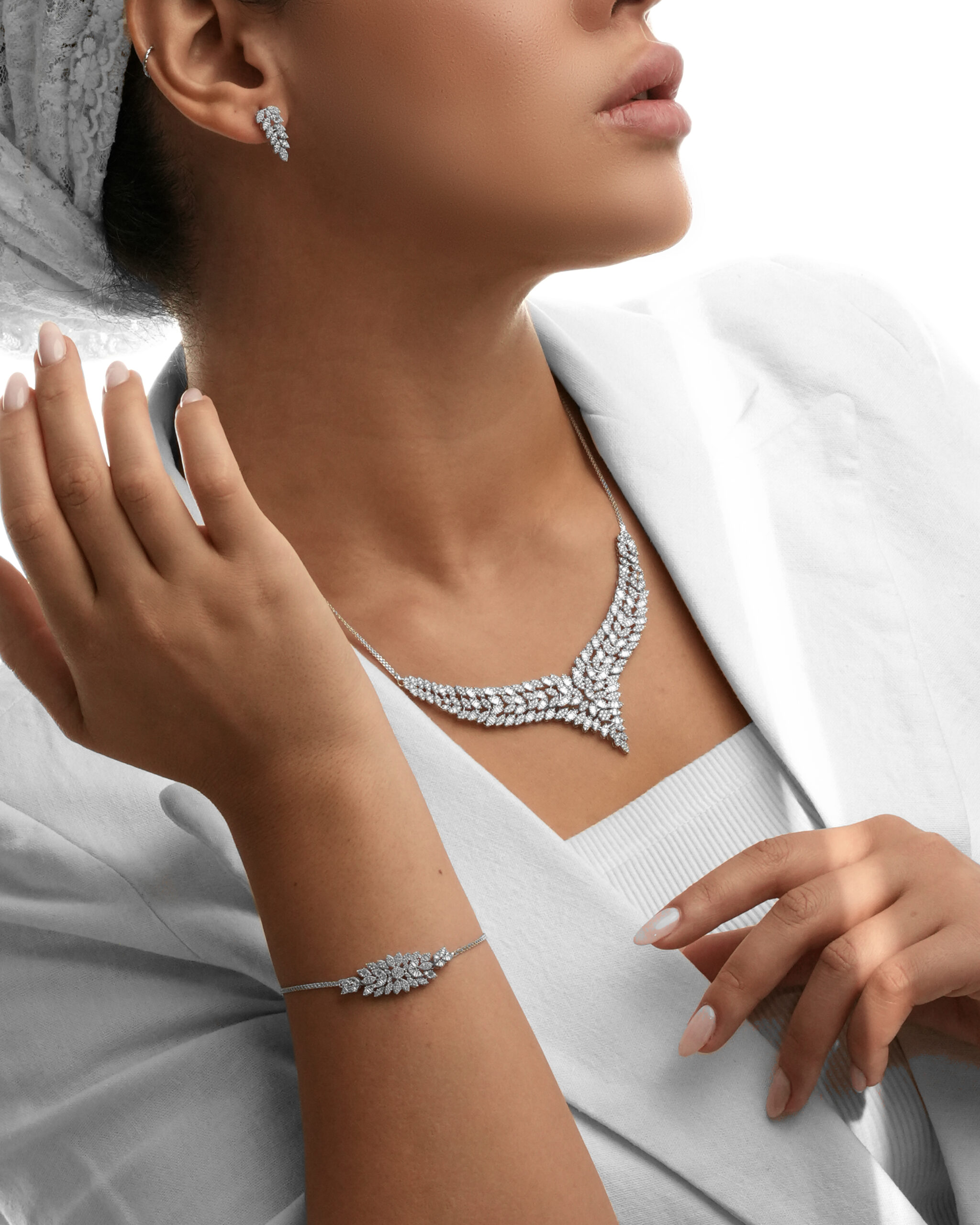 سرویس بر پایه جواهر مجلسی مارکیز حاضر، تجلی‌بخش اوج هنر زیورآلات لاکچری طلا سفید است که با الهام از طراحی بال فرشته و گردنبند خوشه ای طرح برگ، جلوه‌ای آسمانی و خیره‌کننده خلق کرده است. این ست گوشواره گردنبند دستبند مجلسی با نگین مارکیز درجه یک اتمی درخشان، درخششی معادل با الماس‌های طبیعی را به نمایش می‌گذارد و انتخابی بی‌نظیر برای بانوان با سلیقه است.​طرح V شکل گردنبند به زیبایی روی خط گردن می‌نشیند و جلوه‌ای شاهانه به استایل شما می‌بخشد. دستبند ظریف نگین‌کاری و گوشواره‌های متناسب، تکمیل‌کننده این سرویس تراش بی‌نقص هستند. با انتخاب این زیورآلات سفید لوکس، در هر مراسم و مهمانی، از جمله به عنوان ست عروس شیک، جواهرات ترند مراسم و یا یک هدیه تولد گرانبها، نگاه‌ها را مجذوب خود خواهید کرد. این سرویس مظهر استایل مینیمال پر زرق و جذابیت خیره‌کننده است که شکوه جواهرات لوکس طرح بال را با قیمتی مقرون‌به‌صرفه ارائه می‌دهد.