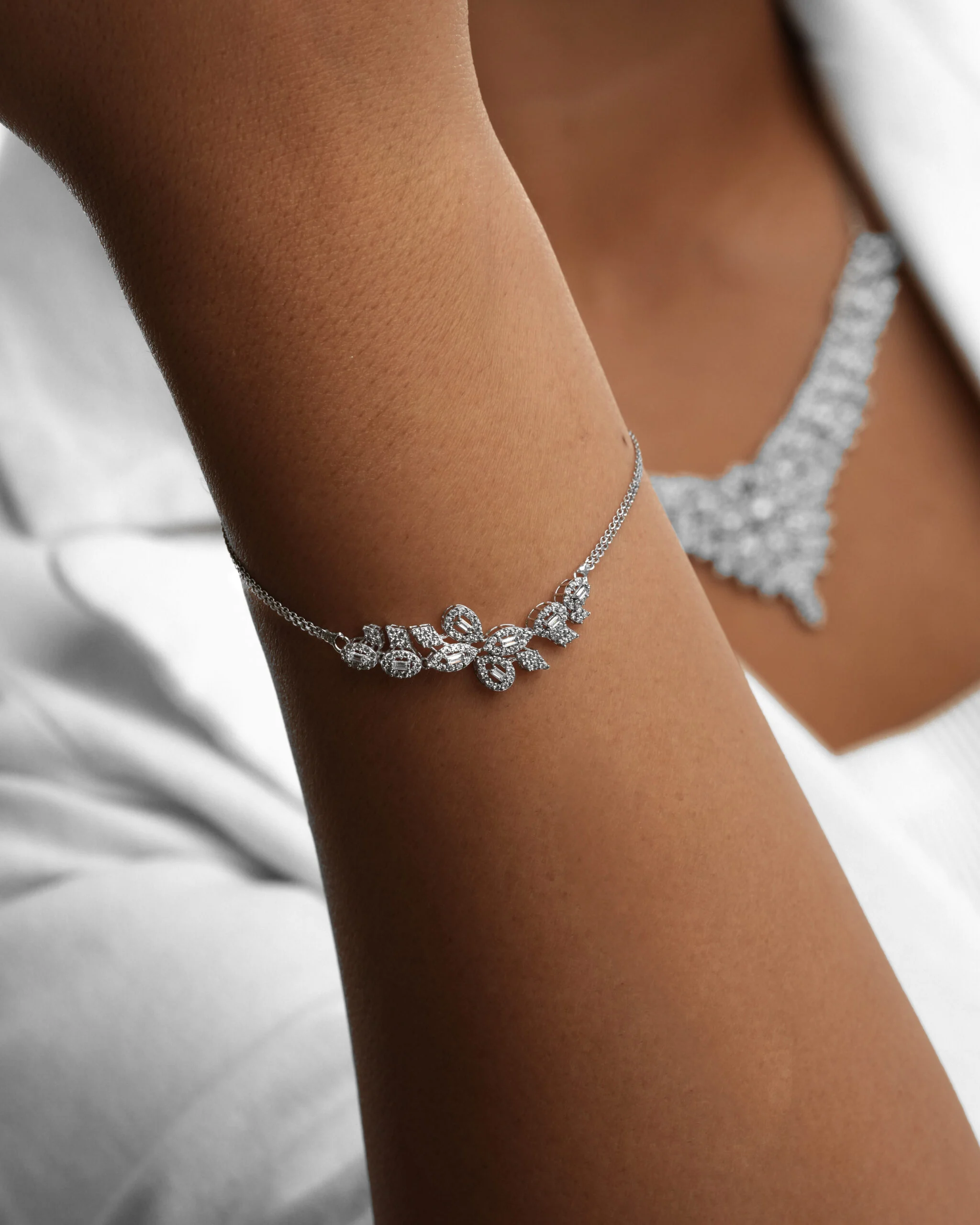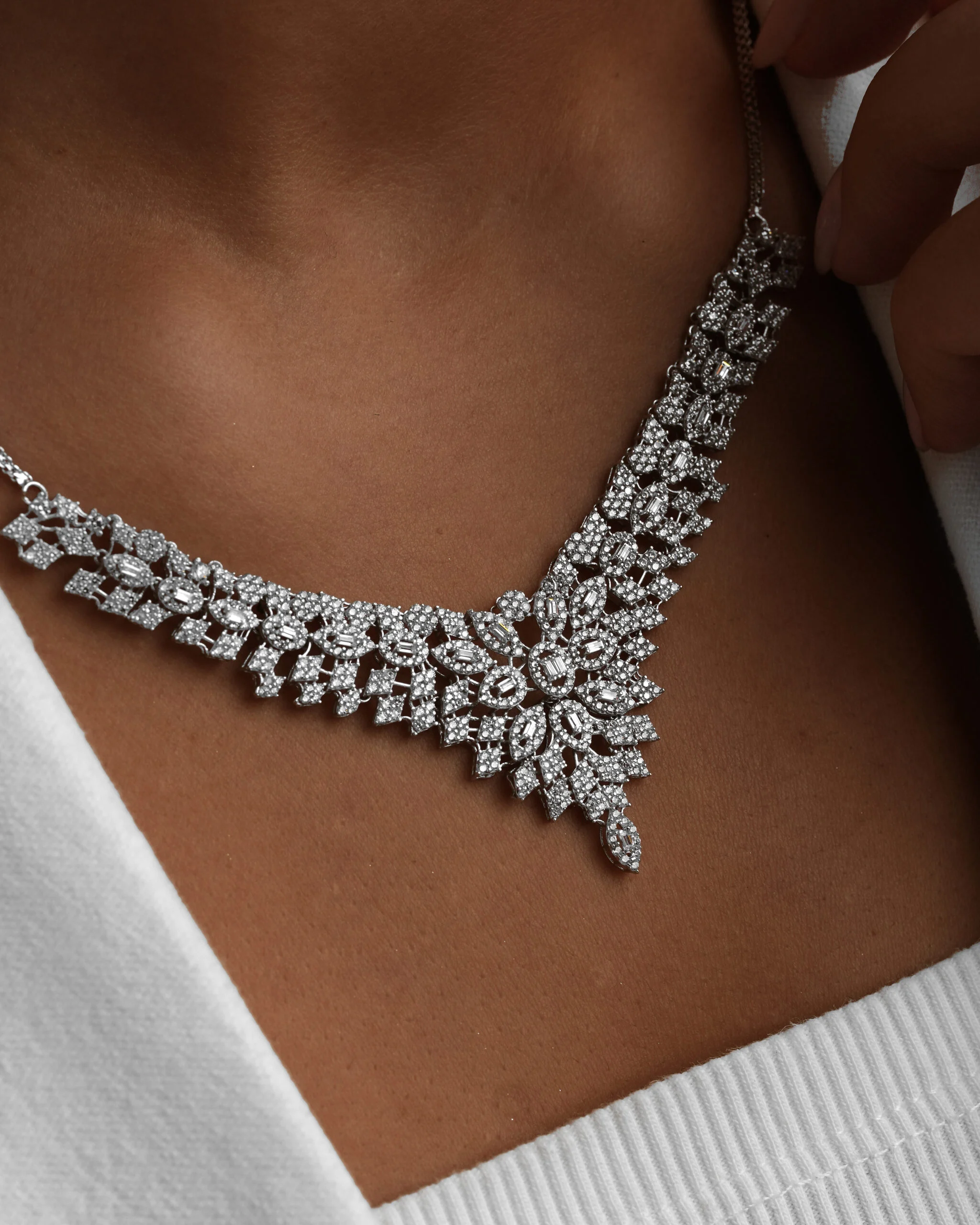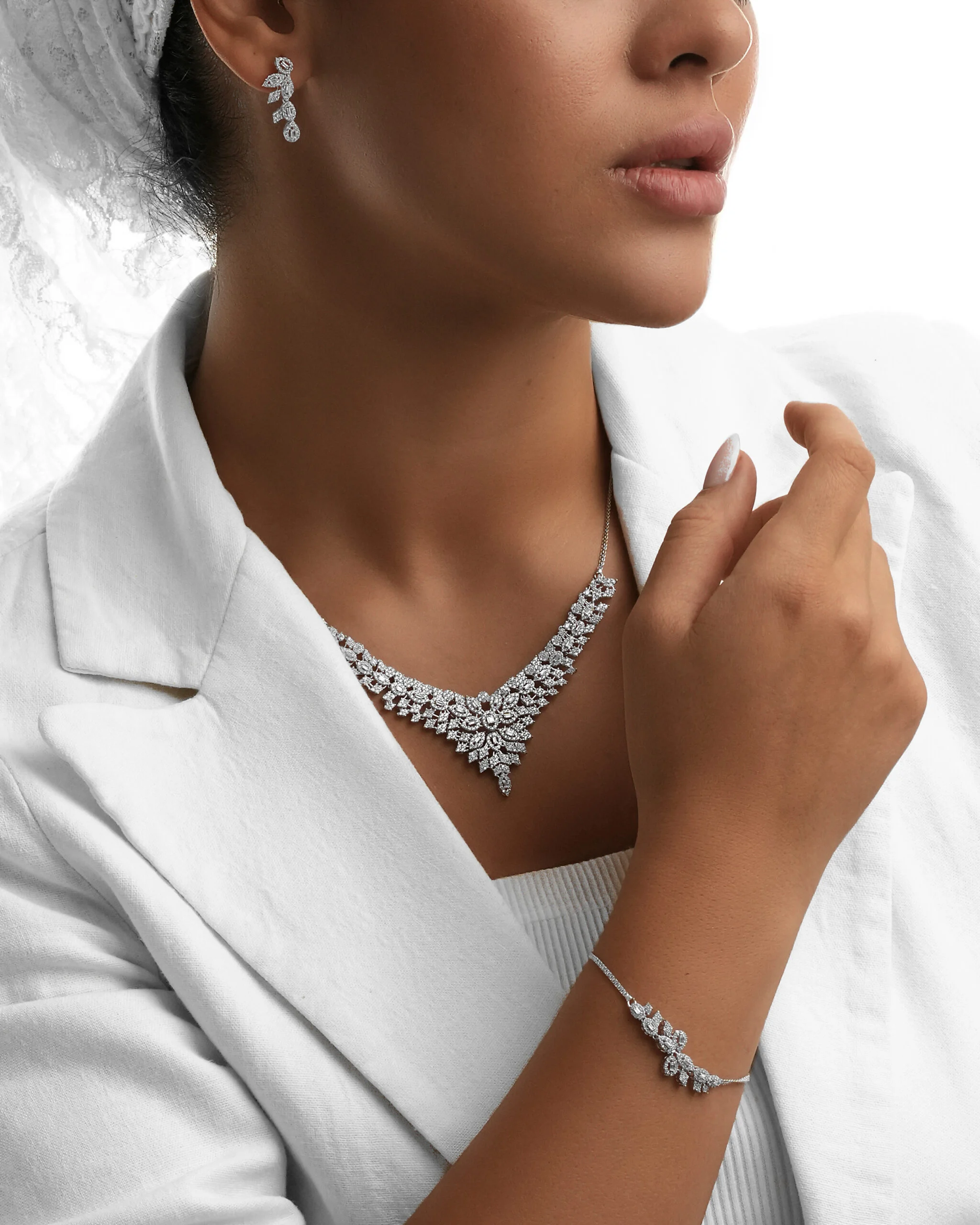 تجربه‌ای از شکوه و وقار را با سرویس سه بعدی طلا سفید ما لمس کنید. این ست خیره‌کننده، که با الهام از طرح‌های فاخر جواهرات شب و رسمی طراحی شده است، تعریفی جدید از زیبایی کلاسیک مدرن ارائه می‌دهد. طراحی هنرمندانه بر پایه جواهری طرح اشکی و نگین طرح مارکیز، جلوه‌ای ست لوکس و مجلسی به این سرویس بخشیده که نگاه‌ها را خیره می‌کند.​گردنبند شکل V نگین‌دار این مجموعه، با یک طراحی جواهری آبشاری و گردنبند یقه‌پوش نگین‌کاری، به زیبایی روی خط گردن می‌نشیند و جذابیت بالا را تضمین می‌کند. در کنار آن، گوشواره طرح شاخه ظریف و دستبند گلچینی اتمی، هماهنگی بی‌نقصی را ایجاد کرده و ظاهری باوقار زنانه به ارمغان می‌آورند.​این سرویس طلا رنگ سفید به طور کامل با نگین اتمی درخشان تزئین شده است، که درخششی همانند الماس به آن می‌بخشد. اگر به دنبال یک سرویس عروس شیک نگینی یا یک ست شاین بالا برای درخشش در مهمانی‌های خاص هستید، این مجموعه زیورآلات براق و سفید بهترین انتخاب شما خواهد بود. این سرویس بر پایه جواهرات، سرمایه‌گذاری شما بر روی زیبایی و کیفیت است.