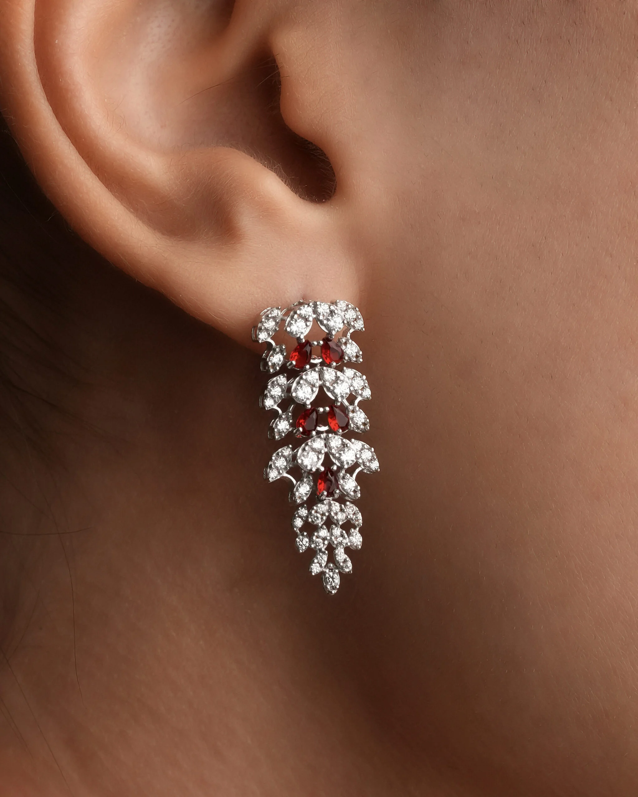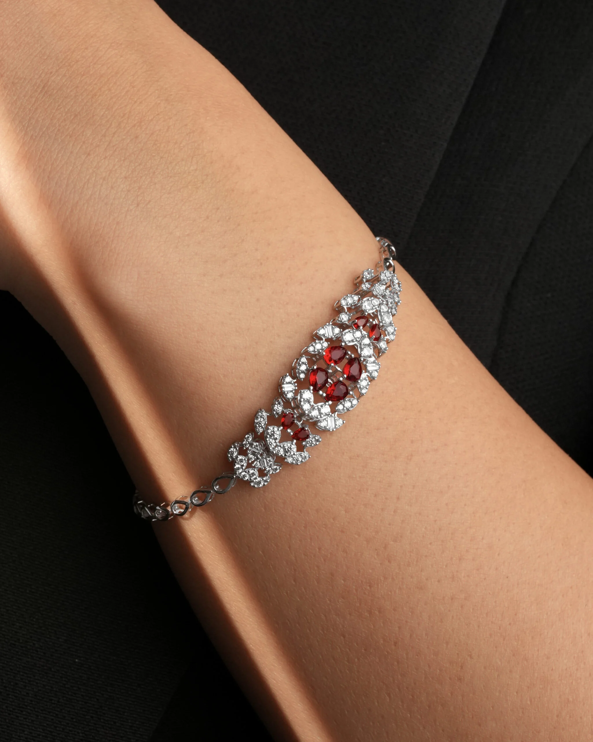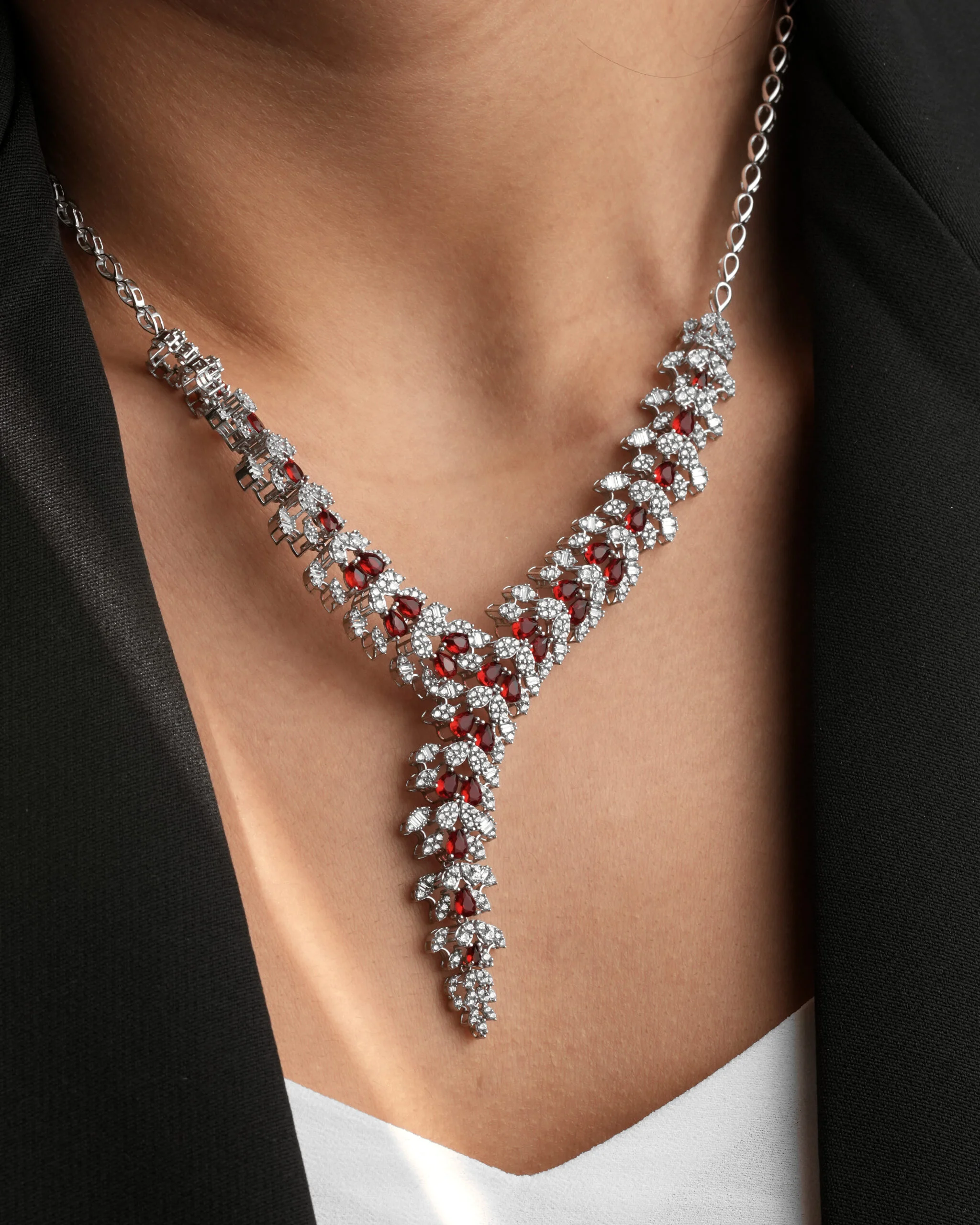​این سرویس بر پایه جواهری کلاسیک و لوکس، با طراحی هنرمندانه و خیره‌کننده، یک انتخاب بی‌نظیر برای مراسم و مهمانی‌های شماست. زنجیر سنگین و ضخیم این سرویس، استحکام و زیبایی را همزمان به ارمغان می‌آورد. ​این سرویس شامل گردنبند، گوشواره و دستبند است که هر سه با نگین‌های کریستالی اتمی براق و سنگ‌های قرمز رنگی تزیین شده‌اند. طراحی سه‌بعدی و دقیق نگین‌ها، نور را به زیبایی منعکس کرده و جلوه‌ای باشکوه ایجاد می‌کند.