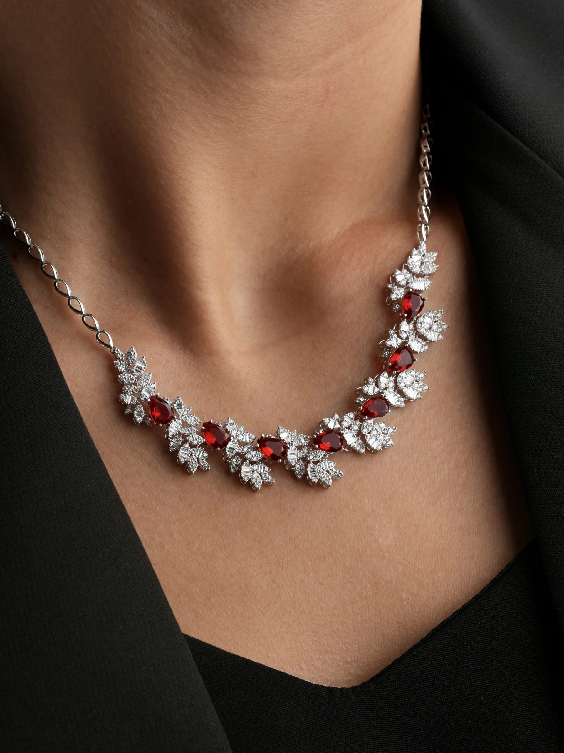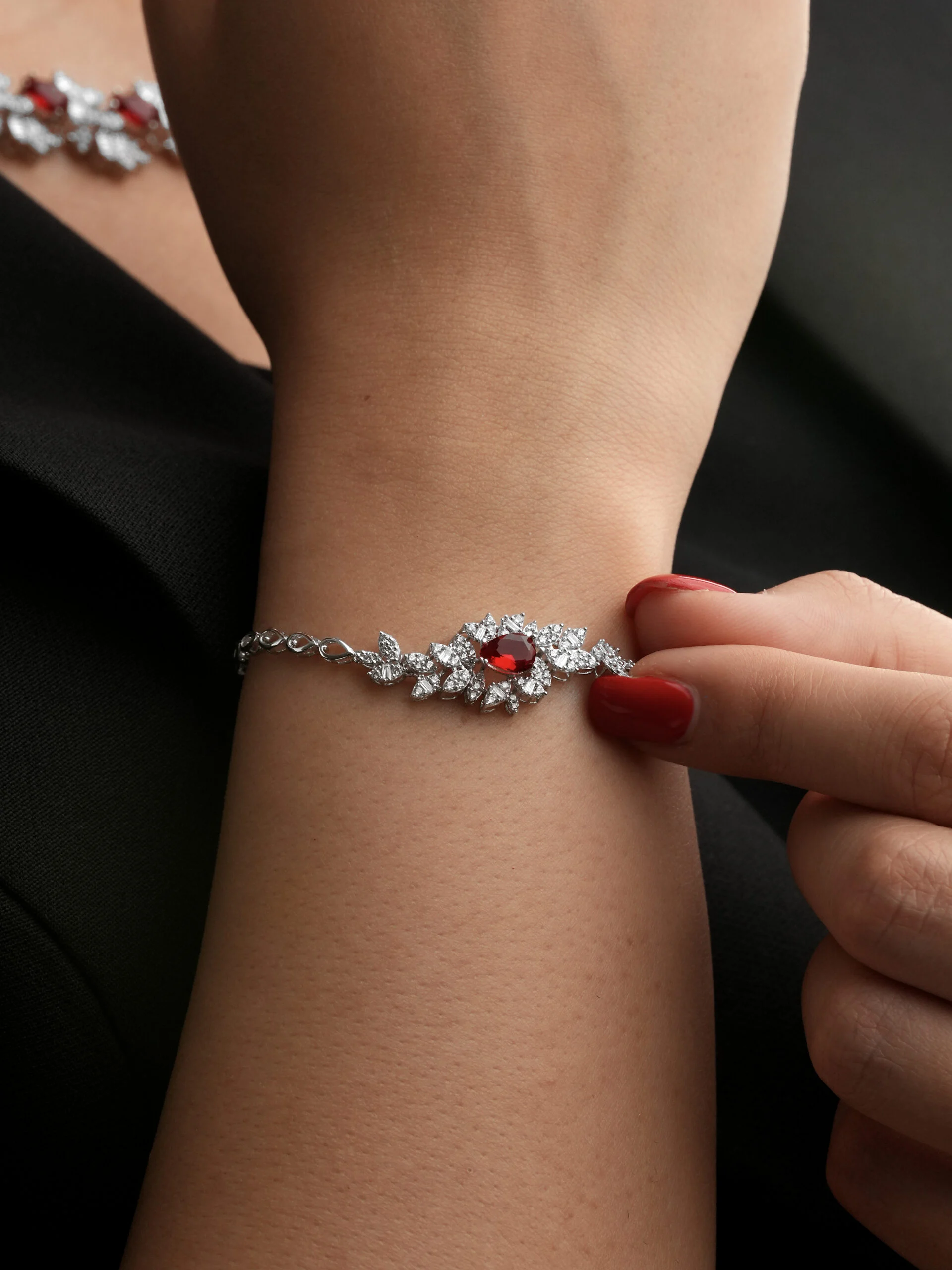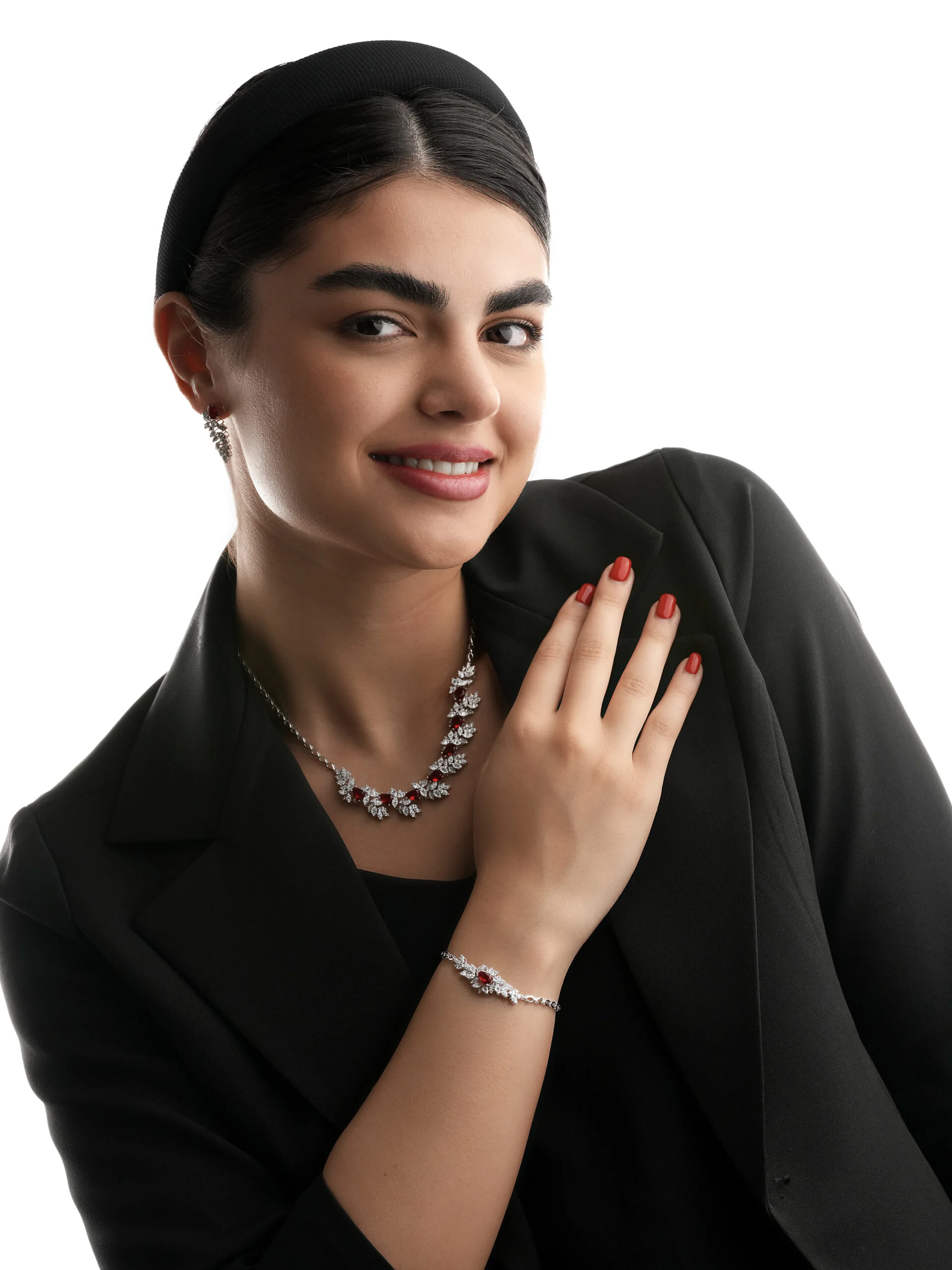 این سرویس بر پایه جواهری کلاسیک و مجلسی با طراحی سهبعدی و الهام از طبیعت، ظرافت و شکوه را به استایل شما میبخشد. زنجیر سنگین و ضخیم این سرویس، علاوه بر زیبایی، دوام و استحکام بالایی دارد. ترکیب نگینهای سنگ قرمز براق با نگین های اتمی درخشان، جلوهای متفاوت و خیرهکننده ایجاد میکند. این سرویس کامل که شامل گردنبند، گوشواره و دستبند است، برای سرویس عروس یا مجالس رسمی بسیار مناسب است.