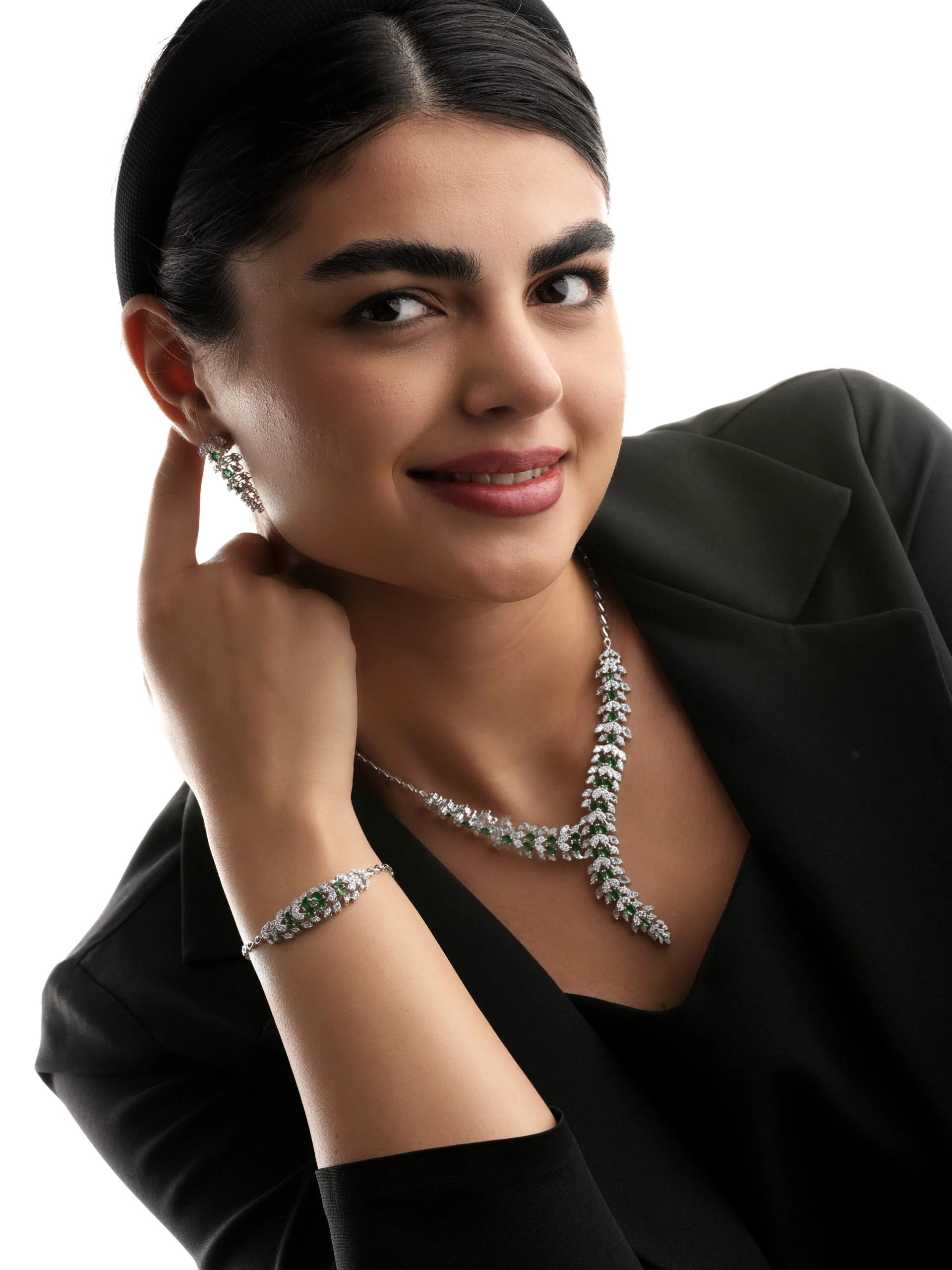 این سرویس بر پایه جواهرکلاسیک و مجلسی، با طراحی چشمنواز و ترکیب رنگی خیرهکننده، ظرافت و شکوه را به استایل شما اضافه میکند. زنجیر سنگین و ضخیم این سرویس، در عین زیبایی، دوام و استحکام بالایی دارد. نگین سبز زمردی، با تراش دقیق در کنارنگین های اتمی درخشان ، جلوهای متفاوت و جذاب ایجاد میکنند. طراحی سهبعدی این سرویس، نور را به زیباترین شکل ممکن منعکس کرده و آن را به یک انتخاب عالی برای سرویس عروس یا مهمانیهای خاص تبدیل میکند.