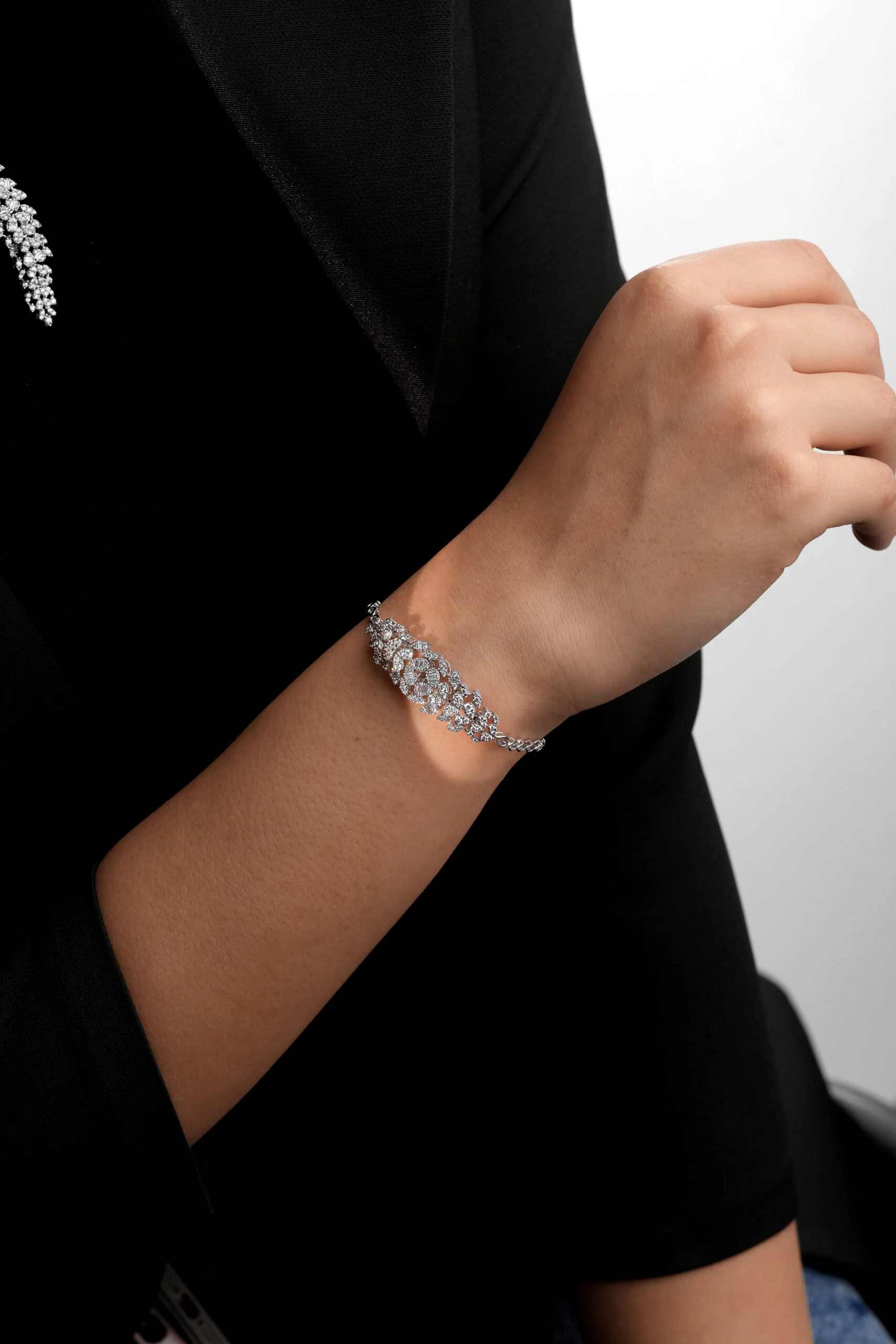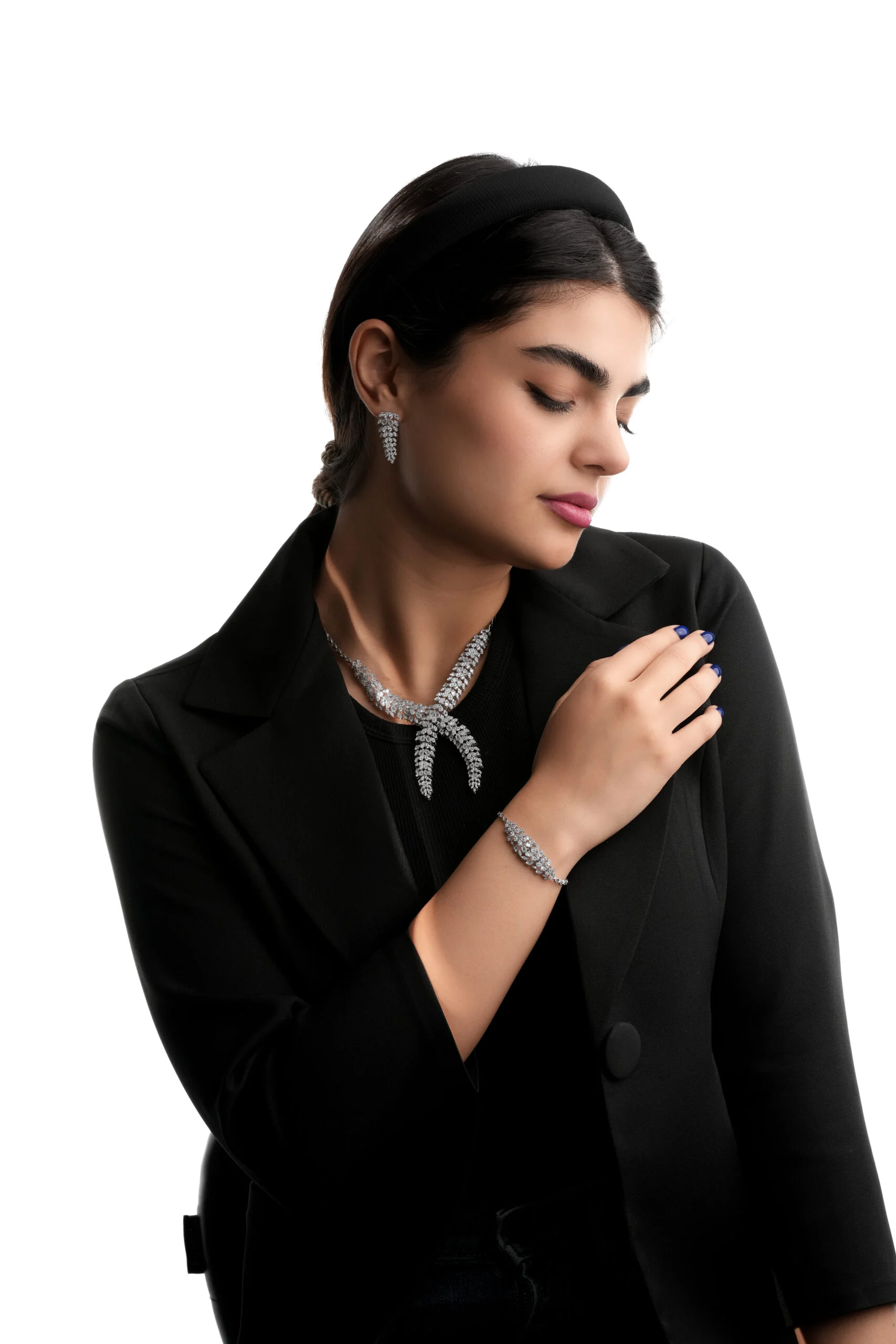 این سرویس جواهری سفید عروس، با طراحی سهبعدی و الهام از طرح کلاسیک و در عین حال مدرن پاپیون، جلوهای بینظیر از زیبایی را به نمایش میگذارد. این سرویس جواهری پر کار، شامل گردنبند مجلسی طرح پاپیون، گوشواره و دستبند است که هر قطعه با دقت و ظرافت با نگینهای کریستالی اتمی براق پوشانده شده است. این ست کامل سرویس کریستالی، در هر مجلسی شما را درخشانتر از همیشه نشان میدهد.سرویس سنگین و ضخیم بودن این مجموعه، حس کیفیت و ارزش بالا را به شما منتقل میکند.