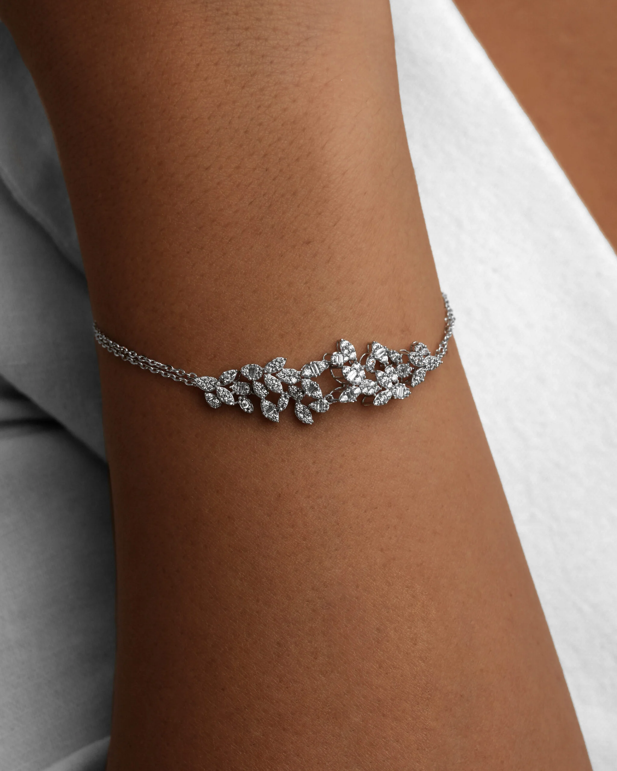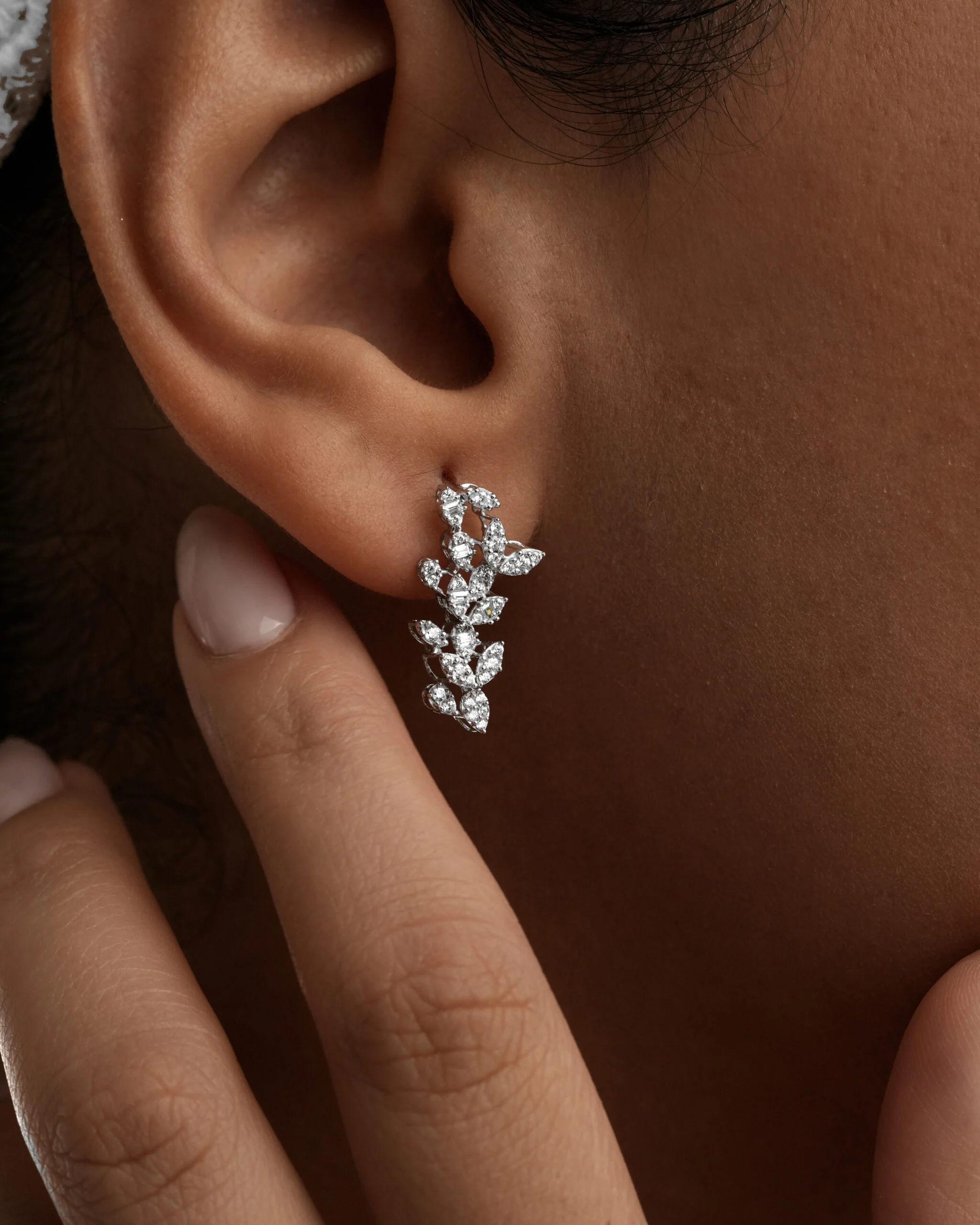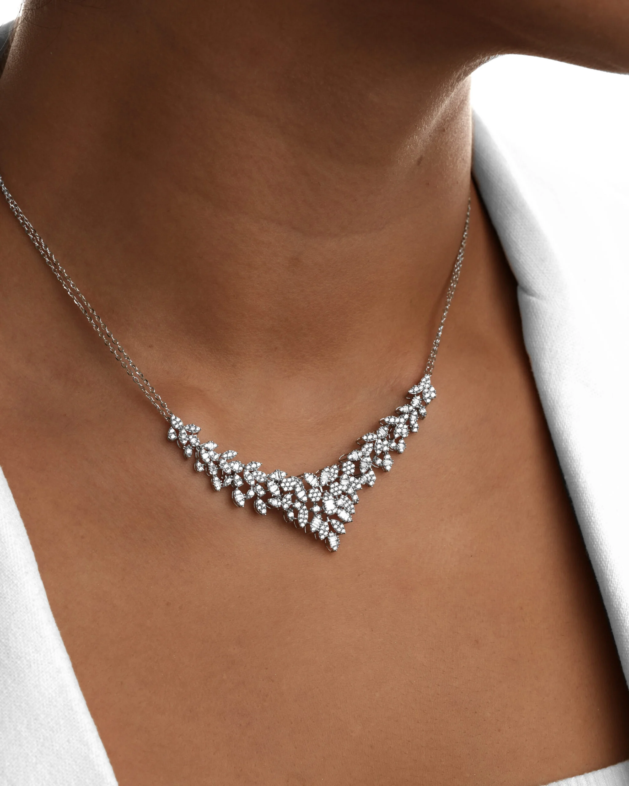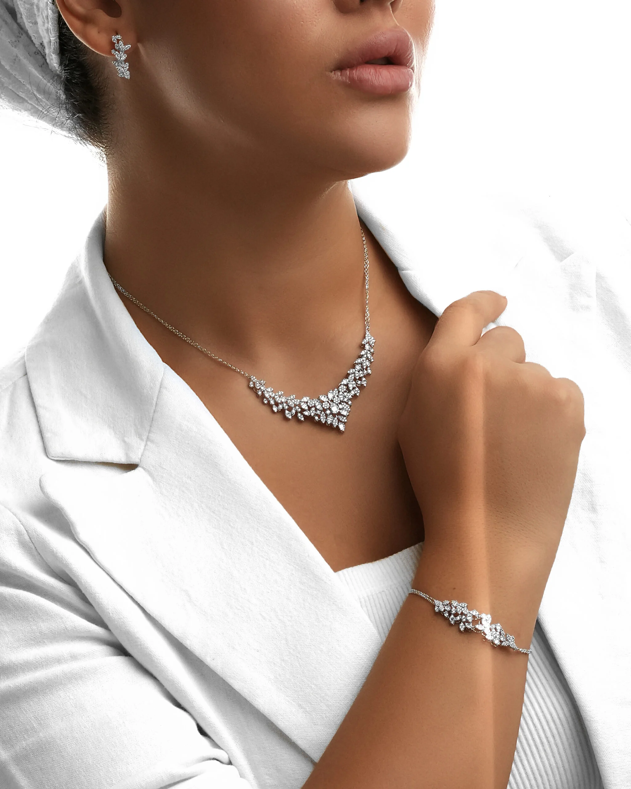 سرویس سه بعدی طلا سفید با طراحی منحصر به فرد و جزئیات دقیق، تلفیقی هنرمندانه از شکوه و ظرافت را به نمایش می‌گذارد. این ست بر پایه جواهری درخشان و شیک با الهام از تم طبیعت و ساختار طرح خوشه، بیانگر زیبایی ارگانیک و درخشش بی‌مانند است. هر قطعه از این سرویس، از گردنبند V شکل نگین‌کاری گرفته تا دستبند و گوشواره نگینی خاص، با بهره‌گیری از تکنیک‌های پیشرفته سه بعدی در صنعت طلا و جواهر ساخته شده، تا ظاهری کاملاً مشابه با سرویس‌های تمام بر پایه جواهر داشته باشد.​استفاده هوشمندانه از نگین‌های اتمی مارکیز  با کیفیت بالا، درخششی الماس‌گونه را به ارمغان می‌آورد. این سرویس انتخابی ایده‌آل برای بانوانی است که به دنبال جواهرات با احساس اعتماد به نفس و اصالت هستند و آن را به یک گزینه بی‌نظیر برای سرویس عروس یا ست بر پایه جواهر برای مراسم رسمی تبدیل می‌کند.