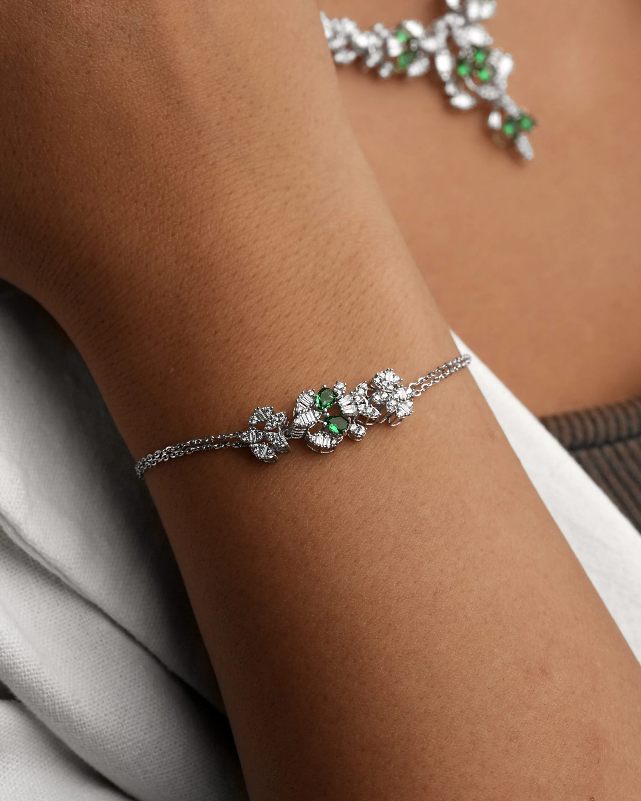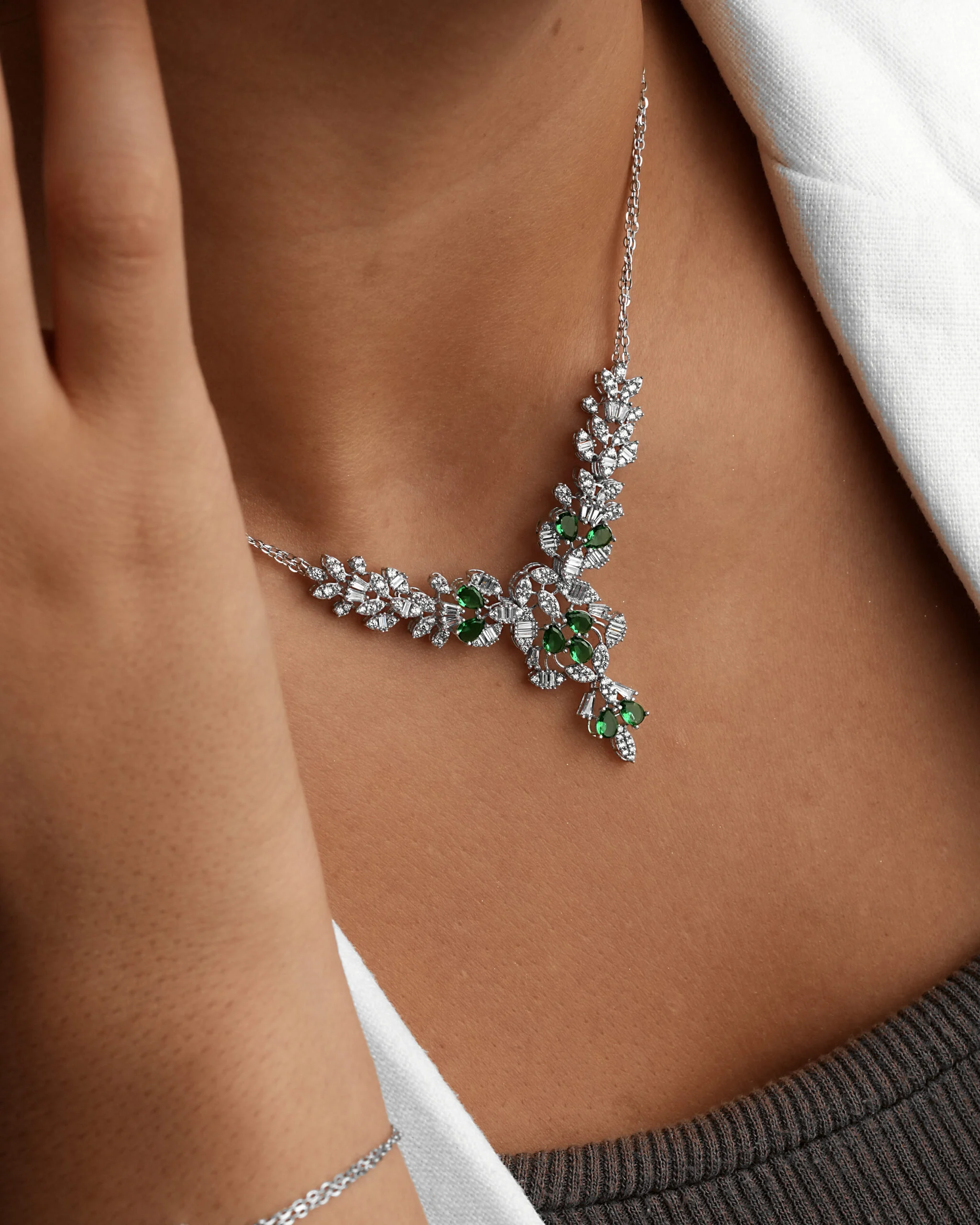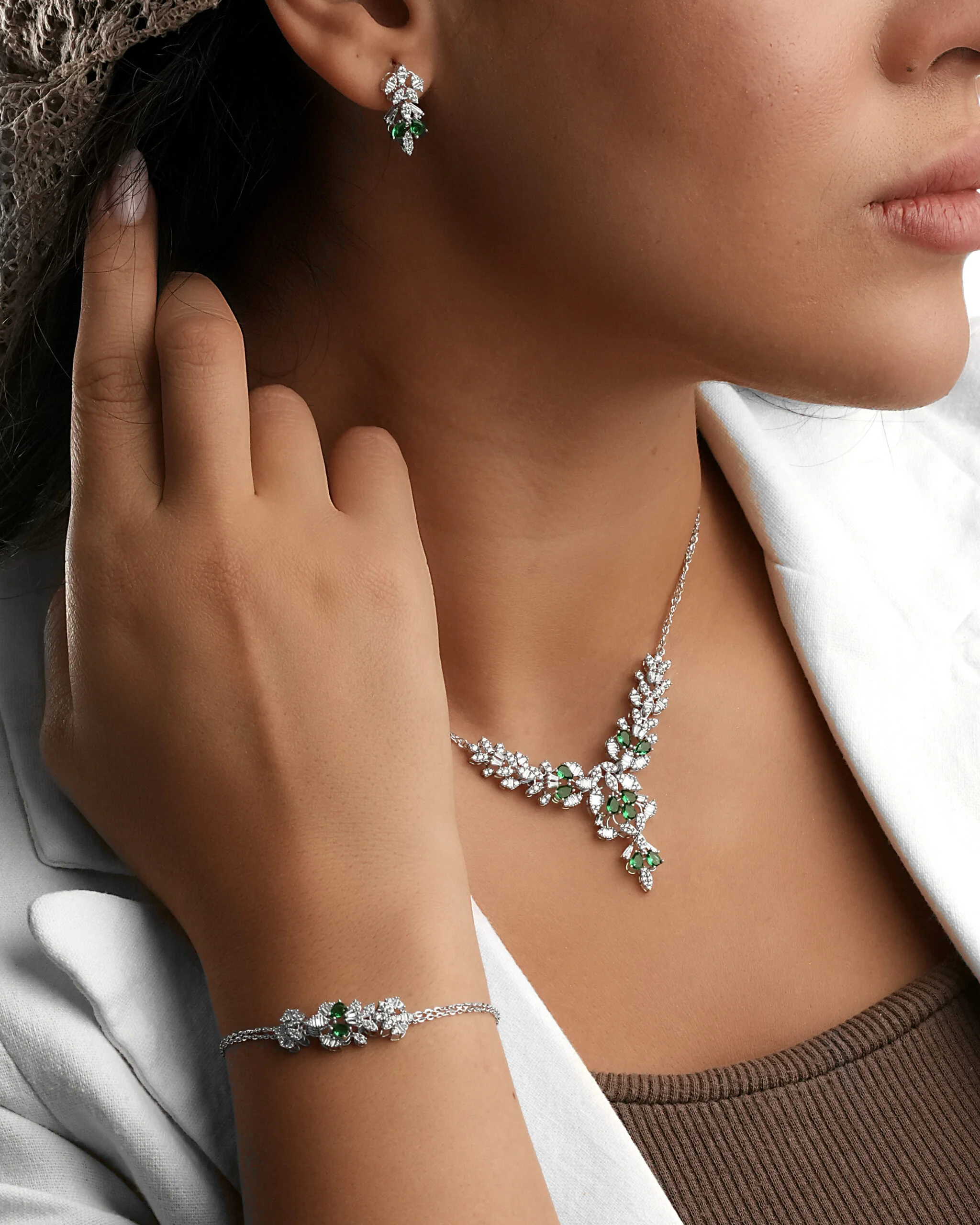 به دنیای زیورآلات مجلل زنانه و طراحیهای منحصر به فرد قدم بگذارید. این سرویس سه بعدی بر پایه جواهر طلا سفید، اوج ظرافت و هنر در طراحی جواهر است که جلوهای بینظیر از طبیعت را به نمایش میگذارد. با الهام از نقوش گیاهی، گردنبند طرح شاخهای، دستبند، و گوشوارهها با ترکیب خیرهکننده نگینهای اتمی سبز و سفید (با الهام از زمرد و برلیان) آراسته شدهاند.این مدل سهبعدی سرویس عروس یا مجلسی، یک انتخاب بیعیب و نقص برای کسانی است که به دنبال جواهرات با احساس طراوت و در عین حال سبکی وینتیج و کلاسیک هستند. با استفاده از تکنیکهای پیشرفته طراحی جواهر شیک و سهبعدی، جزئیات هر سرویس گردنبندی گلبرگی با دقت کامل پیادهسازی شده است. این کالکشن نگین اتمی با طرحی شبیه به سرویس شبدر نگیندار، درخشش ماندگاری را برای شما به ارمغان میآورد و جایگزینی اقتصادی و لوکس برای ستهای جواهری گرانقیمت است. یک ست مجلسی طرح زمردی که درخشش و زیبایی را در کنار هم به شما هدیه میدهد.