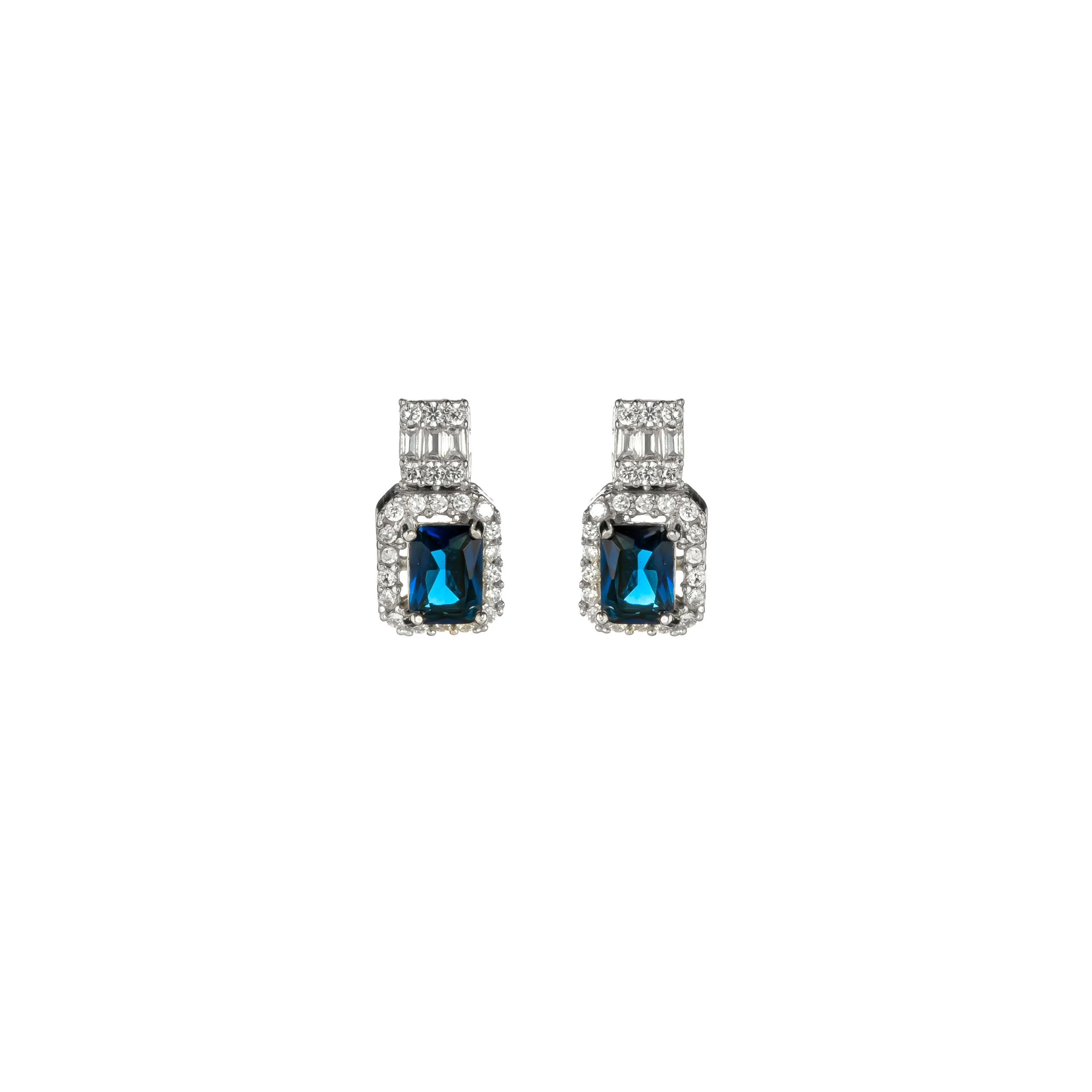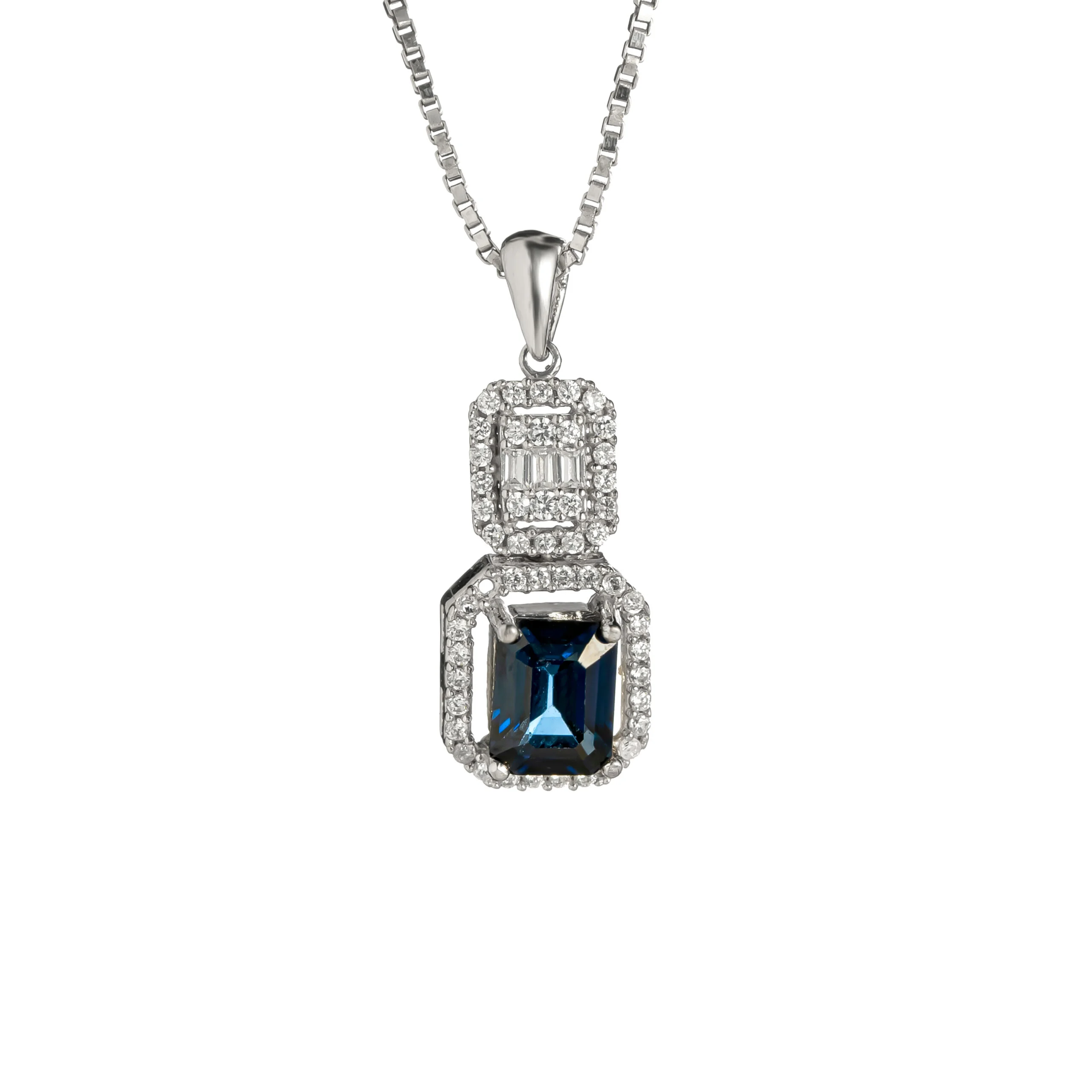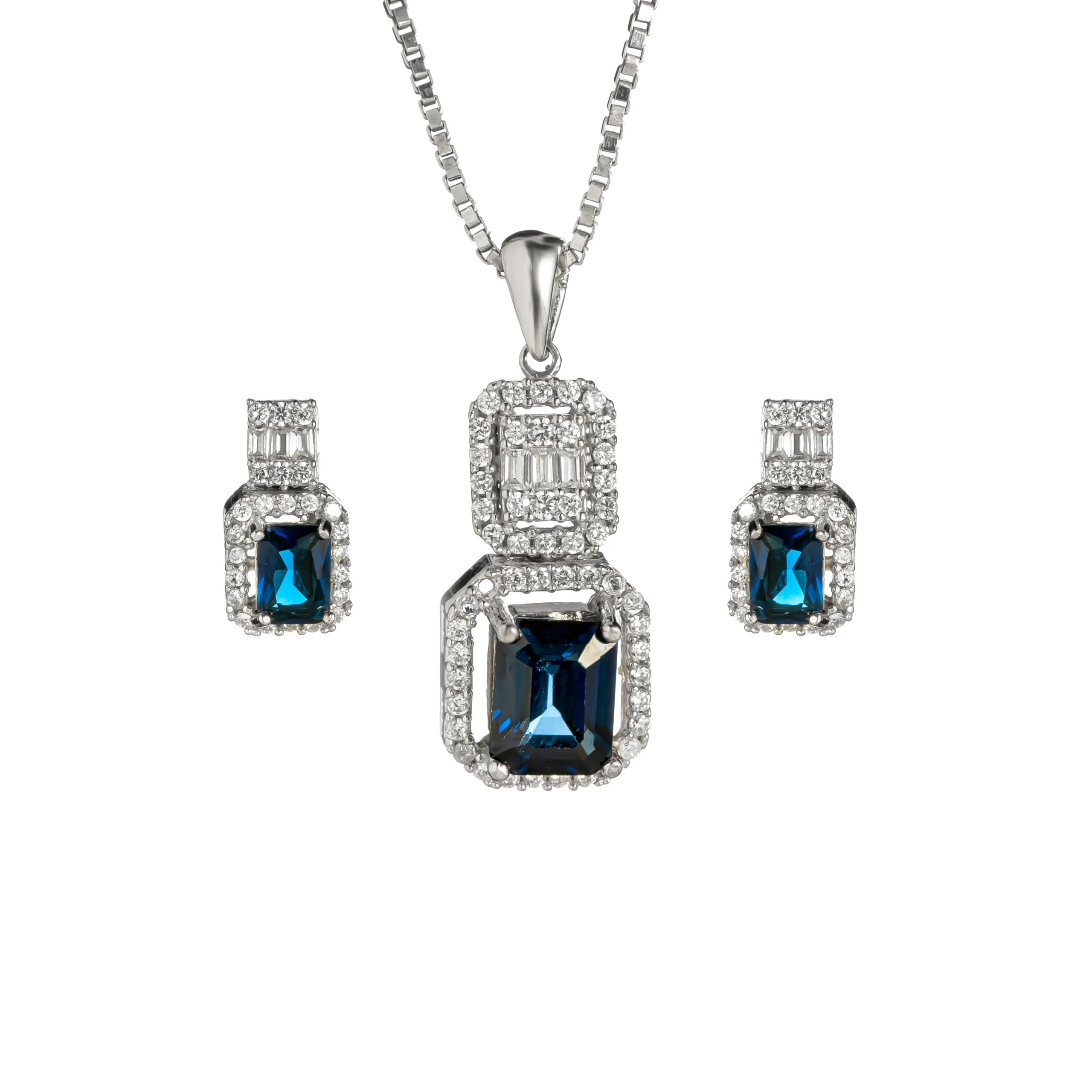 این نیم ست بر پایه جواهر با الگوی اشکال هندسی مربع و مستطیل، سبکی مدرن و در عین حال کلاسیک را به نمایش میگذارد. آویز دوتکه گردنبند و گوشوارههای متقارن، زیبایی بینظیری به این مجموعه بخشیدهاند.نگین اصلی درشت با رنگ آبی تیره، یادآور زیبایی یاقوت کبود است و با تراش زمردی بینقص خود، درخششی فوقالعاده دارد. این سنگ توسط هالهای از نگینهای ریز با تراش باگت و کریستالی اتمی احاطه شده است که به افزایش نور و درخشش آن کمک میکند.