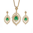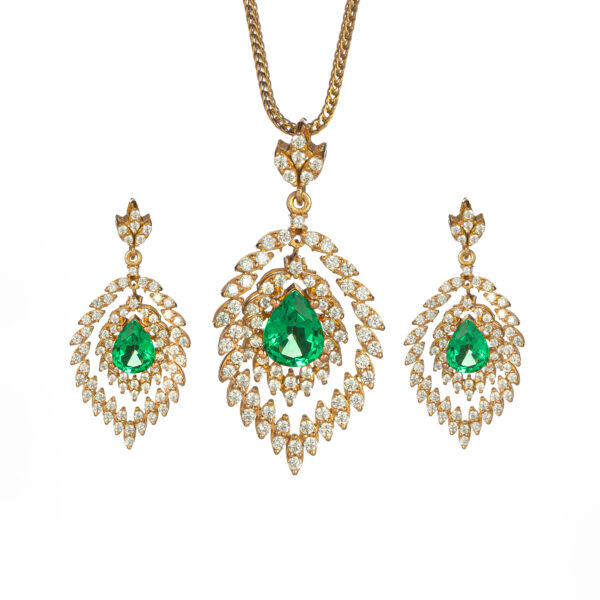 این نیم ست برپایه جواهر خیرهکننده، نمادی از زیبایی و ظرافت بیانتهاست. این نیمست شامل یک آویز و گوشوارههای هماهنگ با طراحی برگی شکل و ظریف است که هر نگاهی را به خود خیره میکند. در قلب این جواهرات لوکس، نگین های طرح زمرد سبز به صورت اشکدار قرار گرفتهاند که درخشش بینظیر ببخشد.