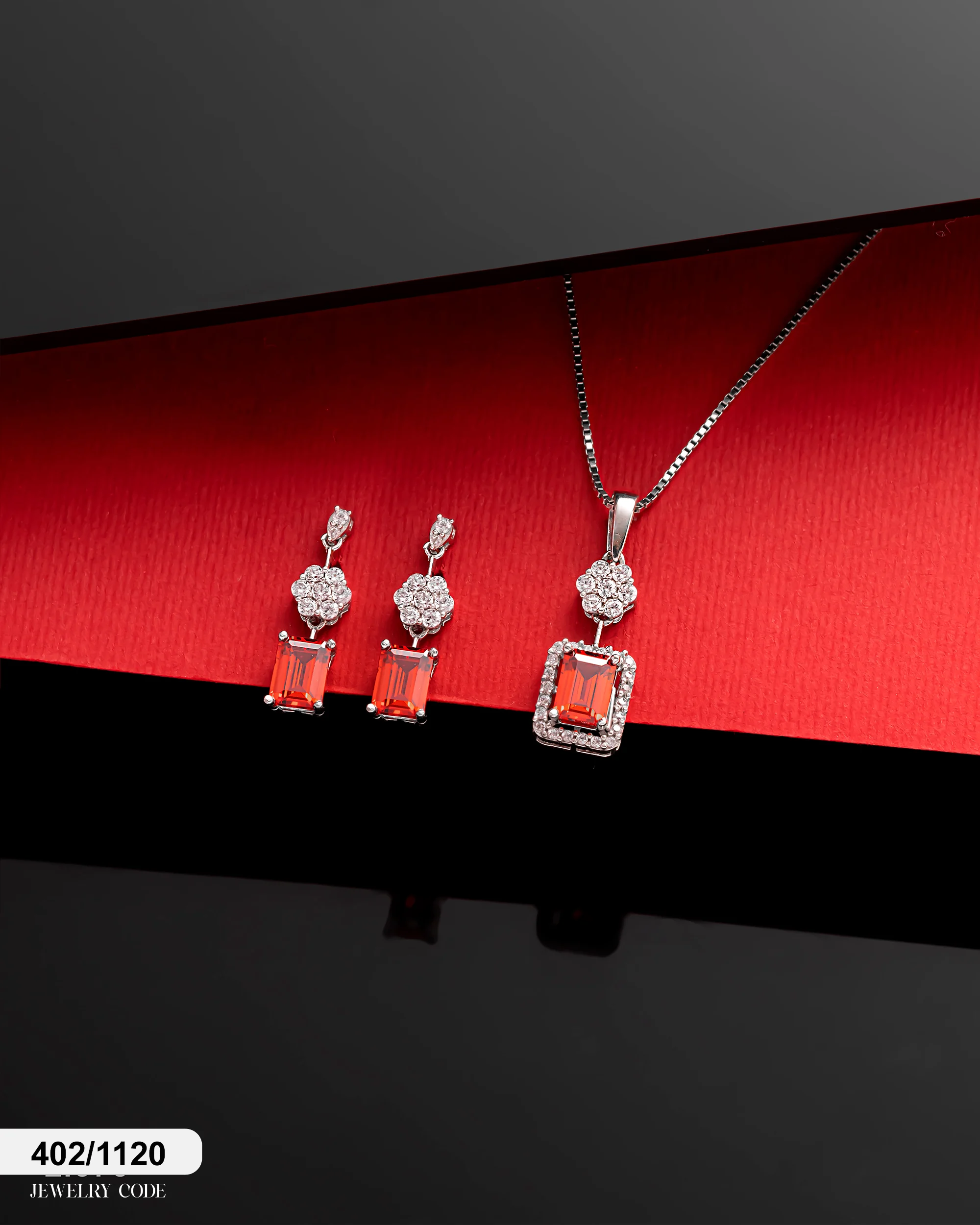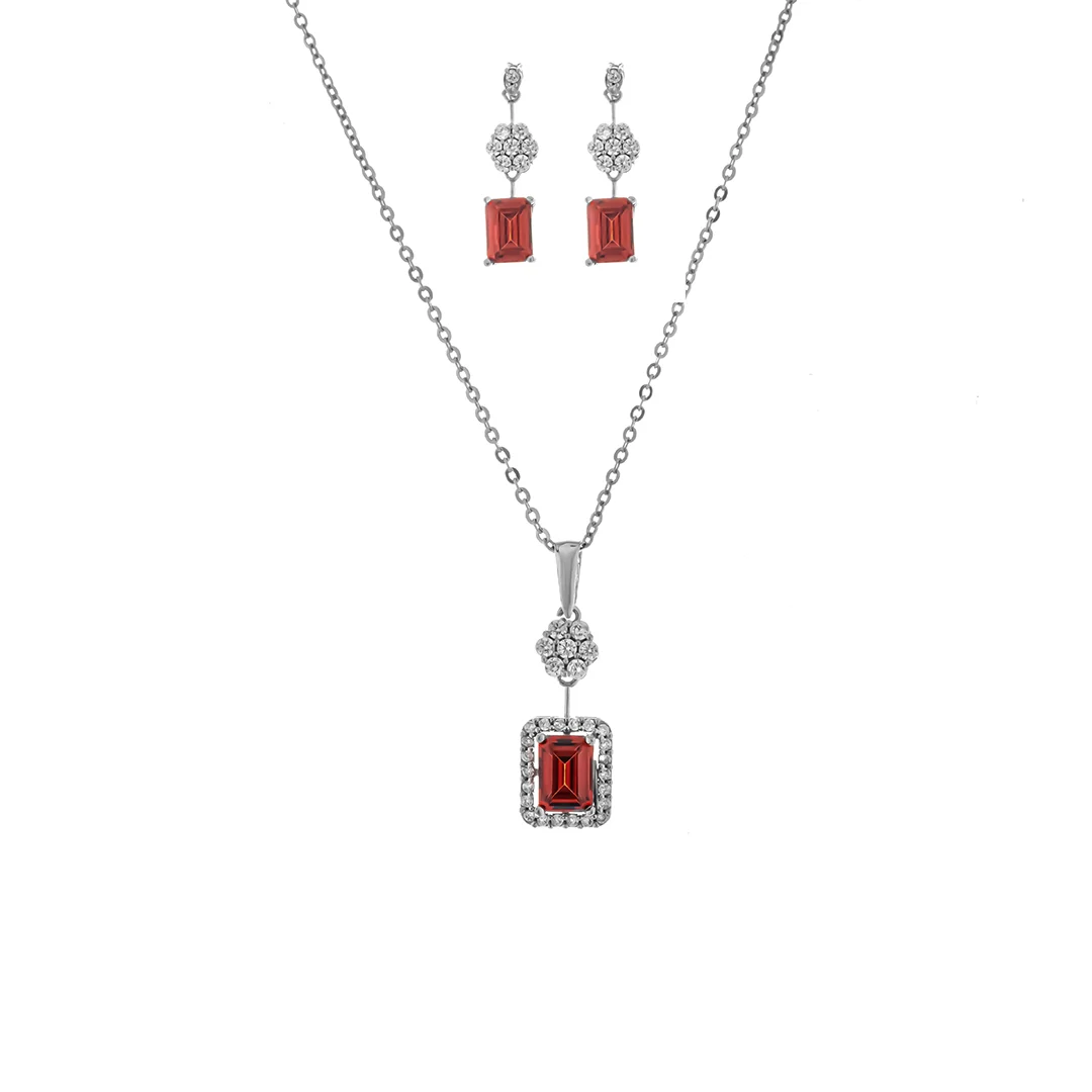 نیم ست بر پایه جواهر شامل یک گردنبند و یک جفت گوشواره با نگین‌های مستطیلی و درخشان به رنگ سرخ است. طراحی این جواهرات زنانه با ترکیب هنرمندانه طرح گل و نگین طرح یاقوت مستطیل، جلوه‌ای خاص و بی‌نظیر به آن بخشیده است. ​​این نیم‌ست بر پایه جواهر نفیس، انتخابی ایده‌آل برای بانوانی است که به دنبال جواهرات لوکس و شیک هستند.