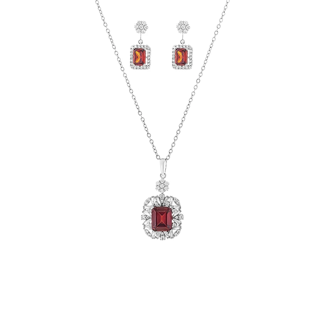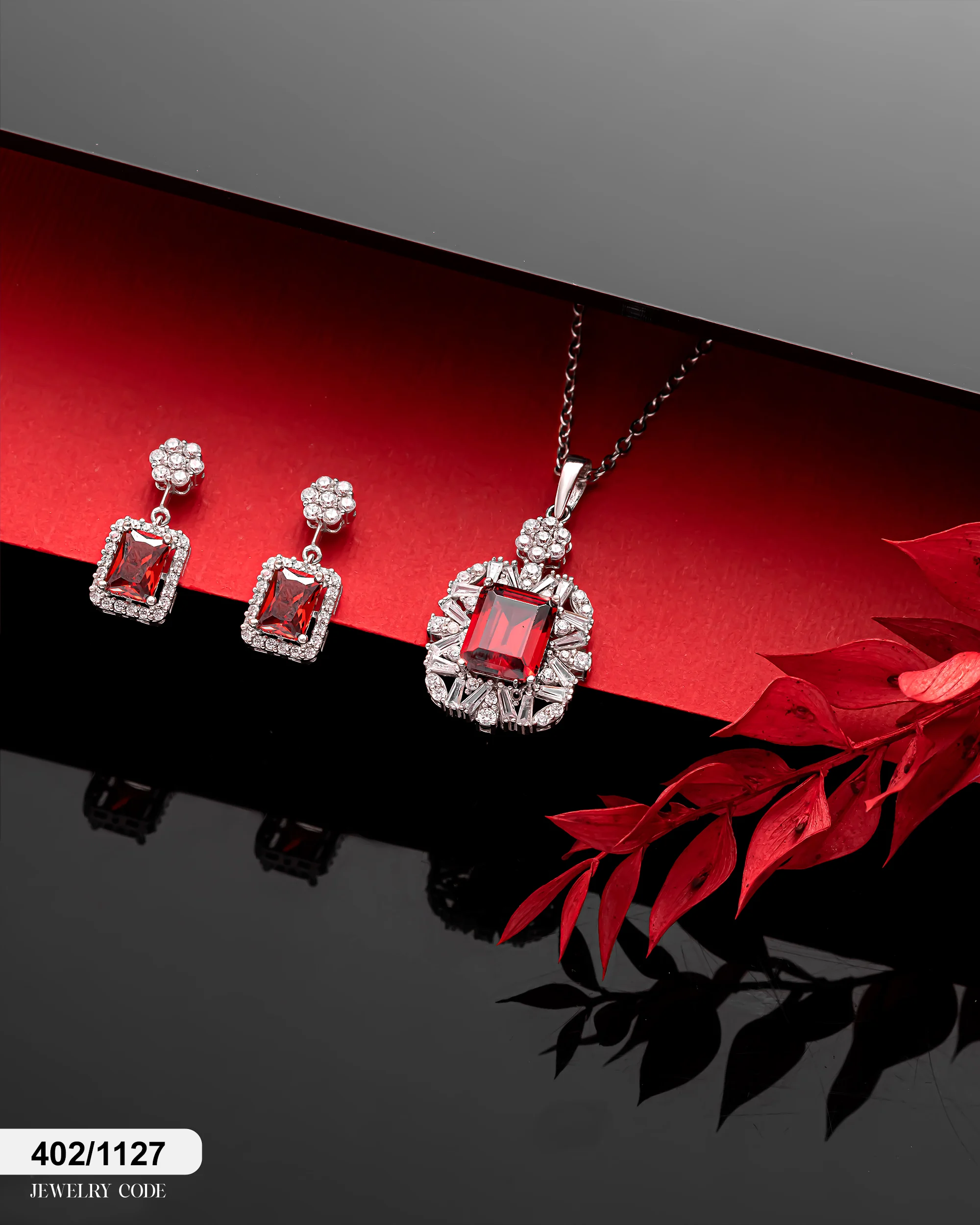 ​زیبایی خیره‌کننده و درخشش آتشین طرح یاقوت سرخ برجسته را در این نیم ست جواهر لوکس کلاسیک تجربه کنید. این سرویس مجلل که شامل گوشواره و آویز مجلل است، با دقت و ظرافت بی‌نظیری طراحی شده تا هر نگاهی را به خود جذب کند. نگین طرح  یاقوت سرخ با تراش مربعی برجسته، در میان هاله‌ای از نگین‌های اتمی درخشان قرار گرفته‌اند که درخشش و جلوه‌ای بی‌نظیر به این مجموعه بخشیده‌اند.طراحی مربع برجسته آن، نمادی از قدرت و زیبایی بوده و هر کدام از قطعات، به تنهایی می‌توانند نقطه کانونی استایل شما باشند.