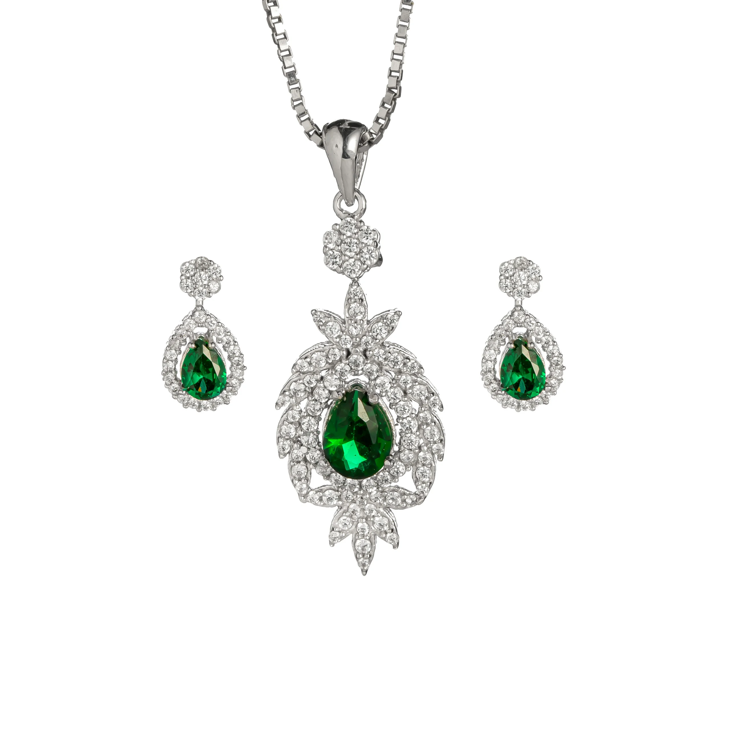 ​این نیم‌ست بر پایه جواهر مجلسی لاکچری با طراحی کلاسیک و درخشان، نمادی از شکوه و زیبایی است. نیم‌ست گردنبند و گوشواره طرح سلطنتی ما با نگین‌های درخشان و تراش‌های دقیق، گزینه‌ای بی‌نظیر برای خانم‌های شیک‌پوشی است که به دنبال زیورآلات کلاسیک با طراحی ظریف برای مهمانی‌های رسمی و مراسم خاص هستند.در مرکز هر قطعه، یک نگین طرح زمرد اشک با تراشی دقیق قرار گرفته که با درخشش خاص خود، نگاه‌ها را به خود جذب می‌کند. اطراف این نگین‌ها با نگین های اتمی براق و ریز تزیین شده است که در کنار هم، جواهرات زمردین با نگین‌های اتمی را به یک انتخاب لوکس تبدیل می‌کنند.