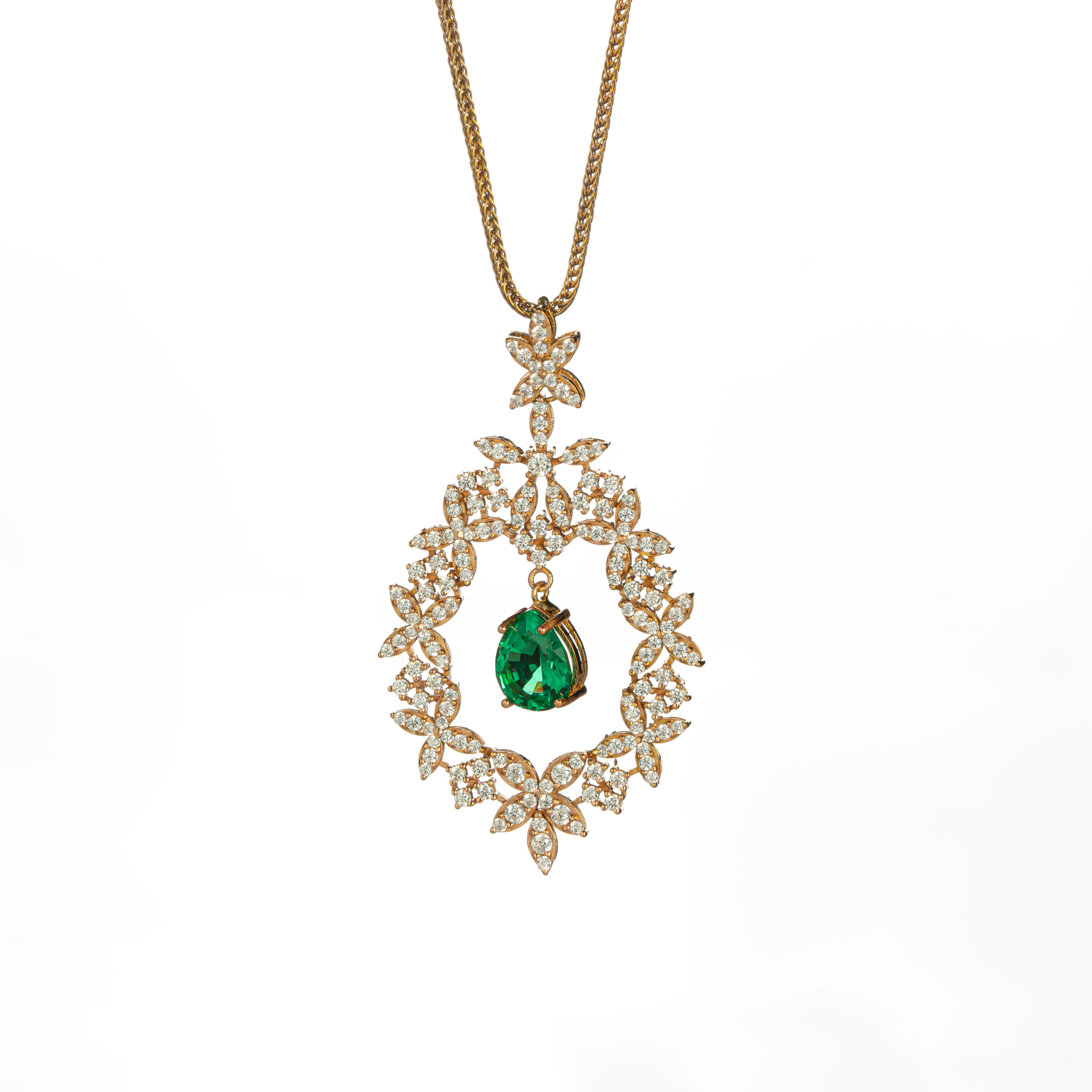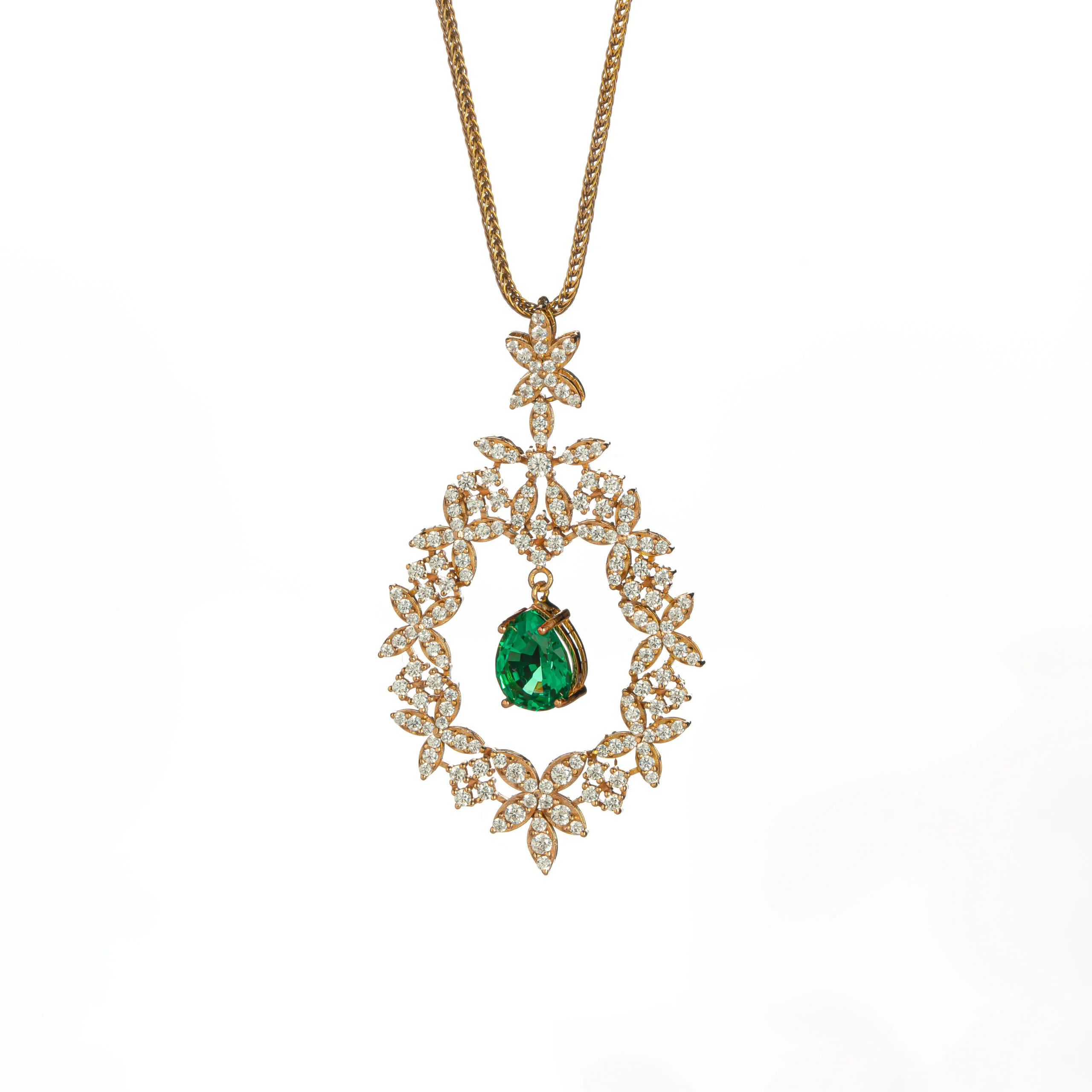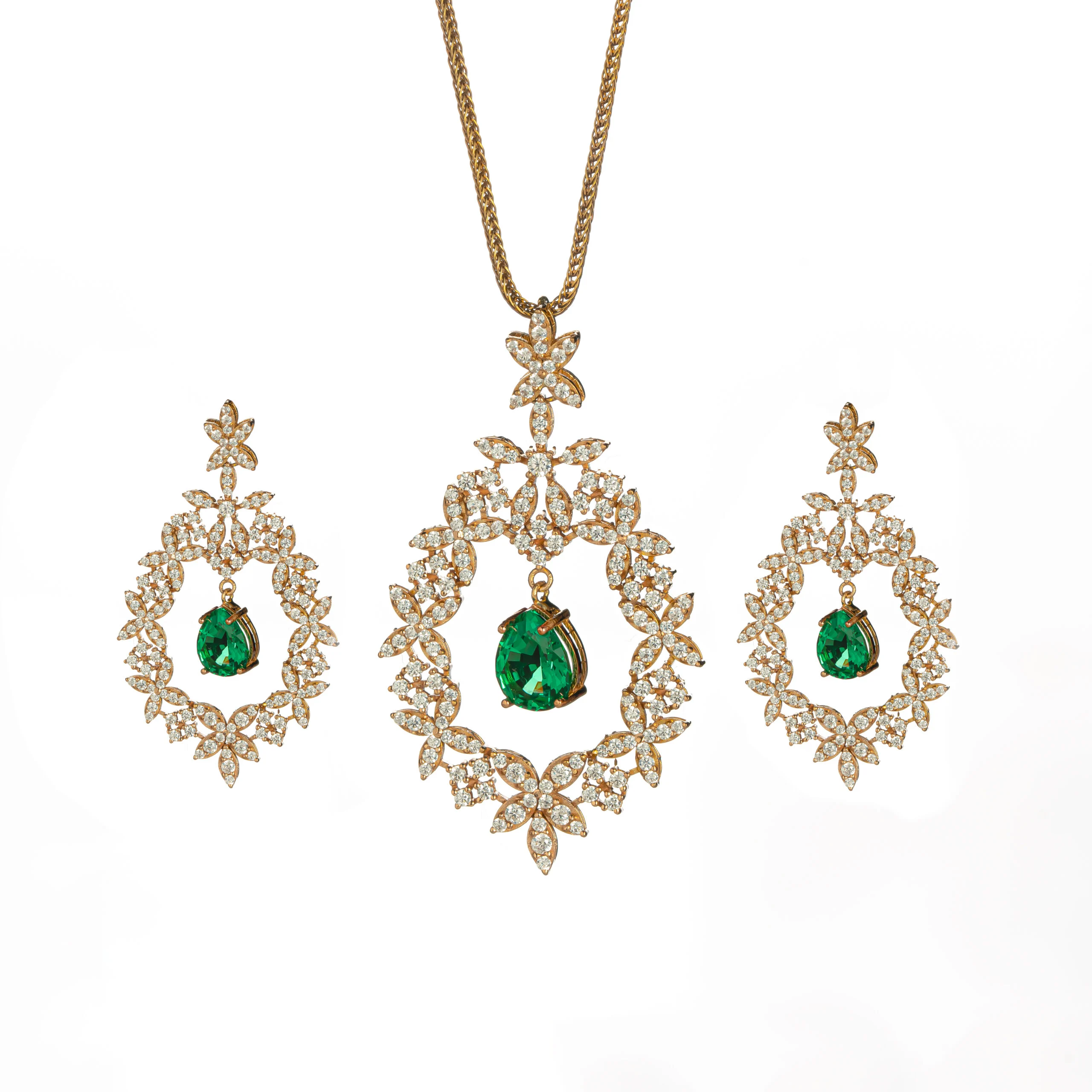 نیم ست برپایه جواهر ، با طراحی لوکس و فاخر، انتخابی بینظیر برای خانمهایی است که به دنبال درخشش و زیبایی منحصر به فرد هستند. این نیمست بر پایه جواهر شامل یک گردنبند و یک جفت گوشواره آویز است که با الهام از اشکال برگی و مواج و طرح خوشه گل، زیبایی طبیعت را به نمایش میگذارد. نگین های طرح زمردی اشکی با رنگ سبز خیرهکننده، در میان نگین های اتمی درخشان قرار گرفتهاند که جلوهای سلطنتی به این سرویس بخشیدهاند.