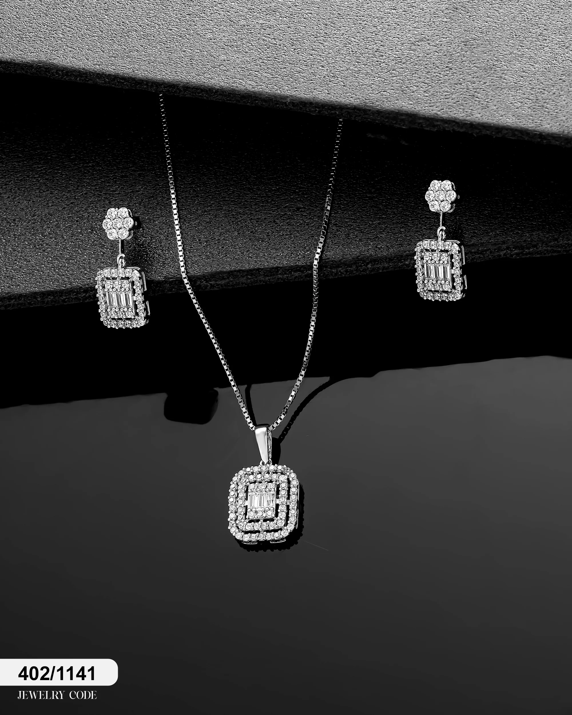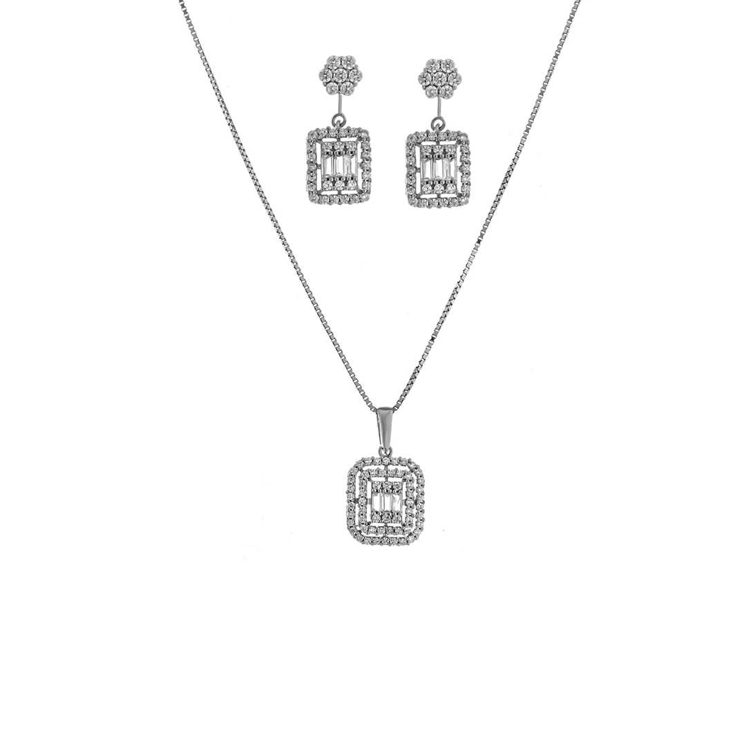 با این نیمست بر پایه جواهر لوکس، درخشش و ظرافت را به استایل خود اضافه کنید. این سرویس خیرهکننده شامل یک گردنبند و گوشواره با طراحی کلاسیک و شیک است که برای هر مراسم خاصی از جمله عروسیها و مهمانیهای مجلسی، انتخابی ایدهآل است. ظرافت بینظیر این زیورآلات با طلای سفید با نگین های درخشان اتمی و تراشهای دقیق، حسی از تجمل و شکوه را منتقل میکند. این ست عروس یا جواهرات مجلسی با طراحی مربعی و برش امرالد، توجه هر بینندهای را به خود جلب میکند و شما را در کانون توجه قرار میدهد.