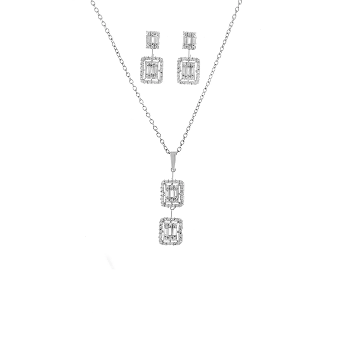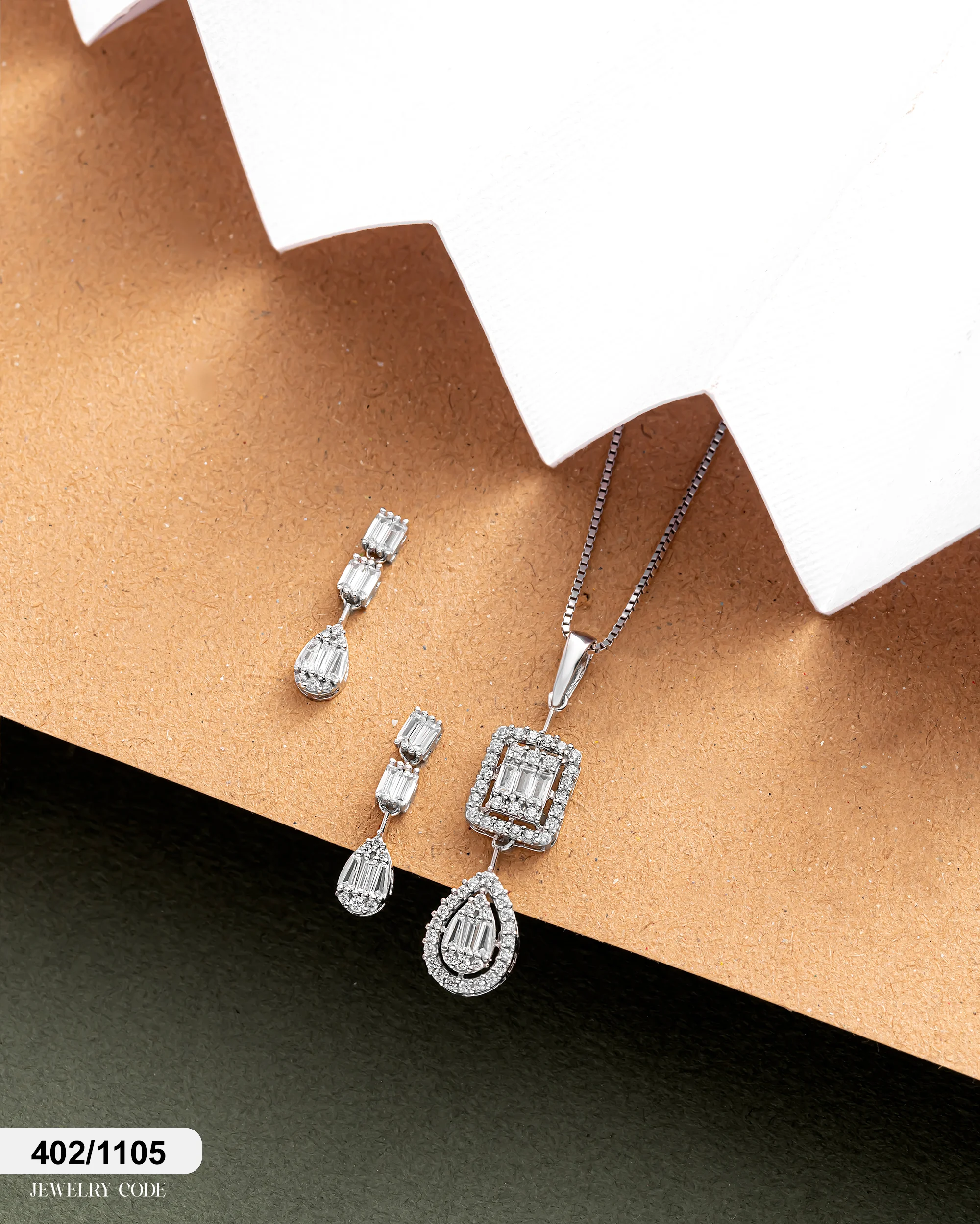 ​این نیم‌ست بر پایه جواهر مجلسی با طراحی منحصر به فرد و خیره‌کننده، انتخابی ایده‌آل برای درخشش شما در مهمانی‌ها و مراسم خاص است. ترکیب نگین‌های باگت و نگین اتمی درخشان در این سرویس جواهر عروس، جلوه‌ای بی‌نظیر از زیبایی و ظرافت را به نمایش می‌گذارد.  طراحی گردنبند و گوشواره آویز با جزئیات دقیق، این نیم‌ست را به یک جواهر فاخر تبدیل کرده که همزمان حس طراحی کلاسیک مدرن را القا می‌کند.