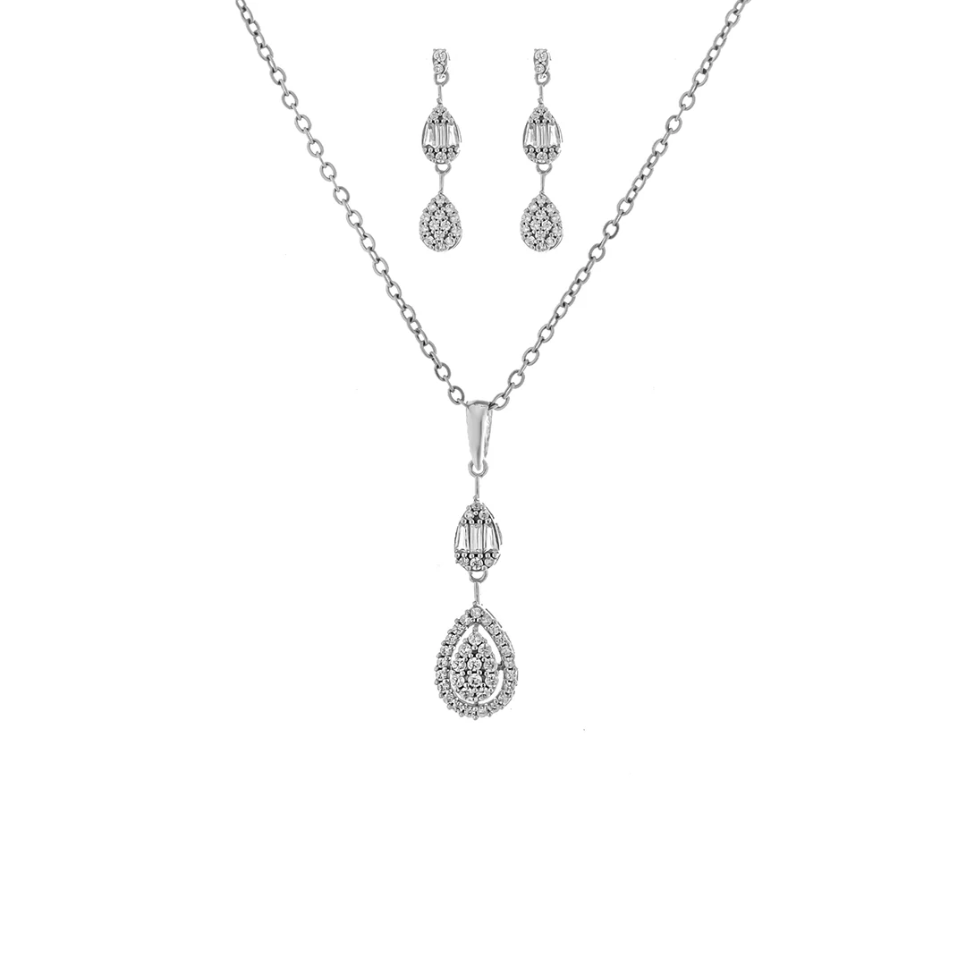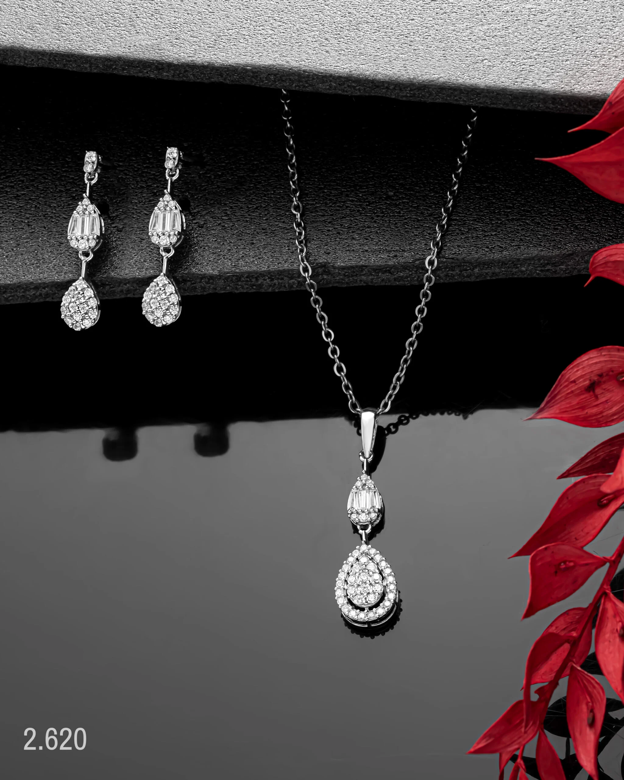 نیم ست بر پایه جواهر طراحی قطرهای اشکی و درخشش نگین اتمی ، انتخابی بینظیر برای خانمهایی است که به دنبال زیورآلات شب خاص و اکسسوری لاکچری عروسی هستند. این جواهرآلات طرح اشک با مدل مینیمال درخشان، هدیه لوکس زنانهای ایدهآل برای مناسبتهای خاص است. این ست مجلسی آویز و گوشواره با جزئیات دقیق و جواهرات زنجیرهای ظریف، شکوه و زیبایی را به استایل شما میافزاید.