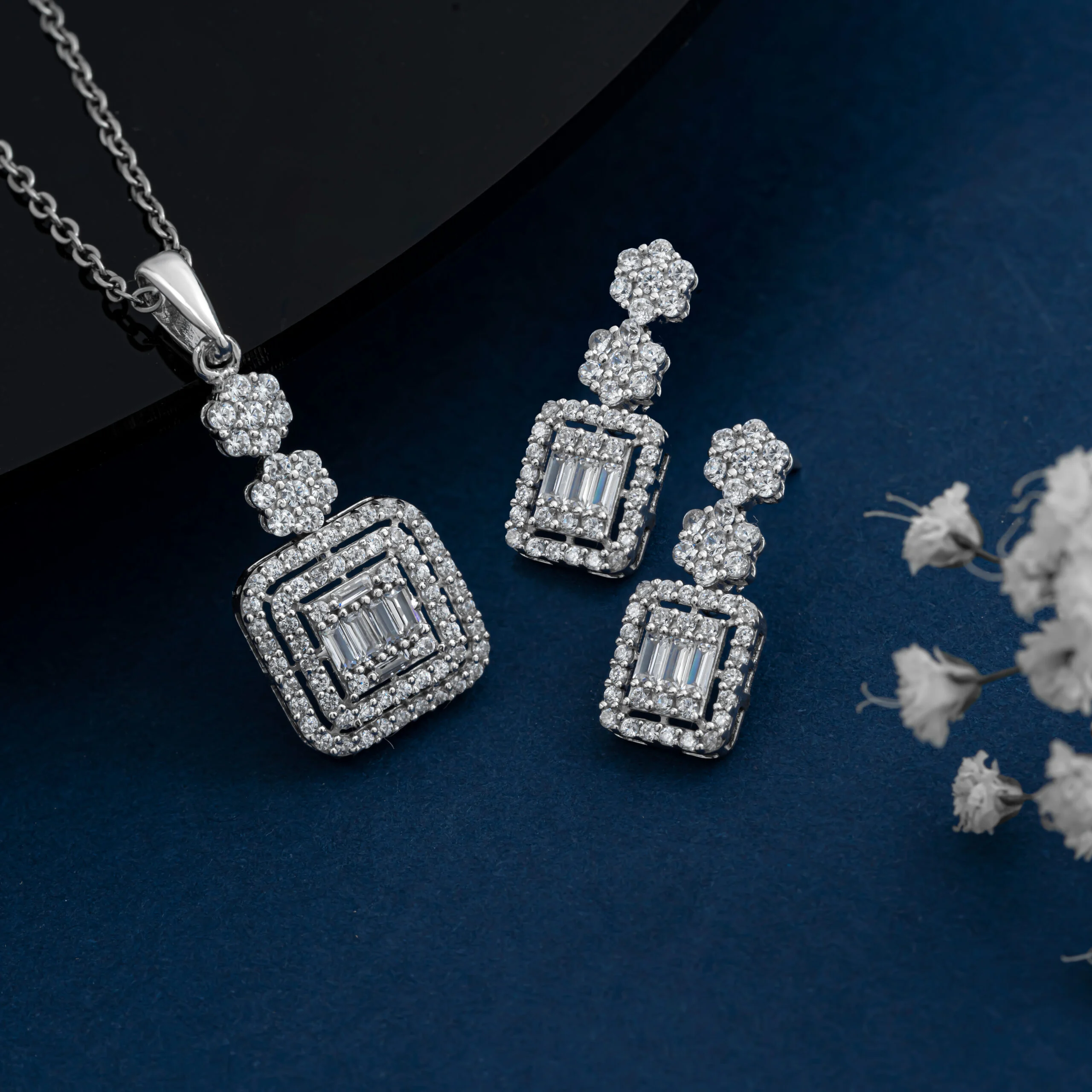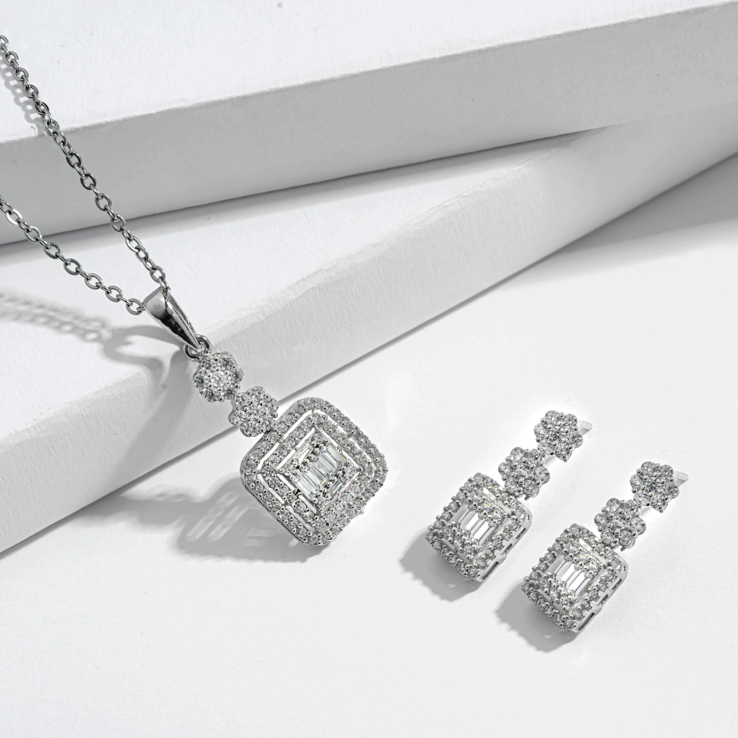 این نیمست بر پایه جواهر با طراحی آرت دکو و هندسی وینتیج، انتخابی شیک و لوکس برای استایل شما است. این سرویس که شامل آویز و گوشواره مربعی شکل است، با نگینهای اتمی درخشان و تراش باگت طراحی شده و طرح هالهای الماس گونه آن جلوهای بینظیر ایجاد میکند. این اکسسوری نفیس برای مراسم رسمی و عروسی بسیار مناسب است.