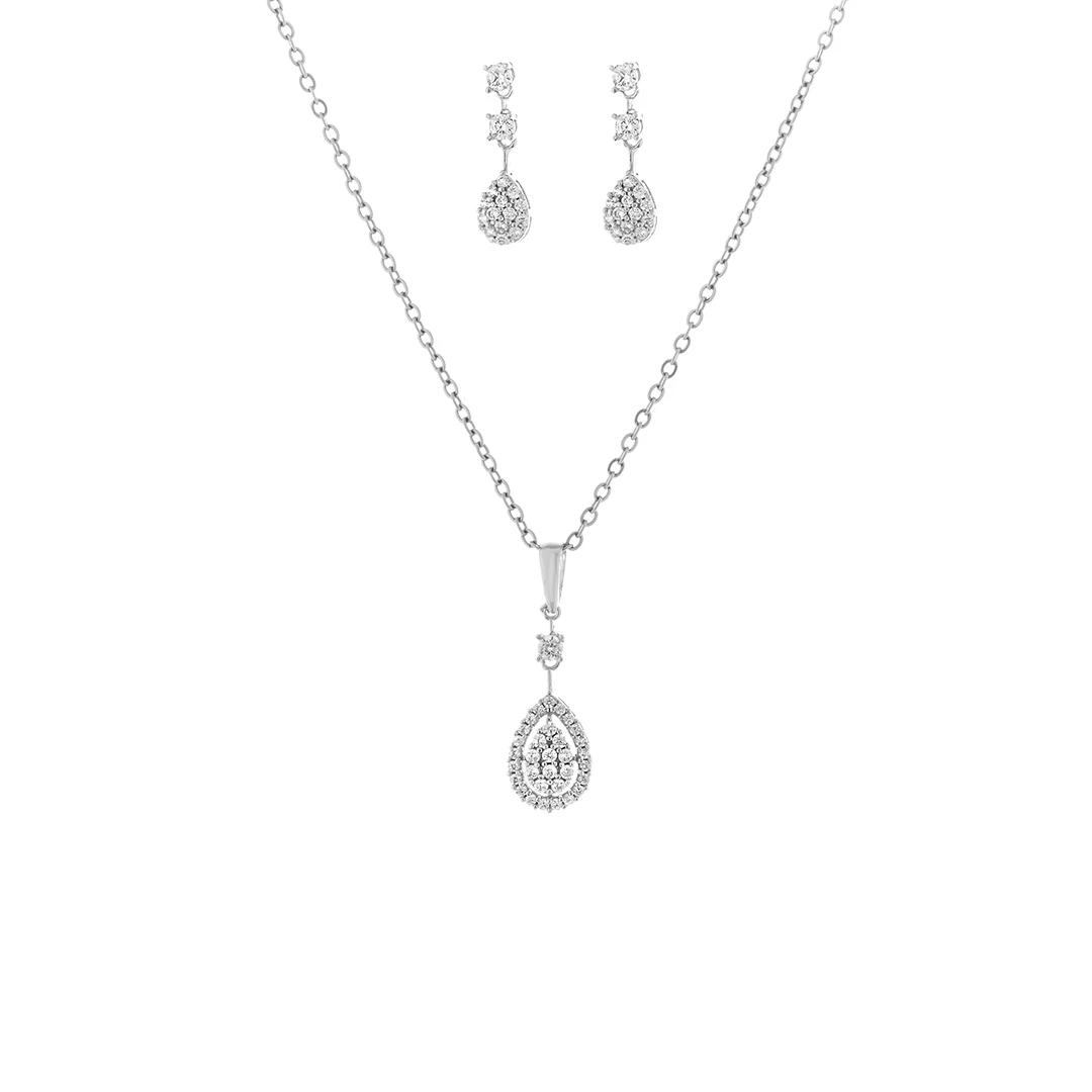 این نیم‌ست بر پایه جواهر با طراحی مینیمال و چشم‌نواز خود، نمادی از زیبایی و ظرافت است. گردنبند و گوشواره‌های این مجموعه با نگین اشک خیره‌کننده‌شان، درخشش بی‌نظیر الماس را به نمایش می‌گذارند. هر قطعه از این زیورآلات لوکس، با دقت و ظرافت تمام ساخته شده تا در هر لحظه، جلوه‌ای از استایل کلاسیک و مدرن را به شما ببخشد. این سرویس جواهر بی‌نظیر، انتخابی ایده‌آل برای مراسم عروسی یا یک هدیه خاص و به‌یادماندنی است. با این مجموعه، درخشش ابدی را در زندگی خود لمس کنید.