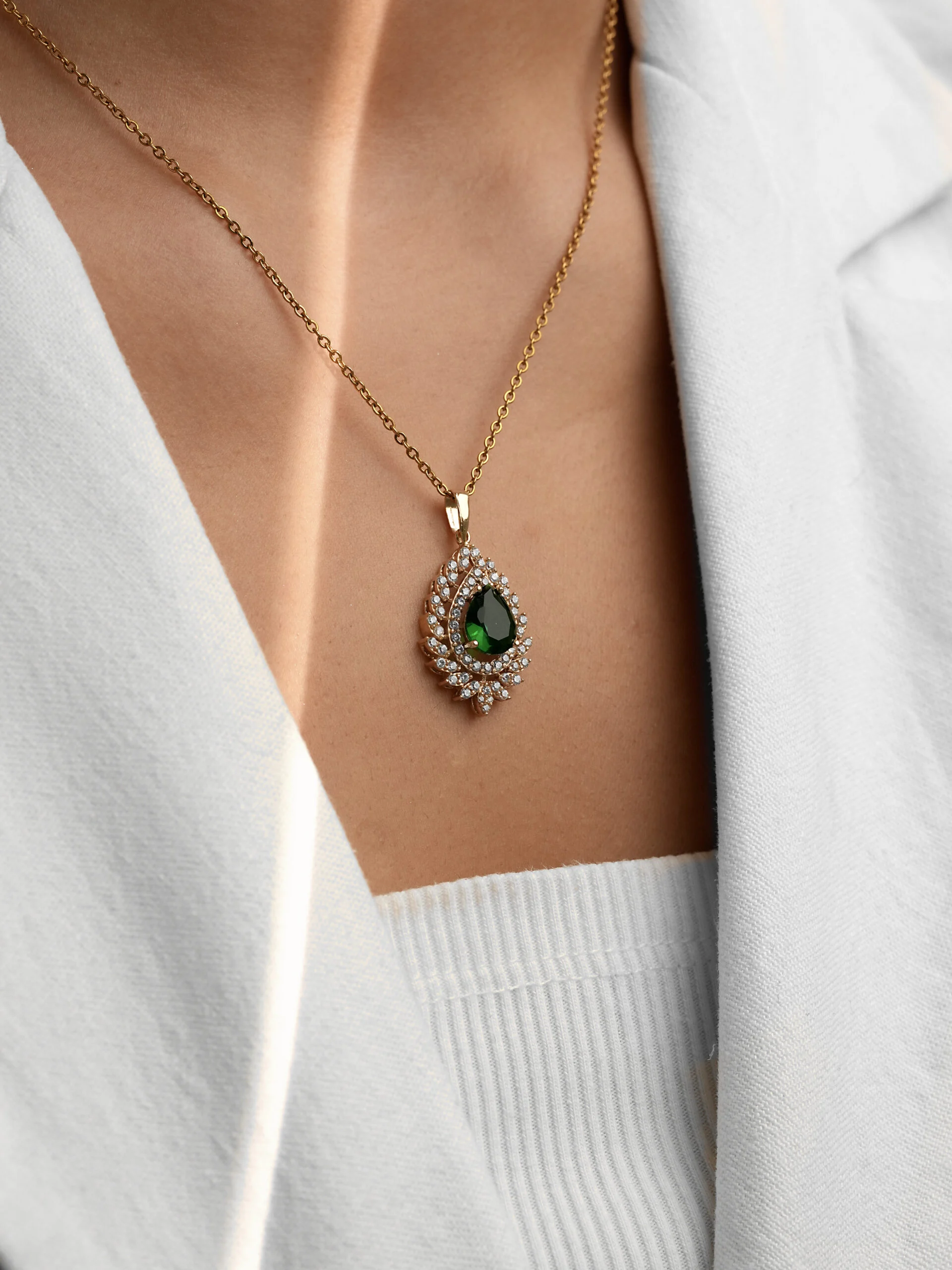 گردنبند آویزدار دورنگین اتمی با یک نگین اشکی طرح سبز زمردی درخشان، قلب تپنده این مجموعه است که با ظرافت در میان هالهای از نگینهای سفید اتمی قرار گرفته است. طراحی قطرهاشکی نمادی از زیبایی کلاسیک است که هیچگاه از مد نمیافتد. تکمیلکننده این مجموعه، گوشواره میخی کوچک نگین سبز است که به سادگی و ظرافت روی گوش مینشیند و درخششی هماهنگ با آویز ایجاد میکند. اگر به دنبال یک هدیه زنانه لاکچری نگین اتمی یا یک اکسسوری زنانه لوکس و مینیمال برای درخشش در مجالس هستید، این نیمست جواهرنما باوقار بهترین انتخاب شماست. تکنیک ساخت سه بعدی تضمینکننده ظرافت، جزئیات دقیق و ساختاری مستحکم برای سالها زیبایی است.