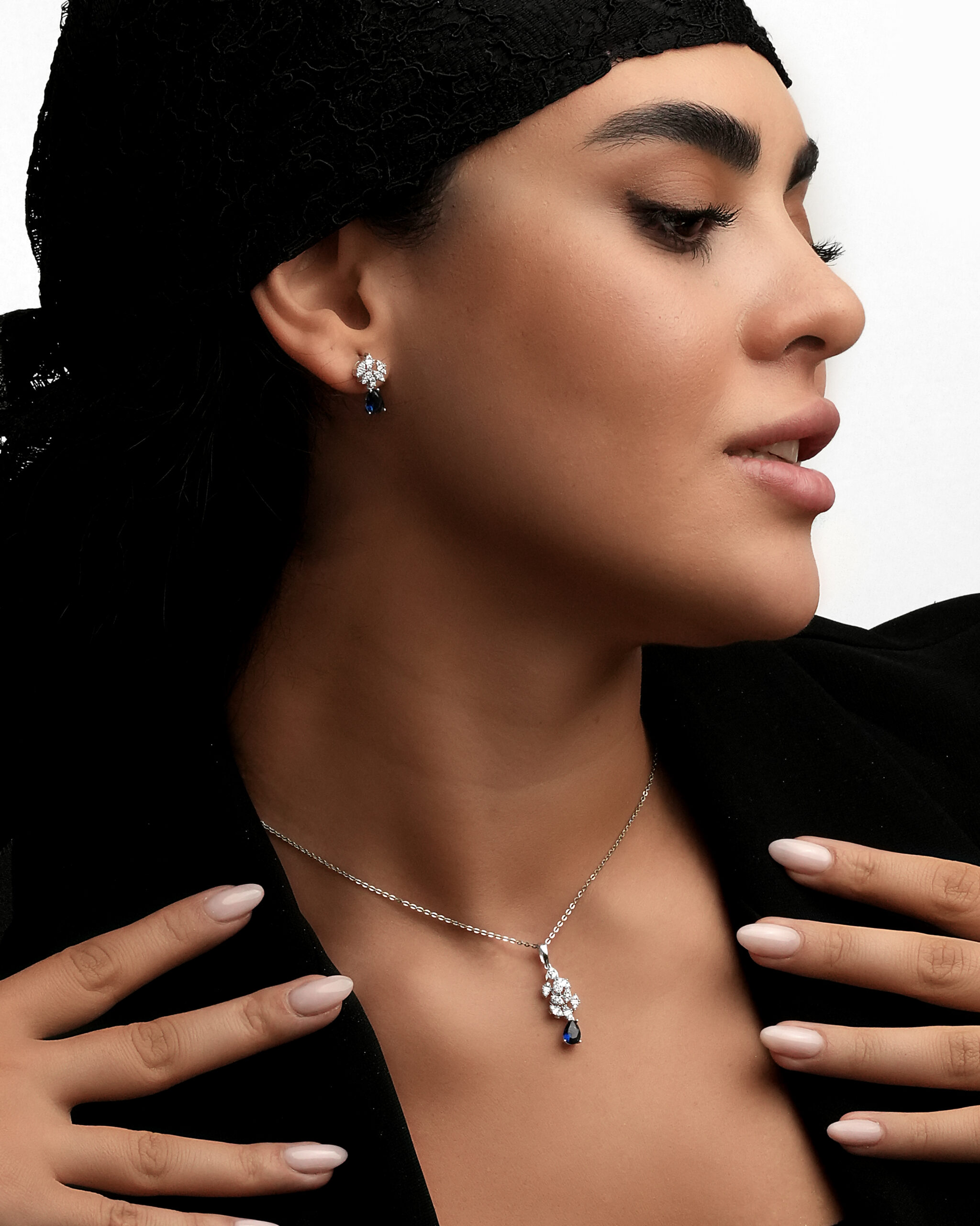 این نیم ست سه بعدی طلا سفید بر پایه جواهر ، ترکیبی بینظیر از هنر طراحی و ظرافت است که جلوهای جواهری لوکس را به استایل شما میبخشد. آویز خوشهای بر پایه جواهر نگین اتمی با طراحی الهام گرفته از نقوش طبیعت، زیبایی چشمنواز یک خوشه تاک را تداعی میکند. در مرکز این آویز، یک نگین آویز اشک آبی (طرح یاقوت کبود) با تراش خاص، جلوهای خاص و ست رنگین (سفید و آبی) ایجاد کرده است.گوشواره ظریف نگین اتمی با طراحی متناسب و کلیپسی، مکمل ایدهآل آویز بوده و در کنار آن، زیبایی چهره شما را دوچندان میکند. با توجه به استفاده از نگین اتمی بر پایه جواهر، این نیم ست برای استایل شب مجلسی و تبدیل شدن به یک زیورآلات لاکچری یا ست عروس شیک، انتخابی بیرقیب است. این محصول با طراحی سه بعدی طلا سفید و سطح سفید نگینکاری شده، یک اکسسوری زنانه مدرن و یک هدیه تولد خاص و ماندگار محسوب میشود. درخشندگی و کیفیت ساخت بالا، تضمینکننده جذابیت اشرافی شما در هر محفلی خواهد بود.