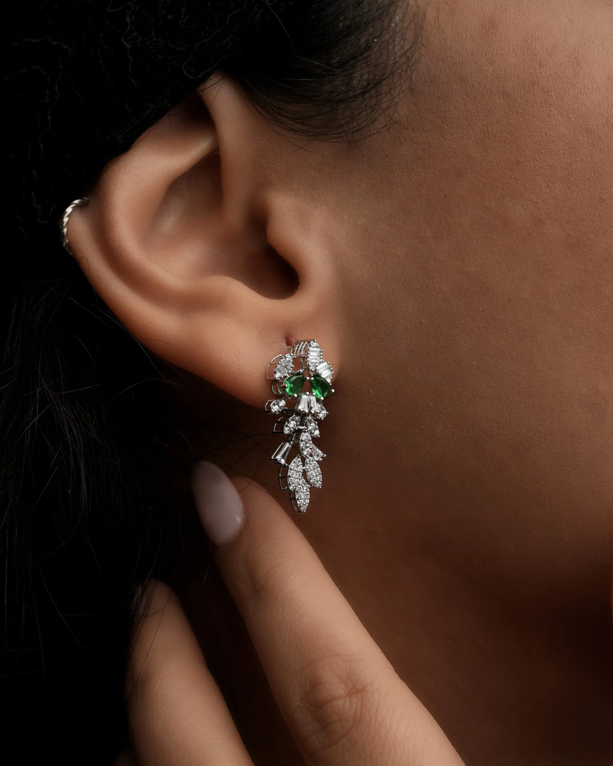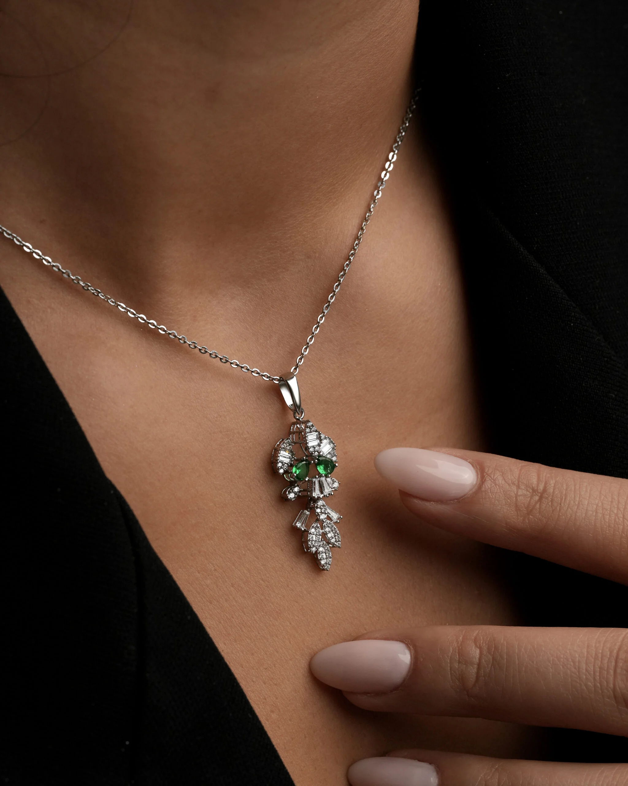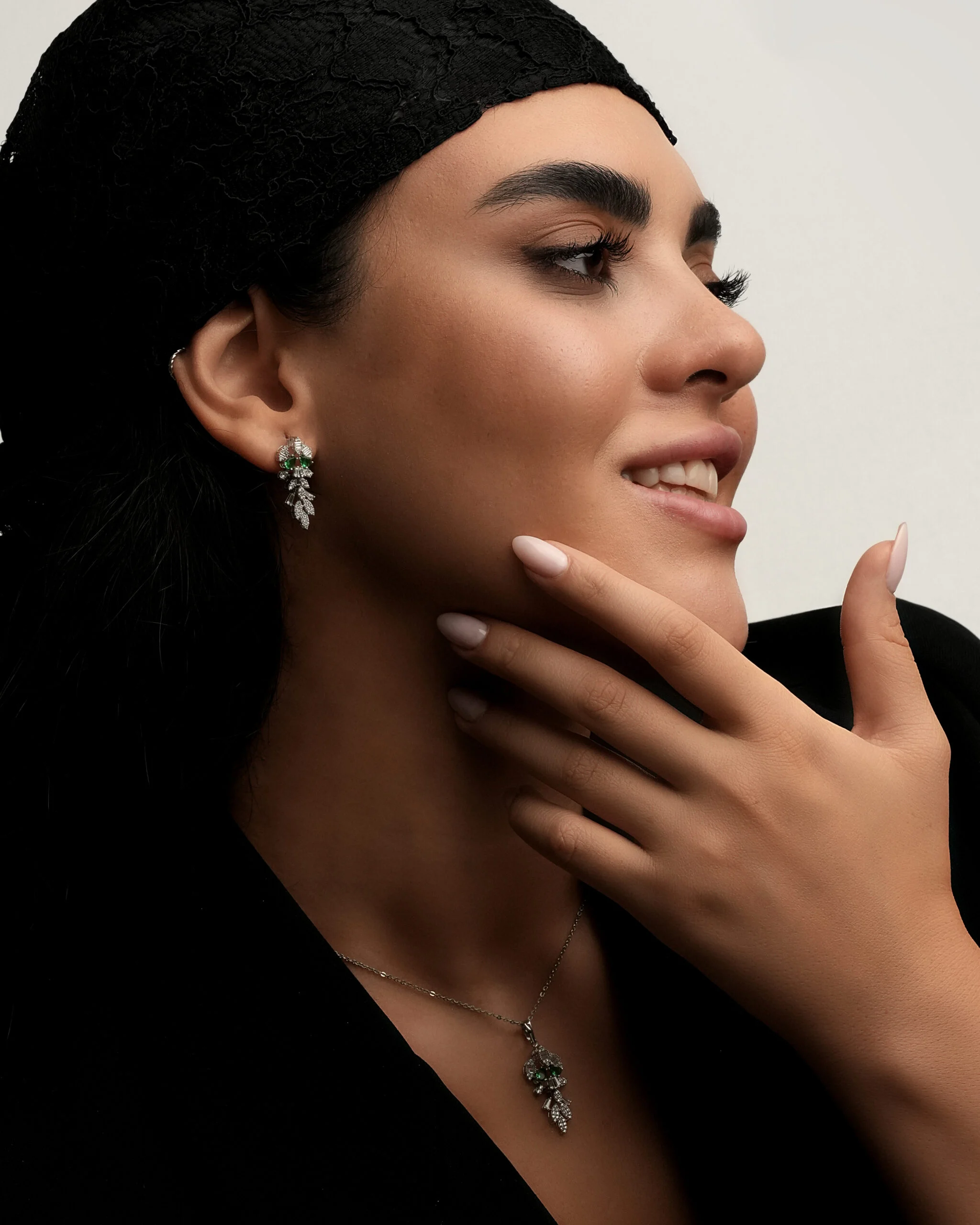این نیم‌ست بر پایه جواهر با طراحی انگور و تاک، یک اثر هنری سه‌بعدی طلا سفید است که نقش و نگار طبیعت مینیاتوری را به زیبایی تمام به نمایش می‌گذارد. این مجموعه که شامل یک آویز و گوشواره آبشاری است، از ظرافتی بی‌نظیر برخوردار است و تجسمی لوکس از جواهرات شاخه‌ای ظریف به شمار می‌آید.​در قلب این نیم‌ست، طرح سبز زمردی با درخشش نگین‌های اتمی رنگ ثابت، جلوه‌ای چشم‌نواز خلق کرده است. ترکیب جواهر لوکس با نگین سفید و سبز، در کنار بدنه طلا سفید ، آن را به یک اکسسوری باوقار و کلاسیک تبدیل می‌کند. این ست مجلل ظرافت فرانسوی نه تنها یک انتخاب عالی برای جواهرات خاص و زنانه شیک است، بلکه به واسطه کیفیت و طراحی متمایز، یک هدیه لاکچری و ماندگار محسوب می‌شود. با این نیم‌ست، استایلی در حد زیورآلات سلبریتی استایل را تجربه کنید و برای جواهرت مناسب عروسی و نامزدی بدرخشید. طراحی فنی و مستحکم این محصول، تضمین کننده طول عمر و درخشش دائمی آن است.