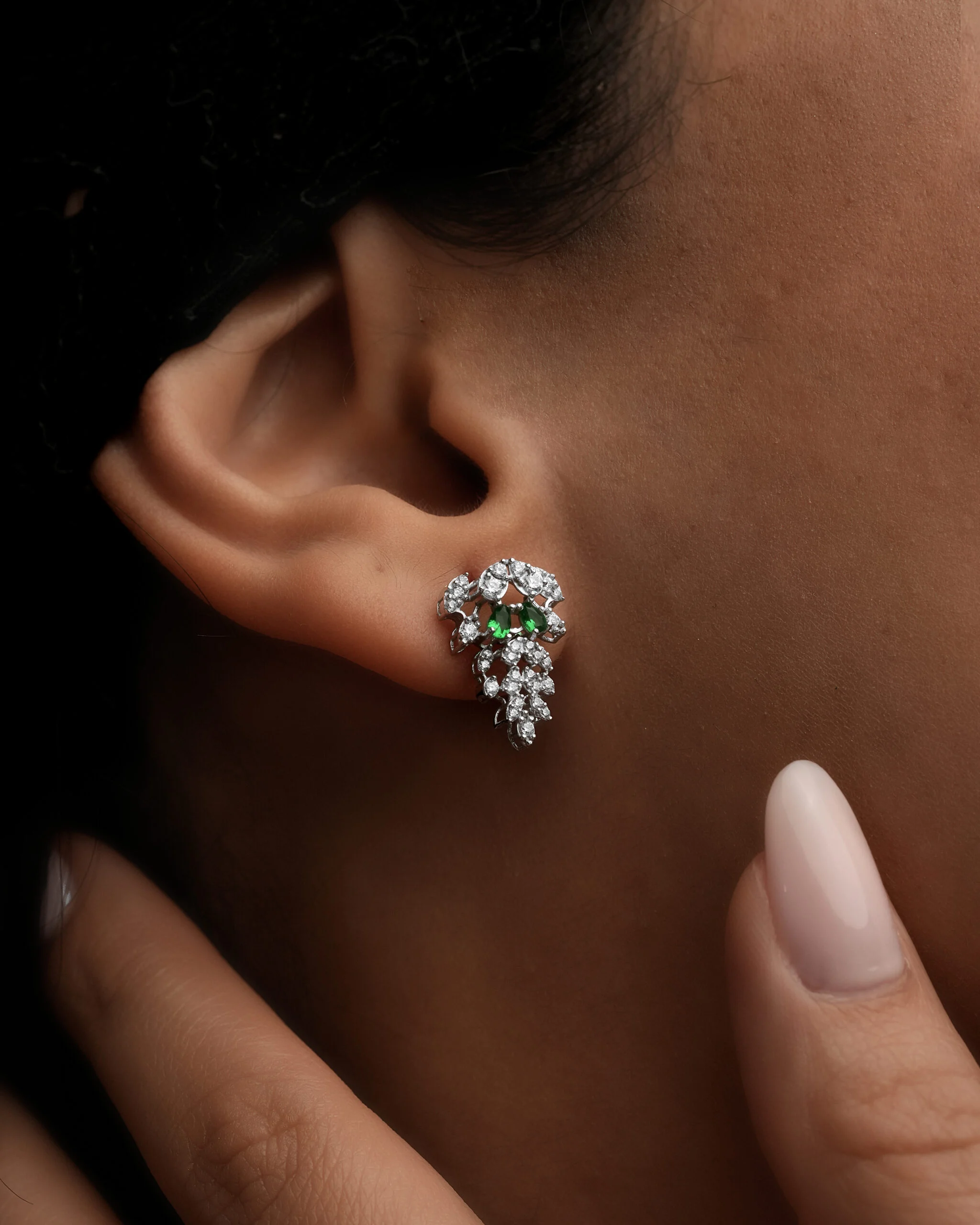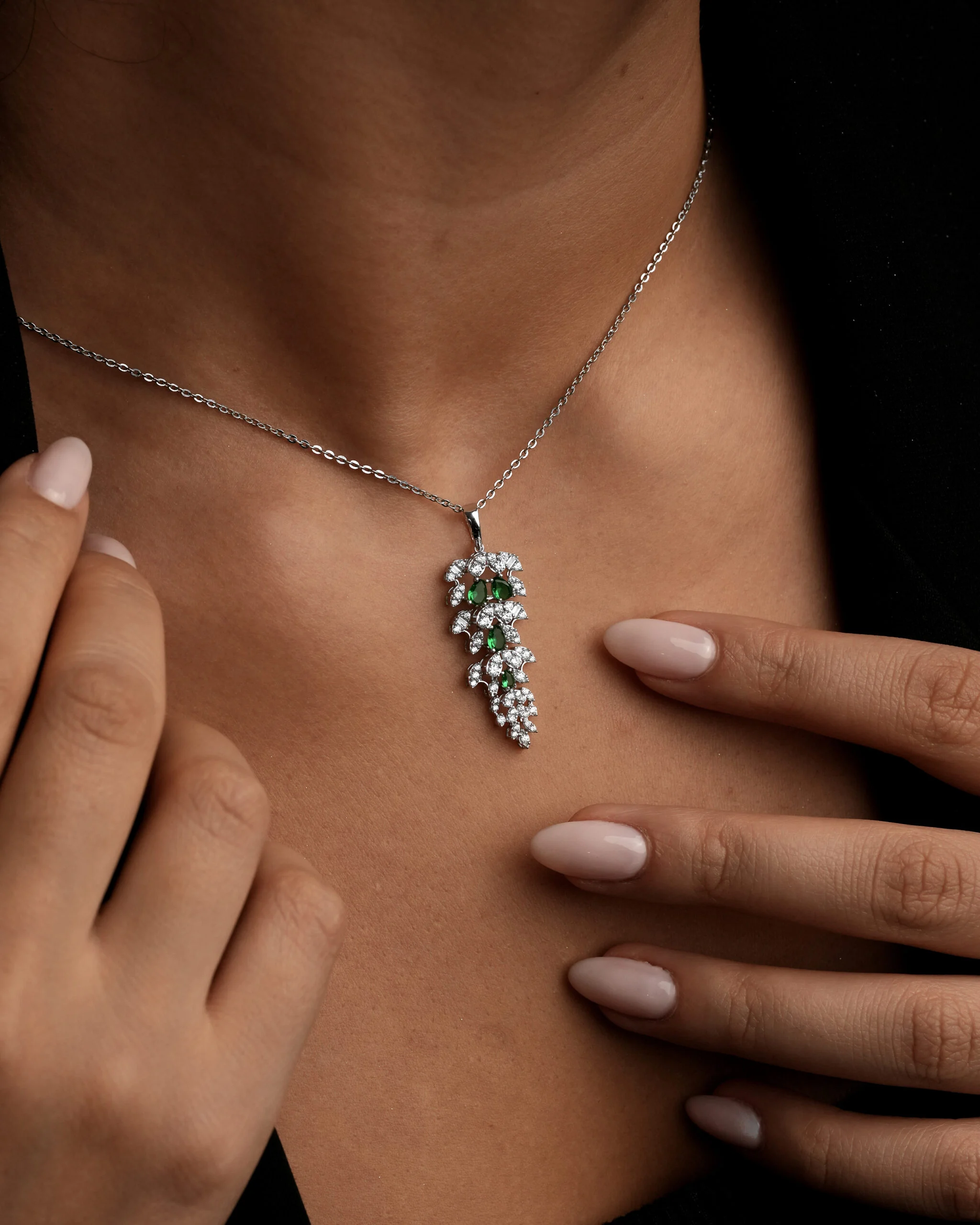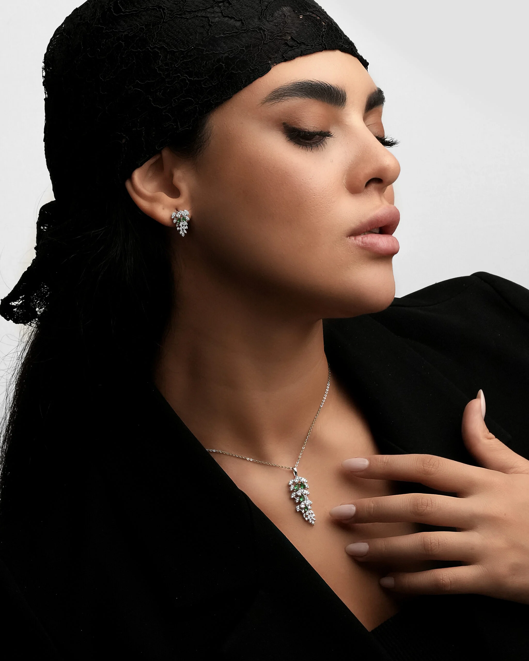 این محصول خیرهکننده، این شاهکار طراحی سهبعدی بر پایه جواهری است که نهایت ظرافت و لوکس بودن را به نمایش میگذارد. ست بر پایه جواهری مجلسی ظریف ما شامل یک گردنبند آویزی خوشهای شیک و یک جفت گوشواره میخی طرح برگ و خوشه است که با الهام مستقیم از زیباییهای طبیعت طراحی شدهاند.این نیم ست بر پایه جواهری با دقت بینظیری از طلا سفید ساخته شده و سطح آن با دو نوع نگین اتمی پوشانده شده است: خوشههای نگین سبز درخشان و نگینهای اتمی سفید که تداعیکننده قطره شبنم و در مجموع جلوهای از یک آبشار نگین اتمی را خلق میکنند. با این زیورآلات لوکس نگین سبز و نگین اتمی سفید، حضور شما در هر مجلسی، بهویژه برای یقه باز مجلسی، تفاوت چشمگیری خواهد داشت.این ست خوشه کریستالی اتمی، با هدف قرار گرفتن در دسته جواهرات ترند و خاص زنانه، برای بانوان سختپسندی طراحی شده است که به دنبال آویز مدرن با نگینهای رنگی (سبز-سفید) و درخشش لوکس نگین اتمی در مهمانیهای مجلسی شب هستند. این قطعات نه تنها یک ست جواهری الهام گرفته از طبیعت هستند، بلکه یک سرمایهگذاری در زیبایی بیزمان شما به شمار میآیند.