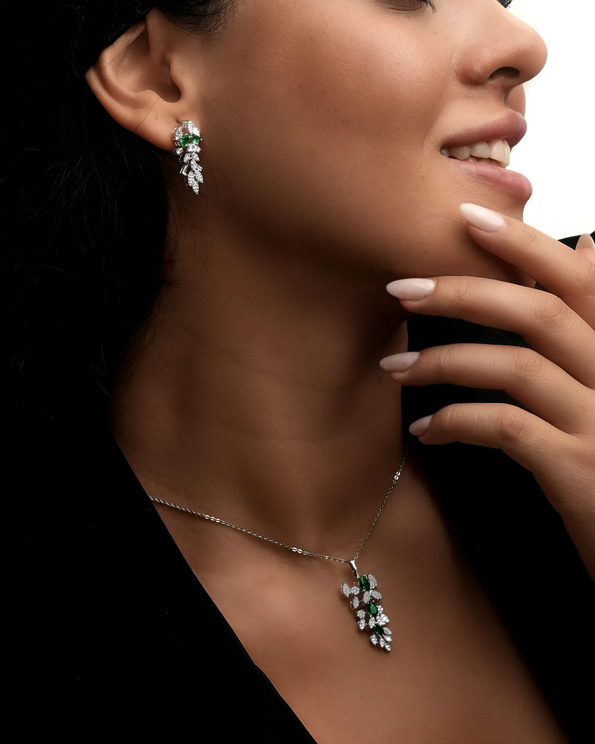 با معرفی نیم ست بر پایه جواهر مجلسی طرح آویز شاخهای، تجربهای نو از زیبایی و درخشش را به کلکسیون زیورآلات خود اضافه کنید. این ست آویز و گوشواره طلا سفید با الهام از طبیعت و طراحیهای جواهرات زنانه شیک و ظریف سبز زمردی، یک اثر هنری خیرهکننده است. طرح سهبعدی و آویزی این نیم ست، حرکت و پویایی خاصی را به ظاهر شما میبخشد.این نیم ست فانتزی نگیندار خاص با دقت بینظیری ساخته شده و از طلای سفید با عیار بالا بهره میبرد. درخشش بیمانند آن مدیون استفاده هوشمندانه از نگین اتمی مارکیز و نگینهای با برش ظریف است که در کنار نگین سبز رنگی با تم زمردی، ترکیبی لوکس و چشمنواز ایجاد کرده است. زیورآلات لوکس نگین اتمی مارکیز به کار رفته در این محصول، جلوهای از الماسهای درخشان را شبیهسازی میکند.این نیم ست مدل نیم ست ظریف شاخهای، انتخابی ایدهآل برای مجالس رسمی، عروسیها و مهمانیهای خاص است. گوشواره آویزی مجلسی آن به تنهایی میتواند نقطه تمرکز استایل شما باشد و همراهی آن با آویز گردنبند، طرح جواهری با طرح نگین زمردی را تکمیل میکند. این محصول برای کسانی که به دنبال نیم ست بر پایه جواهر مجلسی طرح آویز شاخهای با کیفیت بالا و طراحی منحصربهفرد هستند، بهترین گزینه است.