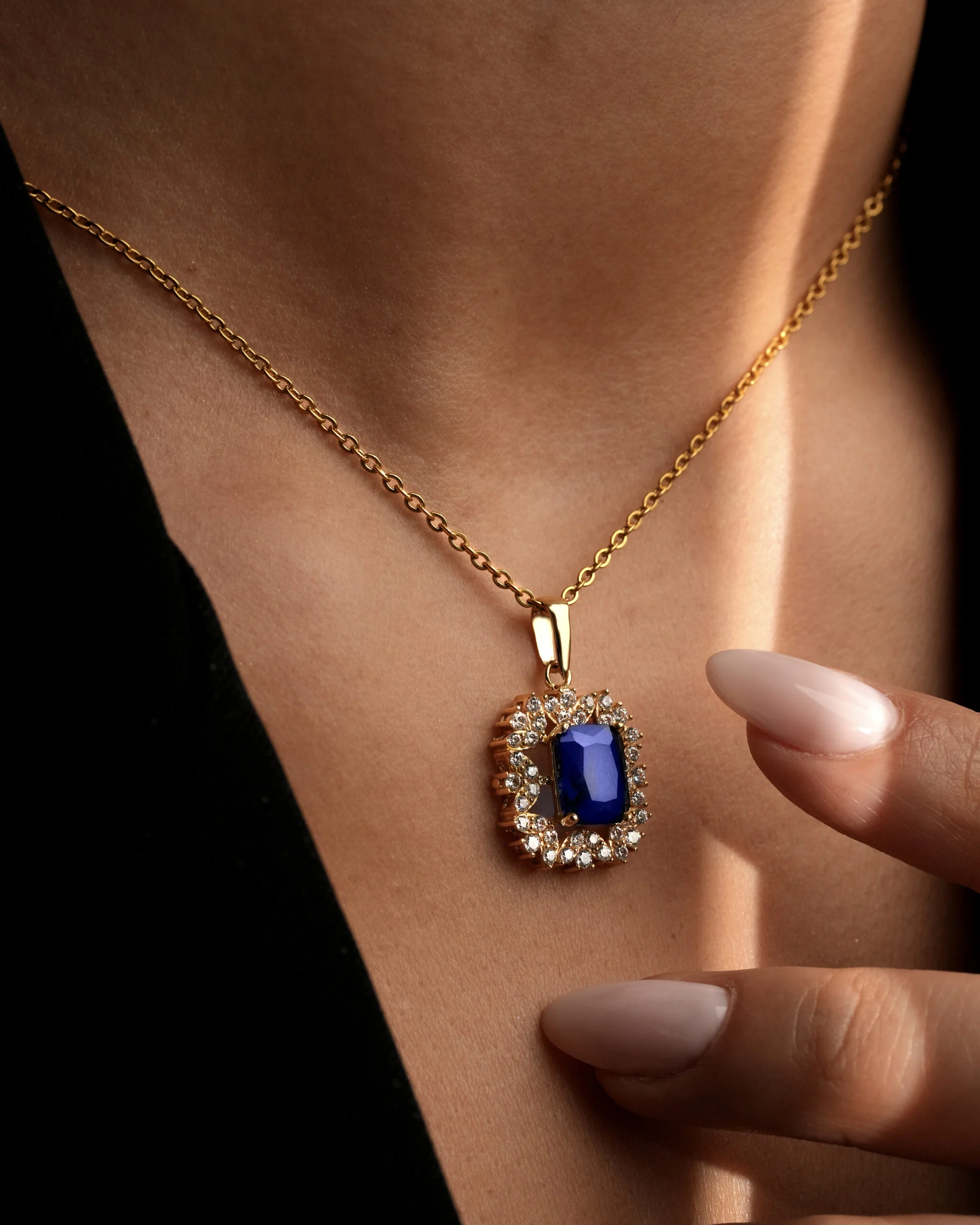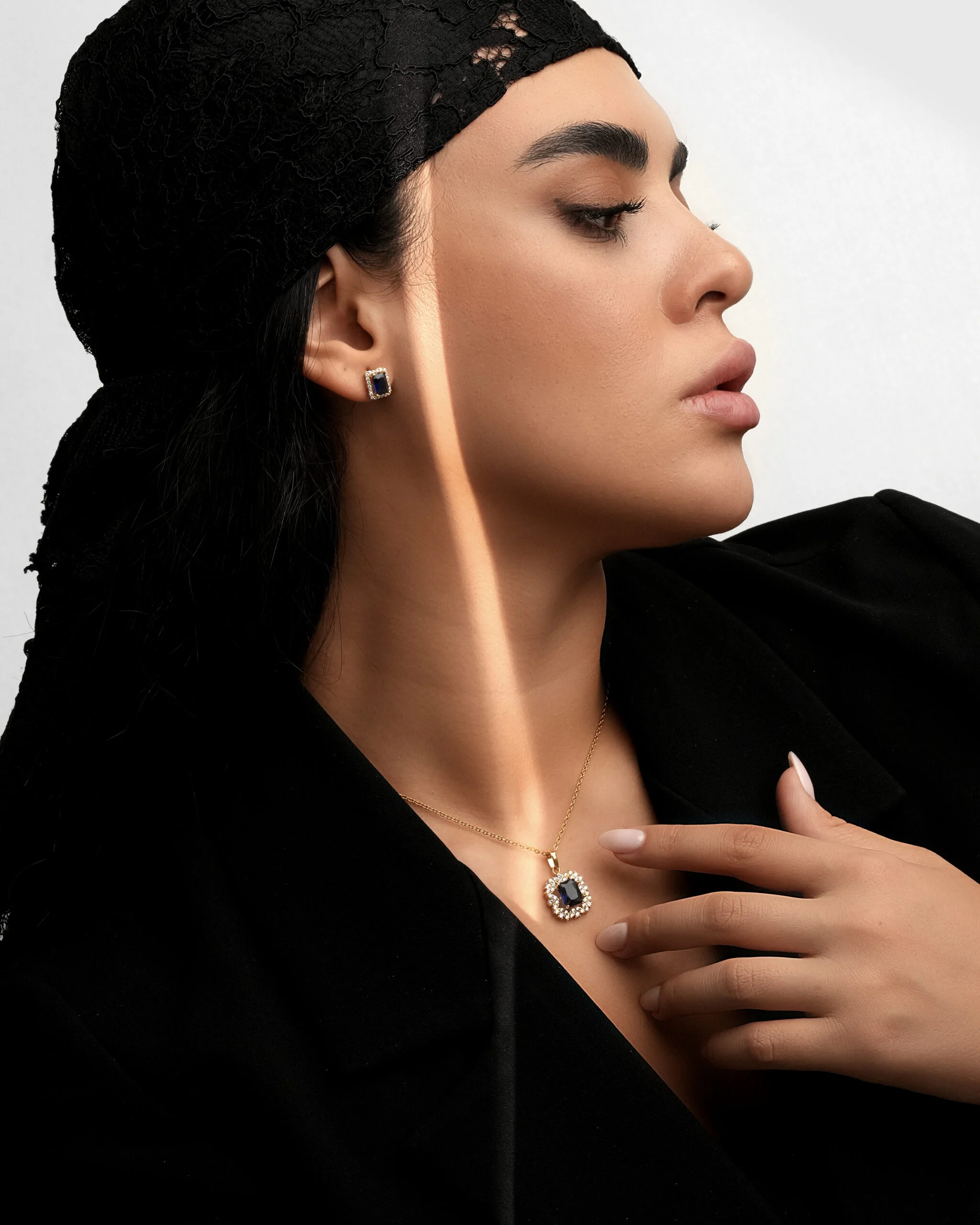 ین نیمست بر پایه جواهر شامل یک گردنبند نگین طرح یاقوت کبود و یک جفت گوشواره میخی است . پلاک اصلی به صورت یک پلاک مربع طراحی شده که نگین مرکزی آبی رنگ طرح یاقوت کبود توسط هالهای از نگینهای سفید اتمی احاطه شده است.این نیم ست شیک بانوان با طراحی فاخر خود، یک انتخاب برجسته در دسته جواهرات فاخر شب به شمار میرود. ساختار فنی و ظریف این قطعه، آن را به یک نیم ست مجلسی نگین اتمی تبدیل کرده که نه تنها برای مجالس رسمی، بلکه برای ارتقاء استایل روزمره نیز کاربرد دارد. وزن متوسط و استاندارد این نیمست، حس سبکی و راحتی را در عین حفظ جلوه لوکس، تضمین میکند.