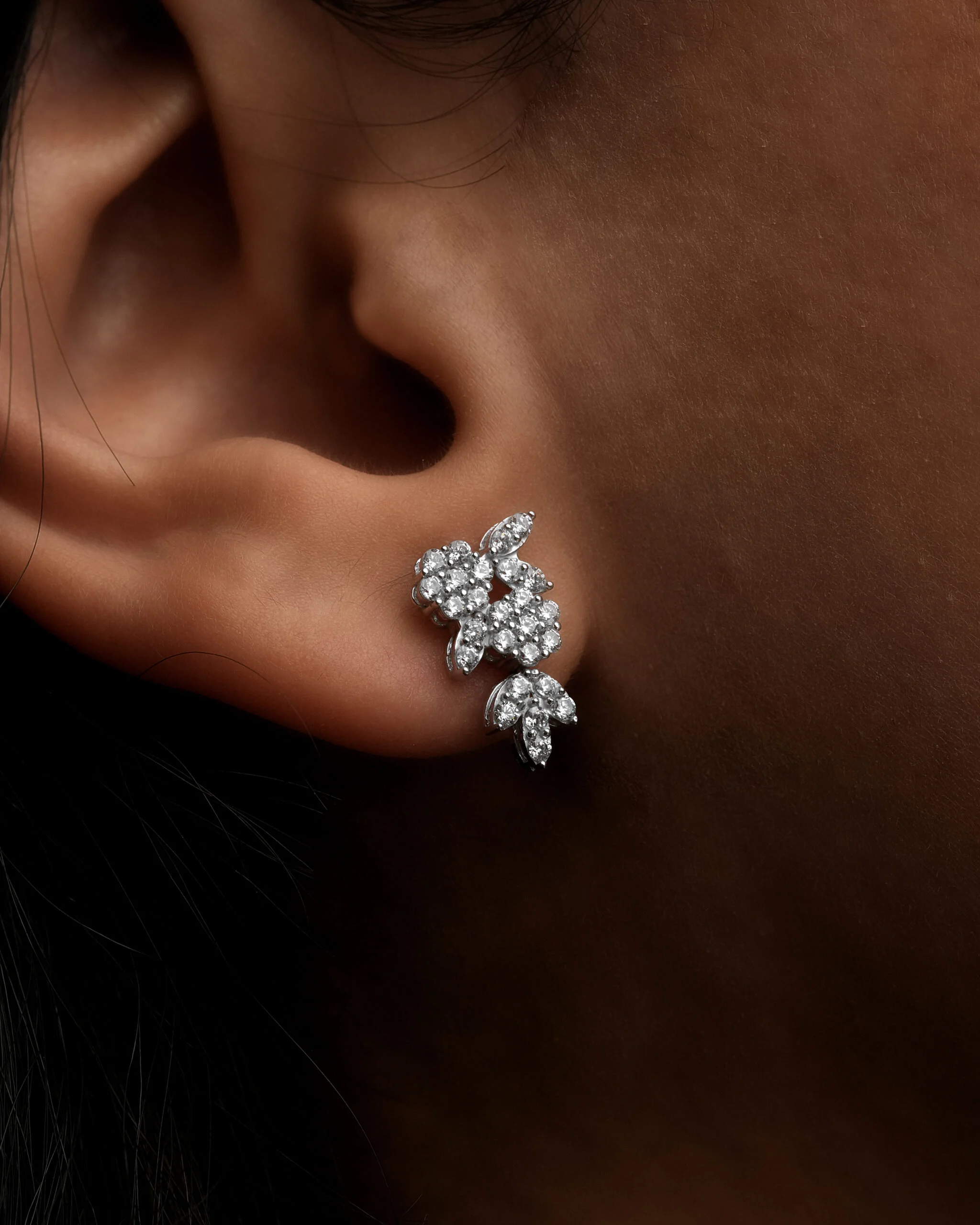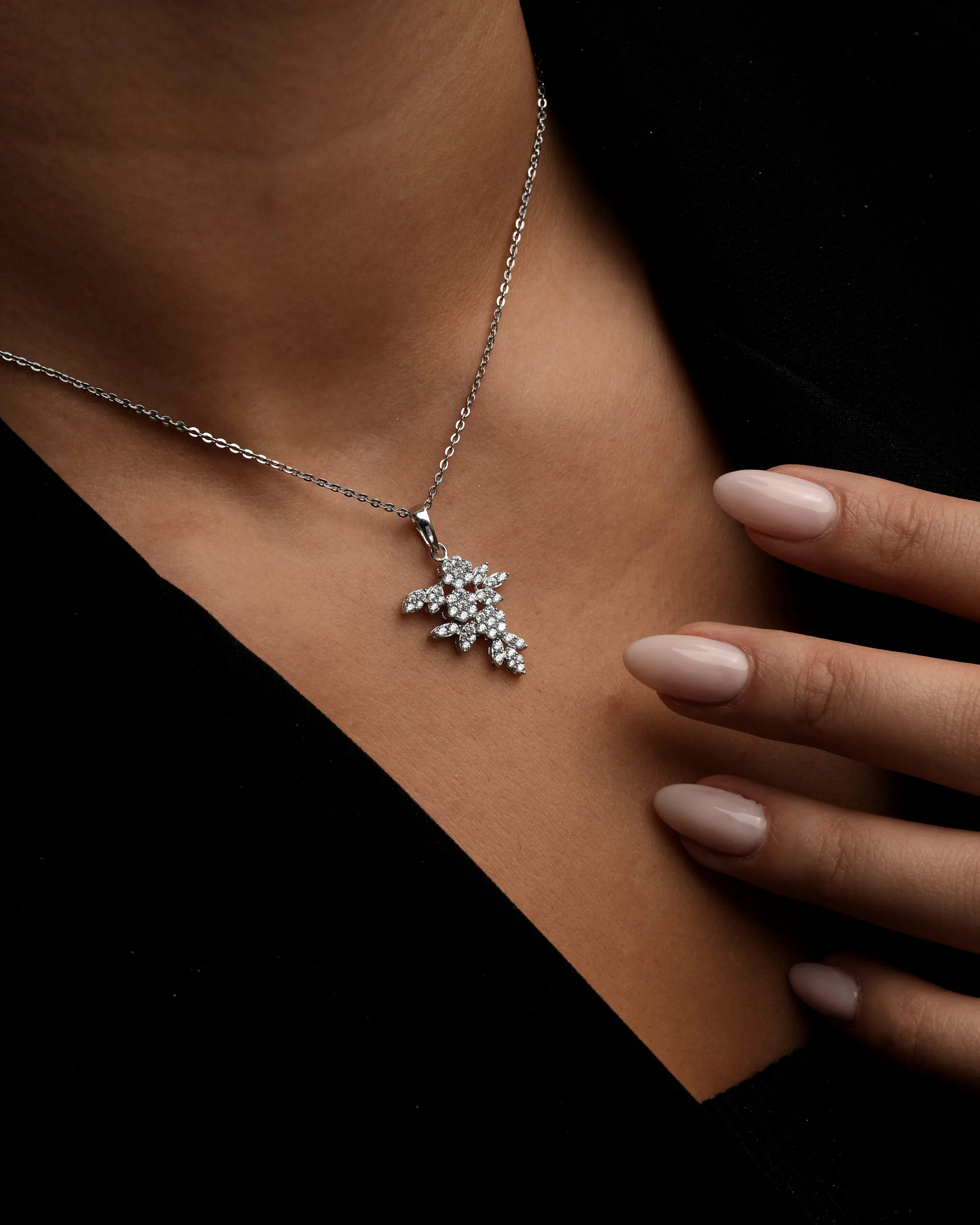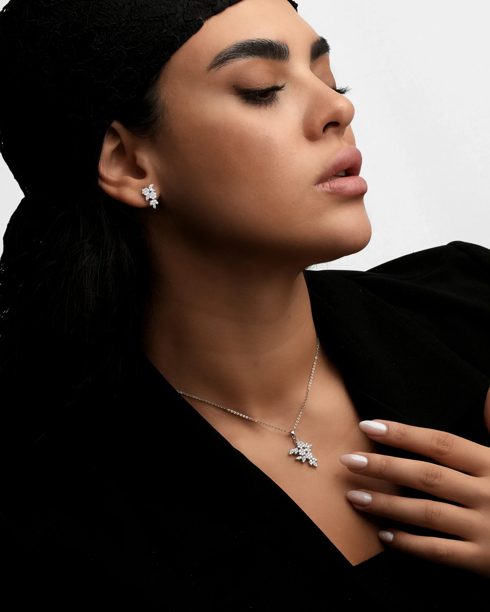 این نیم ست بر پایه جواهر طلا سفید، اوج ظرافت و درخشش مینیمال است که به طور تخصصی برای بانوان با سلیقهی خاص طراحی شده. طرح منحصر به فرد این مجموعه الهام گرفته از شکوفههای کریستالی یا طرح ‘گل و برگ است که با دقت فراوان، زیبایی طبیعت را به دنیای زیورآلات آورده است.پلاک خوشهای گردنبند، با آرایشی هنرمندانه از نگینهای اتمی درجه یک، درخشی خیرهکننده و مشابه الماسهای طبیعی ارائه میدهد. مکمل این گردنبند، گوشوارههای میخی گلریز هستند که به زیبایی روی لاله گوش مینشینند و فریم صورت را جلوهای لطیف میبخشند. این مدل مینیمال لوکس انتخابی ایدهآل برای تکمیل استایلهای رسمی، مجلسی و حتی روزانه با حسی از تجمل است.